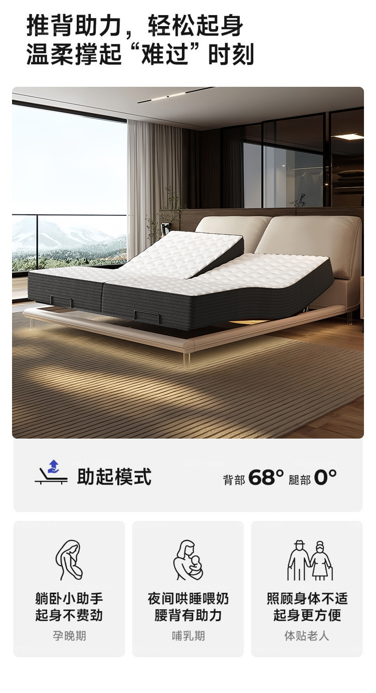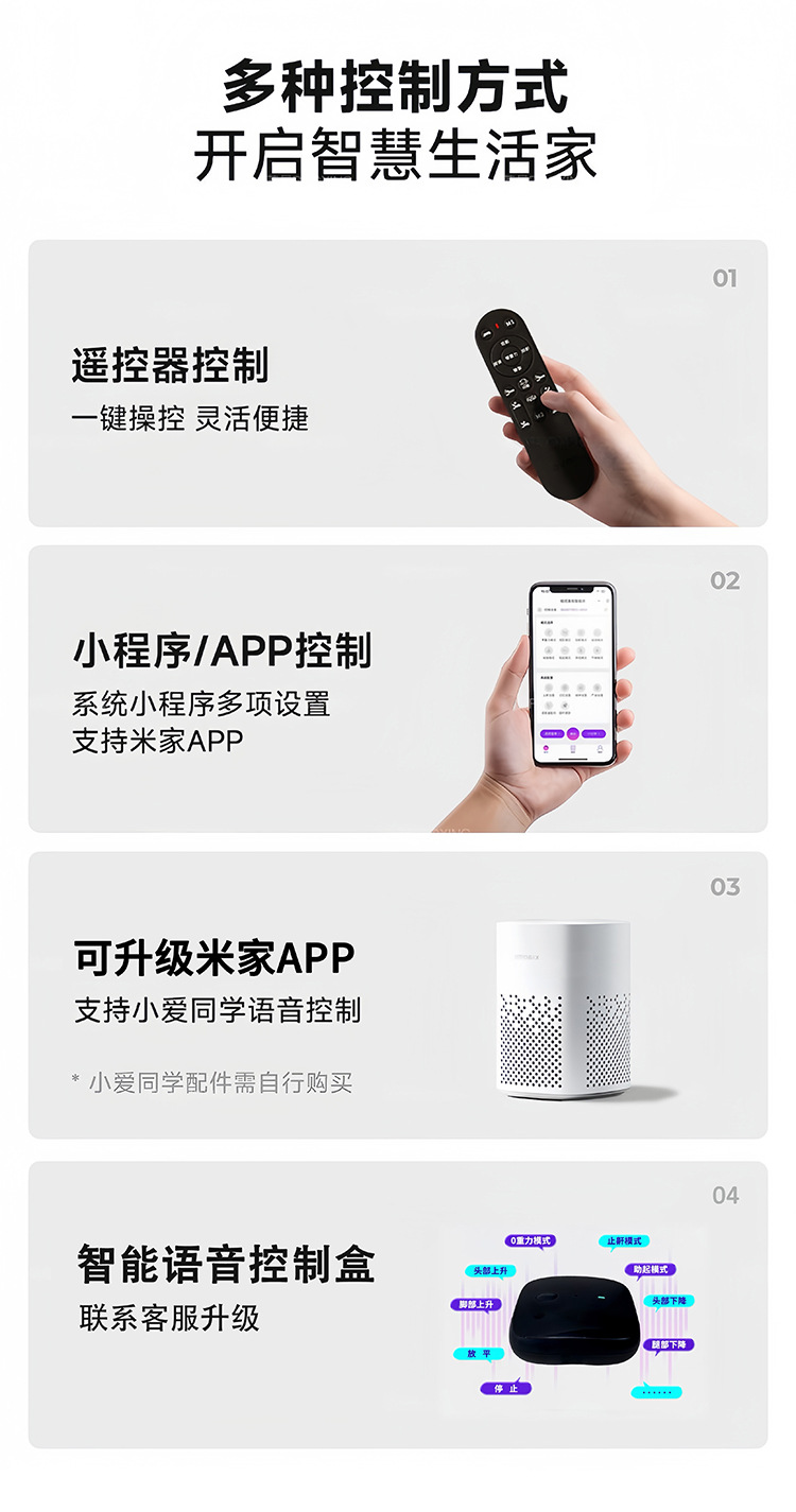 • 가죽 침대 + OKIN 4모터 + Ai 천변 매트리스 + 음성 + 코골이 방지 + 마사지 + 수면 유도 + 기상 + 수면 모니터링 + 미지아 연동