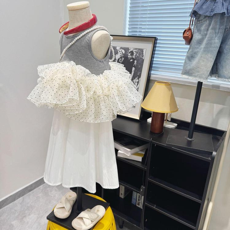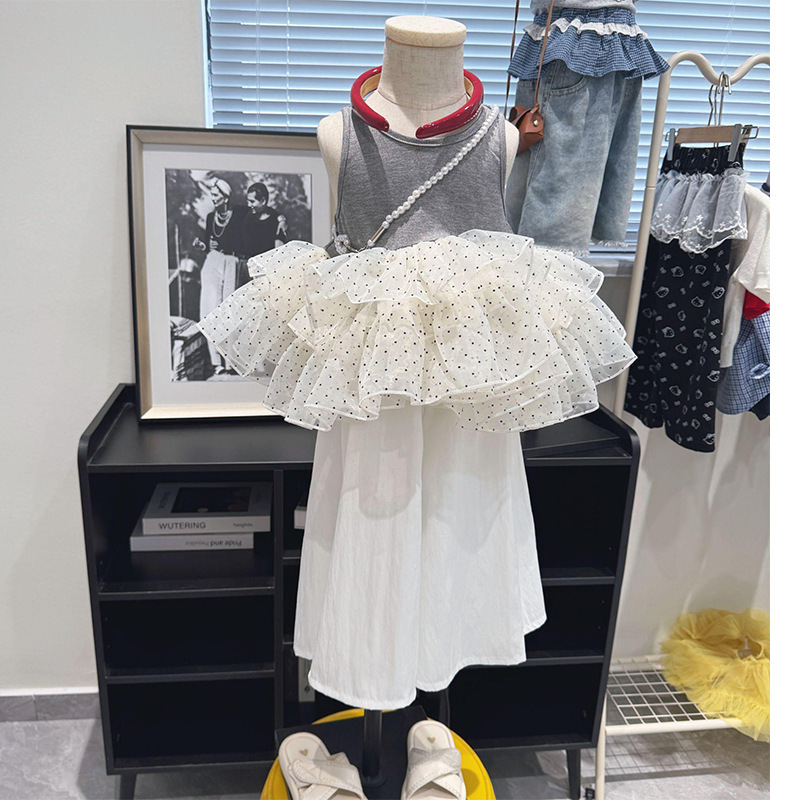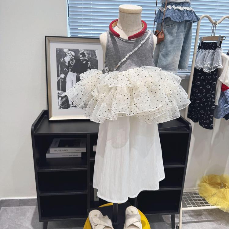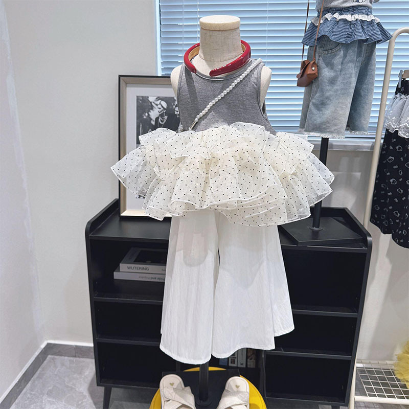 여아 여름옷, 한국식 서양식 러플 스플리싱 쉬폰 도트무늬 조끼와 와이드 팬츠 투피스 세트