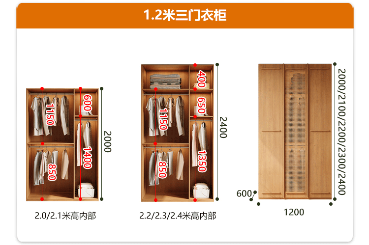 • [폭 1.2m*높이 2.3m] 3도어 옷장, 모두 원목 ENF 등급
