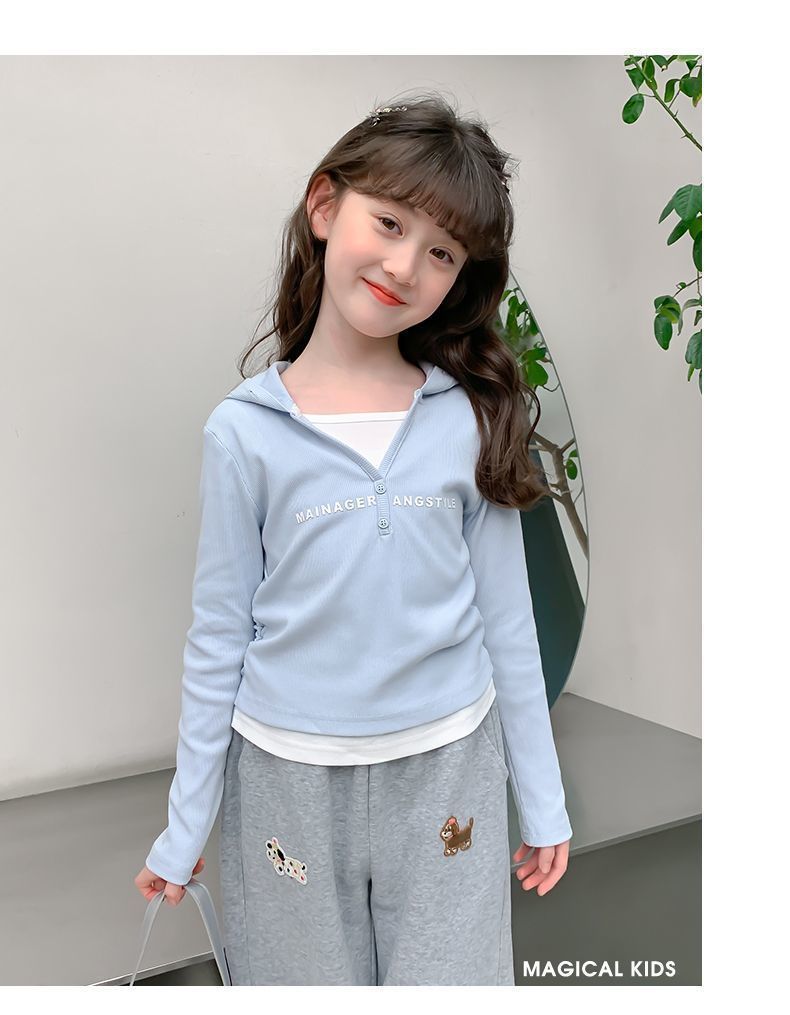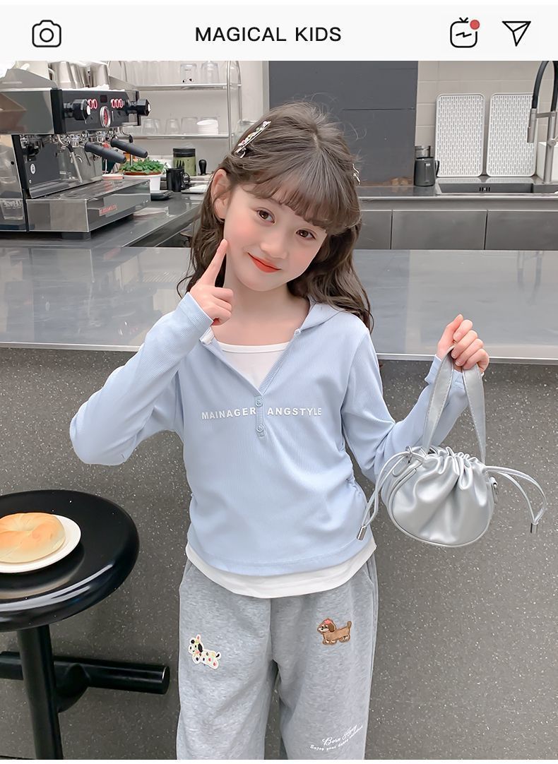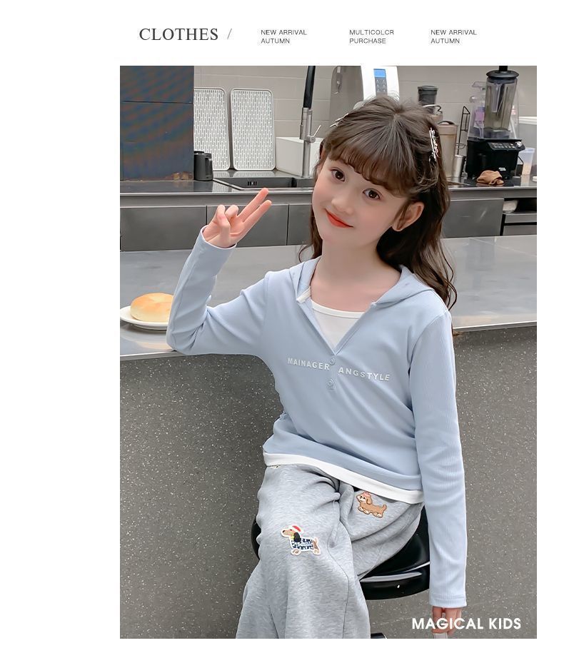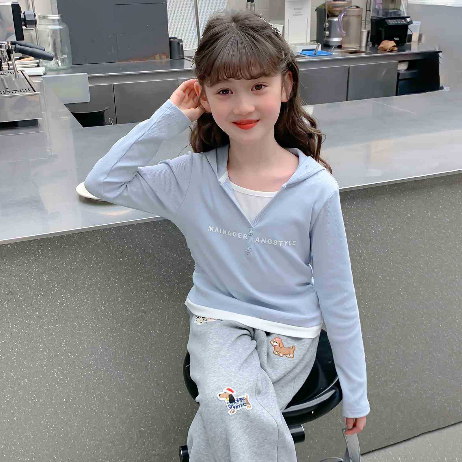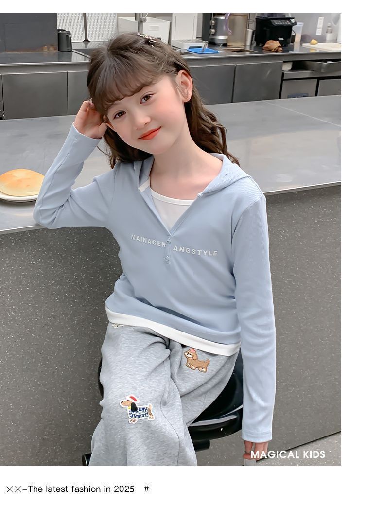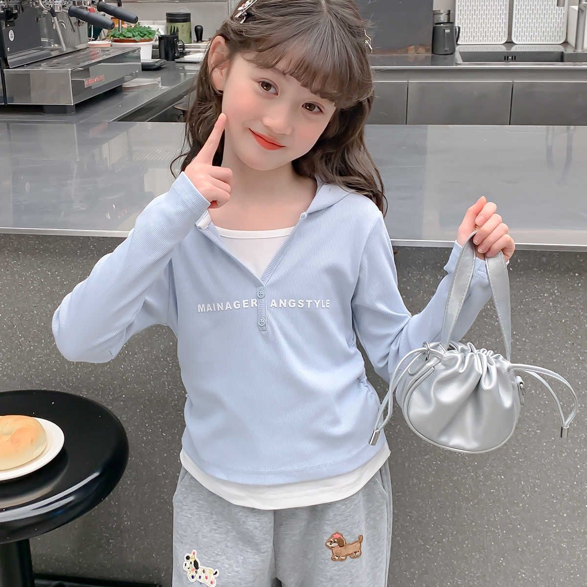 여자 봄, 가을 티셔츠 2025 새로운 스타일 아동 의류 가짜 투피스 어린 소녀 봄 후드 탑 어린이 봄 의류스토어 가기