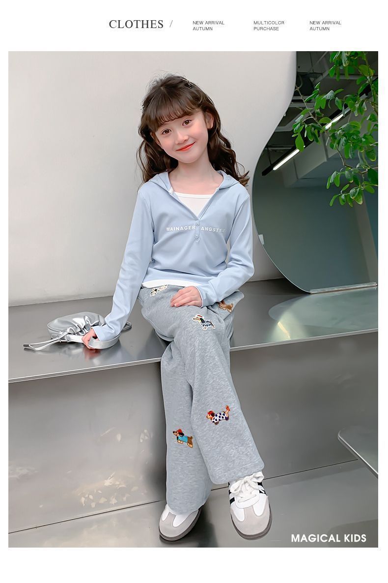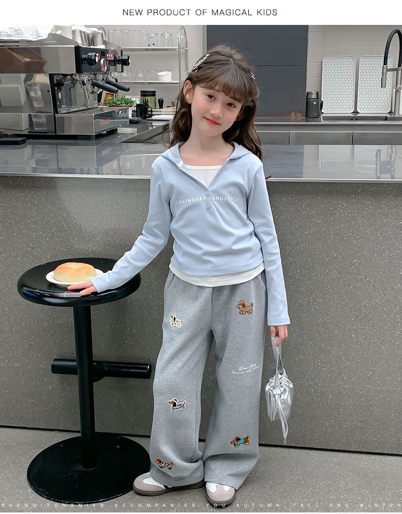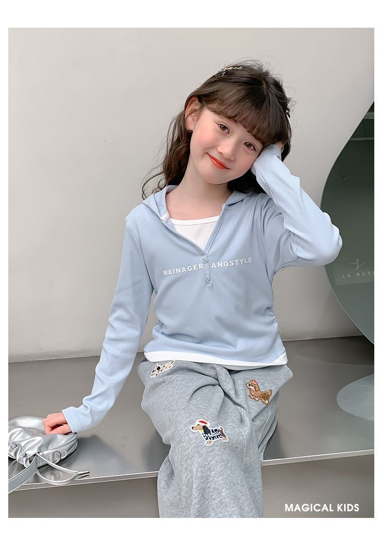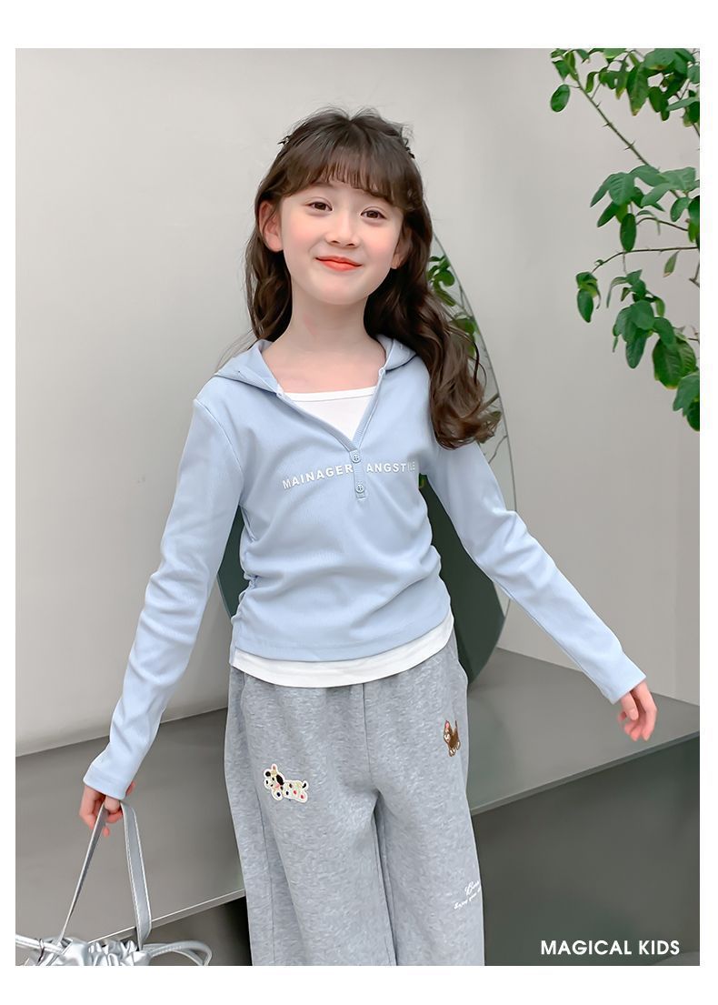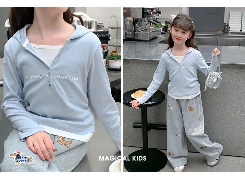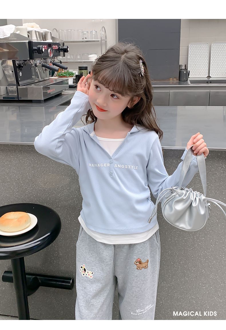 여자 봄, 가을 티셔츠 2025 새로운 스타일 아동 의류 가짜 투피스 어린 소녀 봄 후드 탑 어린이 봄 의류스토어 가기