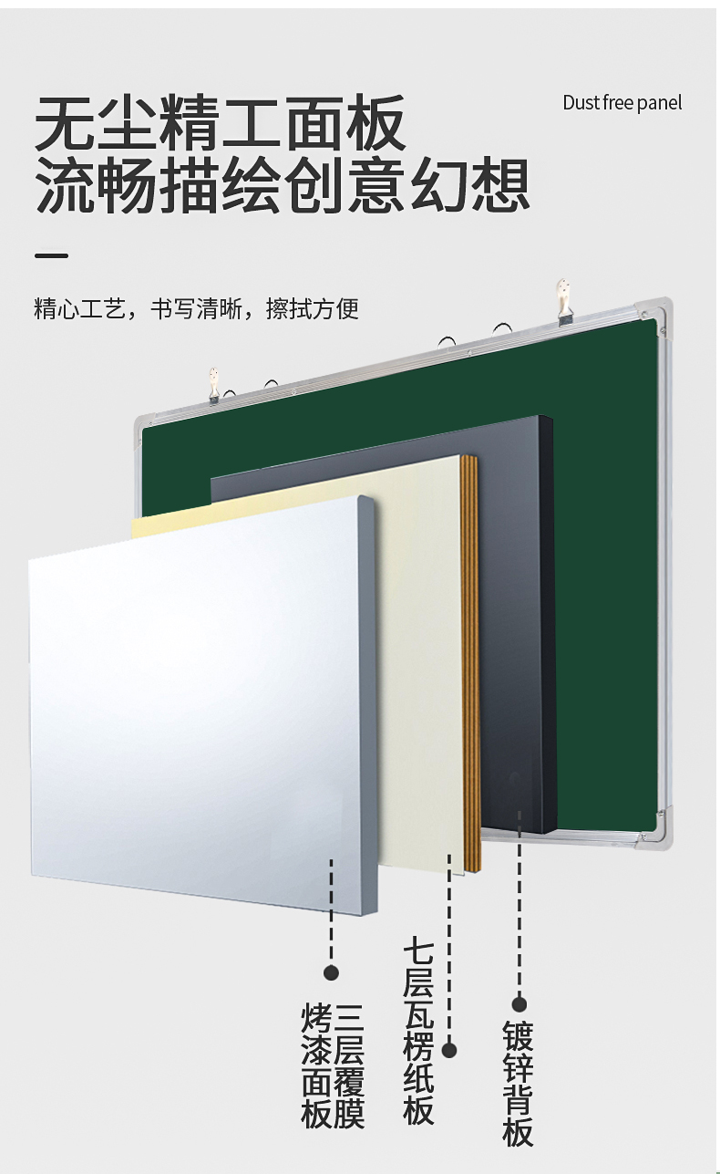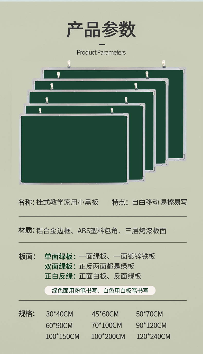 • 100*200 단면 그린 보드에는 분필 4상자, 지우개 1개, 자석 12개, 수건 1개, 못 2개가 포함되어 있습니다.
