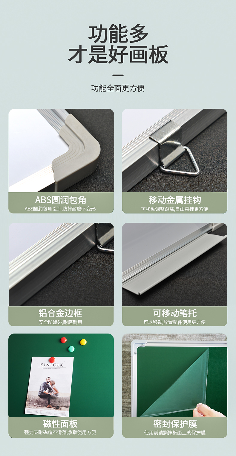 • 60*90 단면 그린 보드에는 분필 4상자, 지우개 1개, 자석 12개, 수건 1개, 못 2개가 포함되어 있습니다.