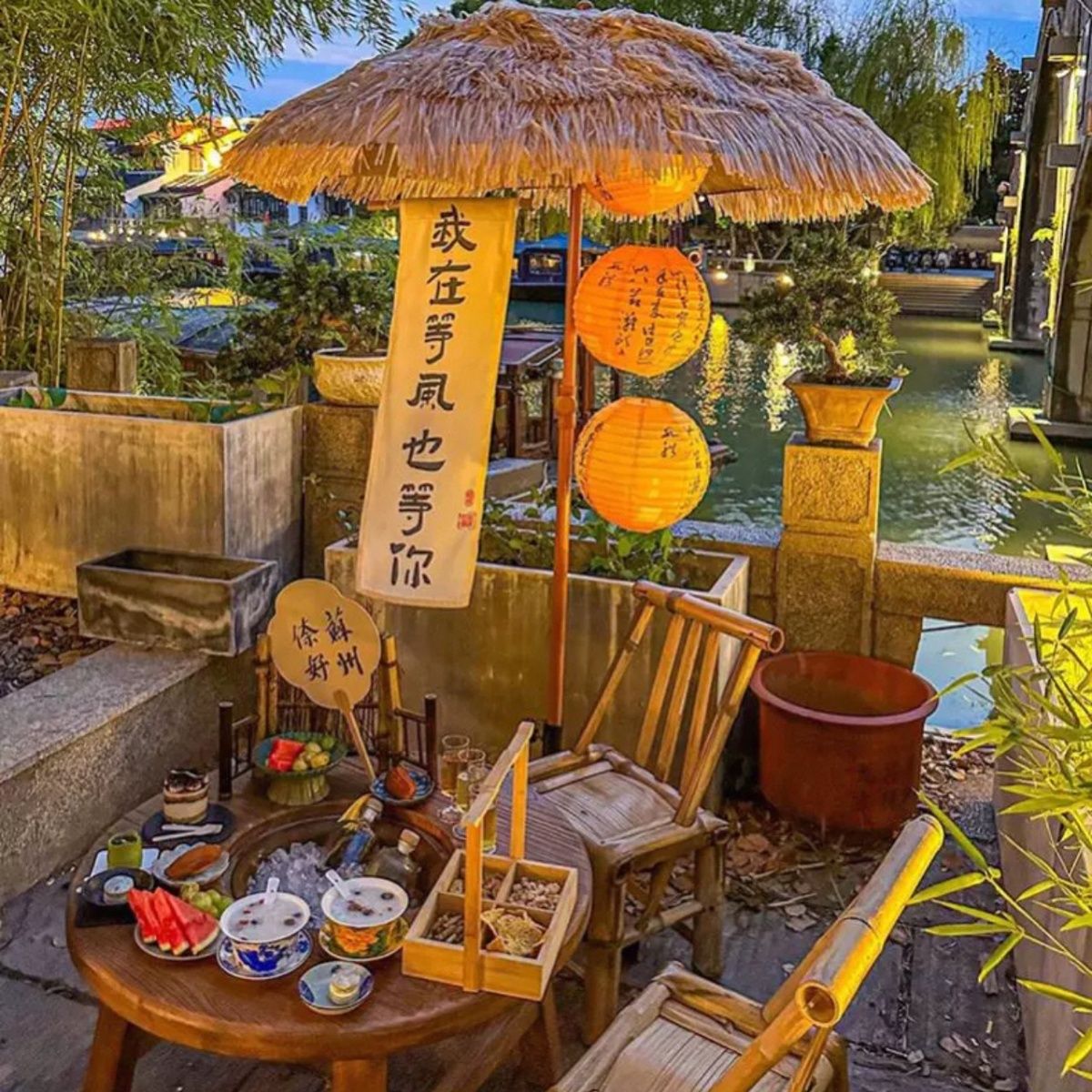 안뜰 사진 발코니 정원 가구 직선 스틱 사진 소품 모조 밀짚 우산 짚 야외 태양 우산 파라솔