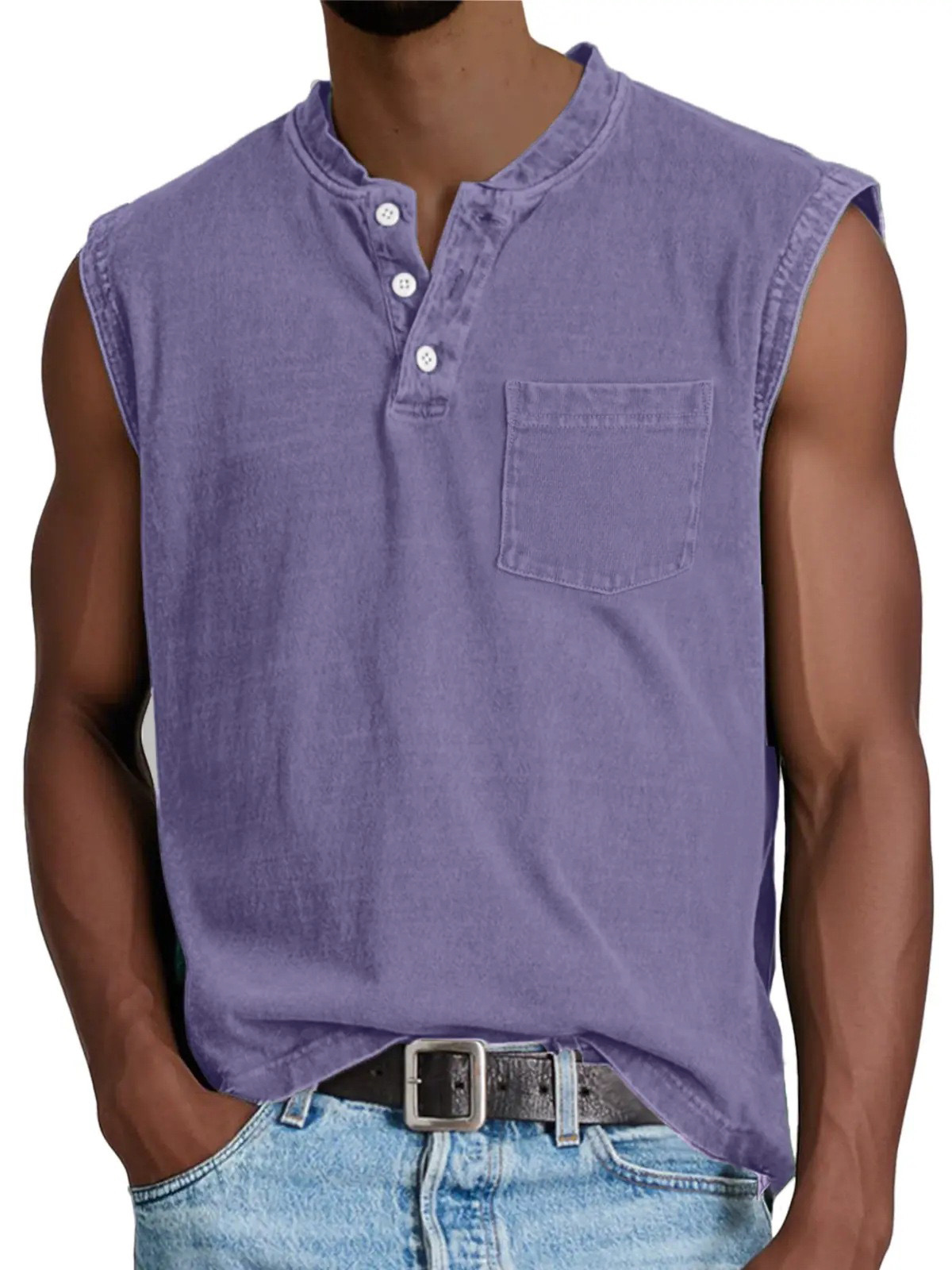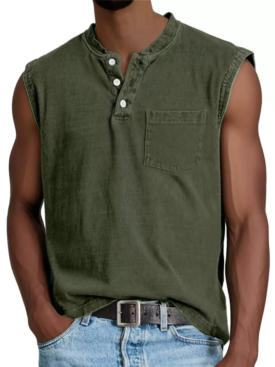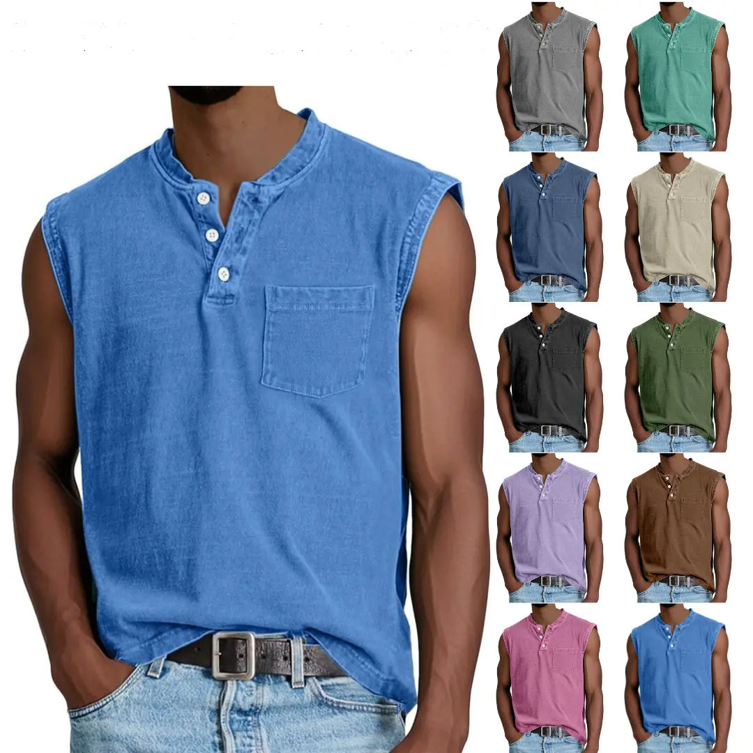 2025 유럽 및 미국 국경 간 남성 의류_민소매 넓은 어깨 면 조끼 남성 헨리 칼라 버튼 피트니스 스포츠 탑스토어 가기