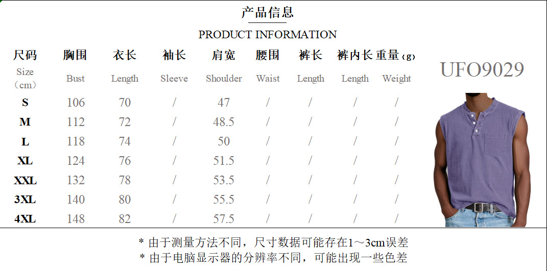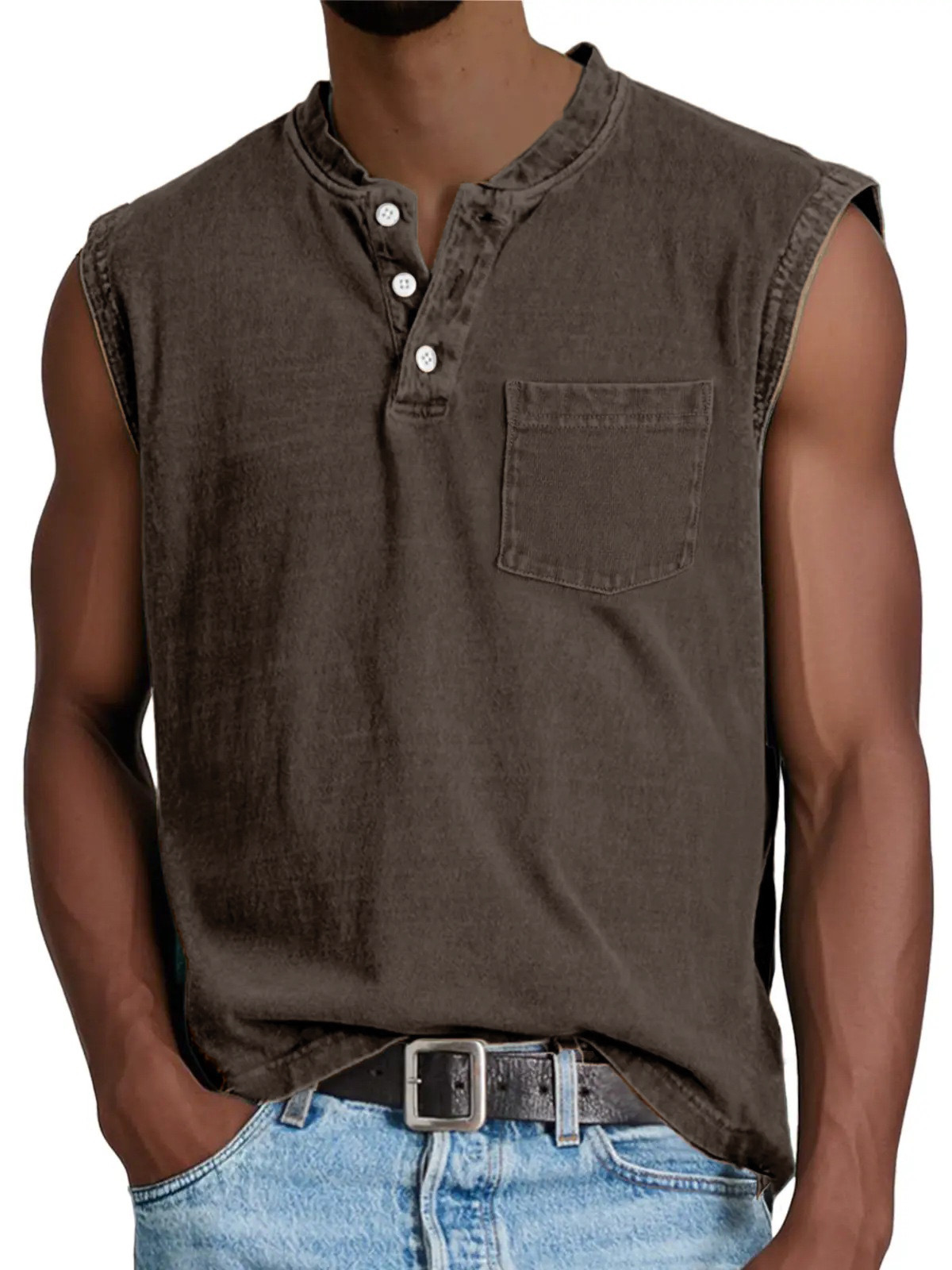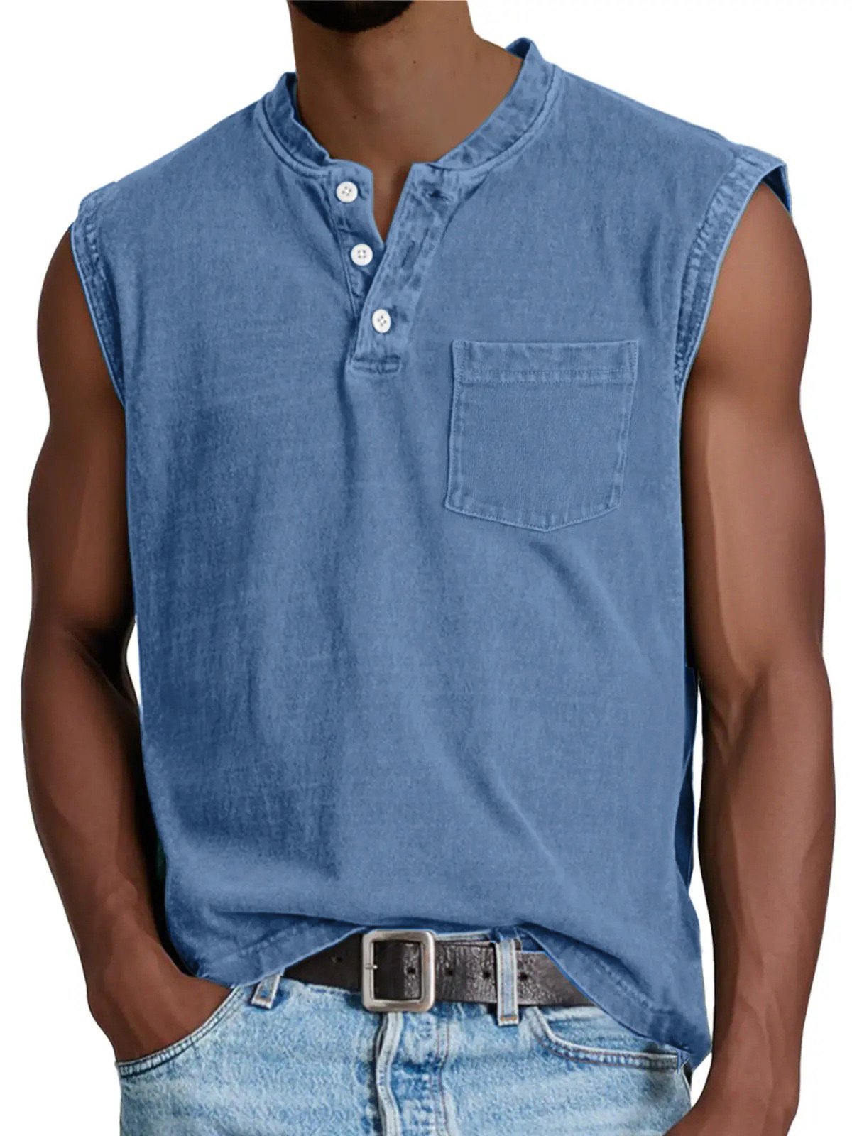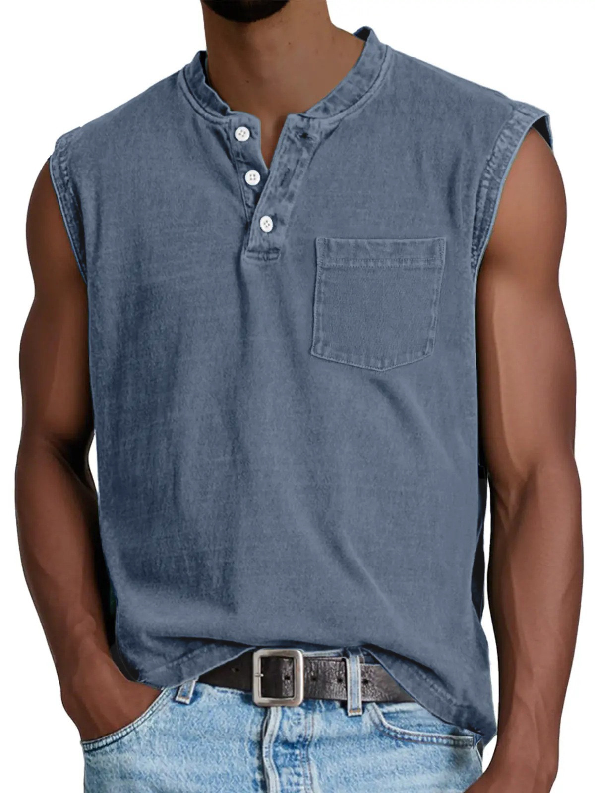 2025 유럽 및 미국 국경 간 남성 의류_민소매 넓은 어깨 면 조끼 남성 헨리 칼라 버튼 피트니스 스포츠 탑스토어 가기