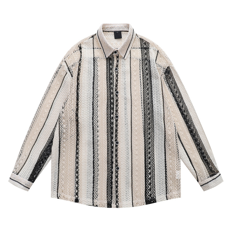 광저우 남성 미국 복고풍 중공 줄무늬 긴팔 남성 셔츠 루즈 캐주얼 디자인 틈새 트렌디 브랜드 셔츠