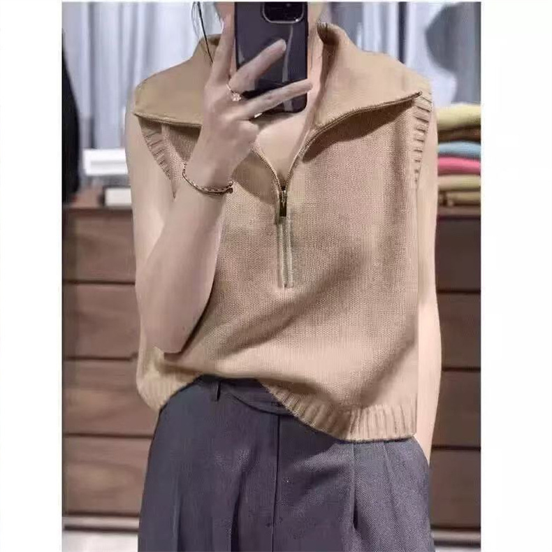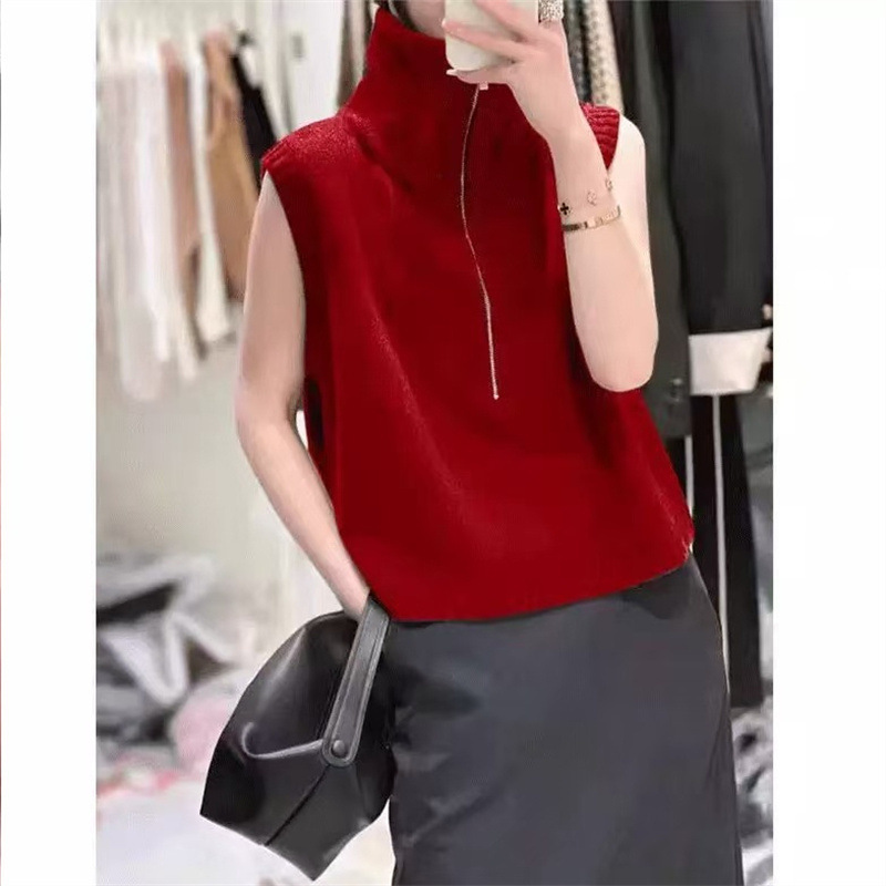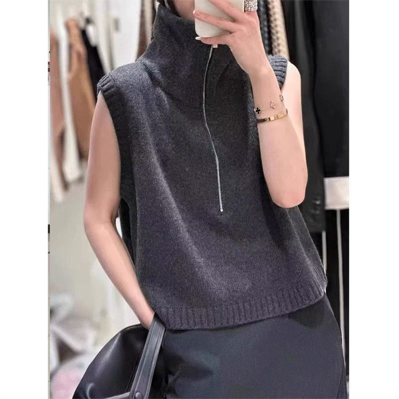 2025 새로운 니트 조끼 여성 봄, 가을 다목적 터틀넥 지퍼 솔리드 컬러 느슨한 민소매 조끼 탑