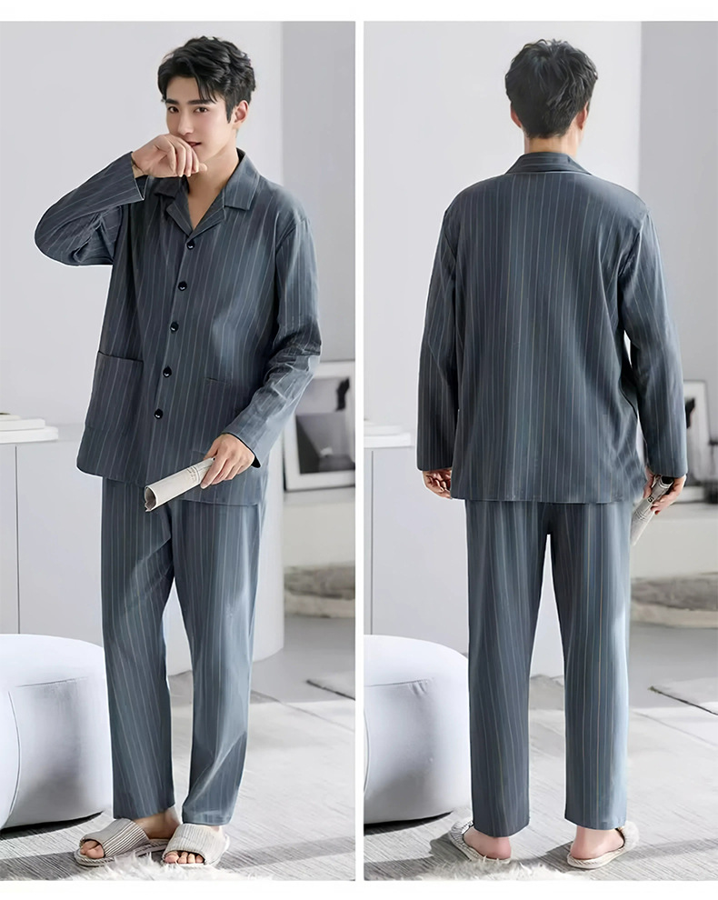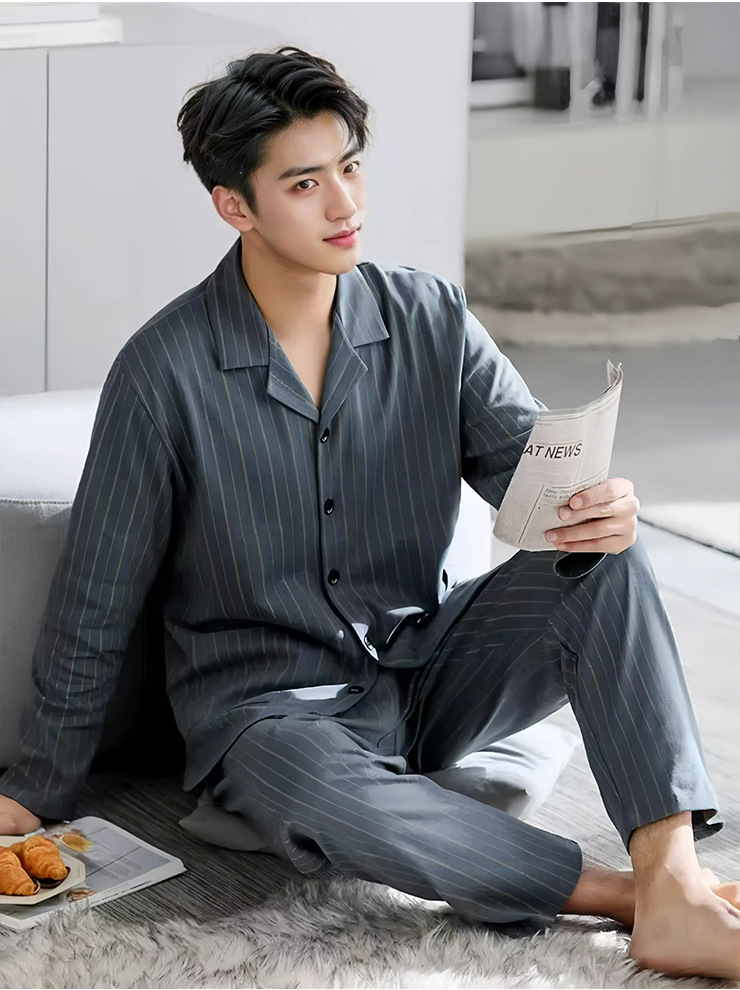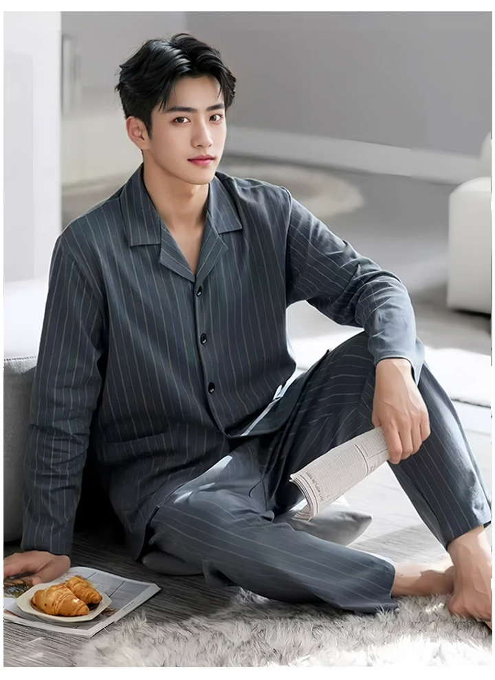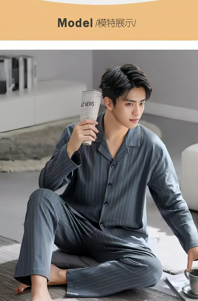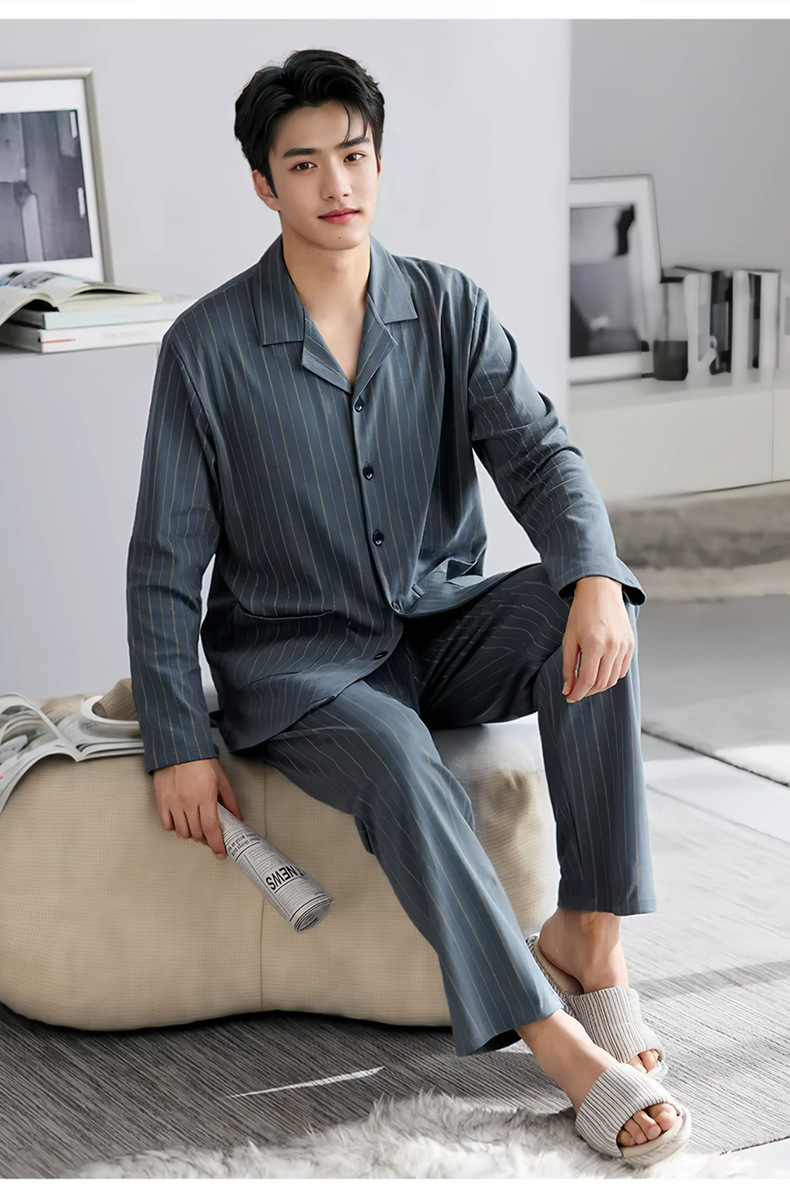 남성용 순면 잠옷 2025 봄, 가을 라운드 넥 멋진 긴팔 바지 루즈하고 심플한 학생 홈웨어 세트스토어 가기