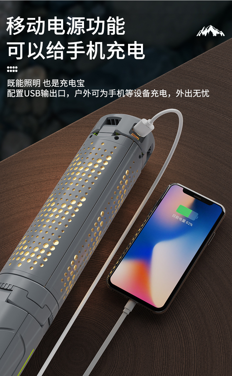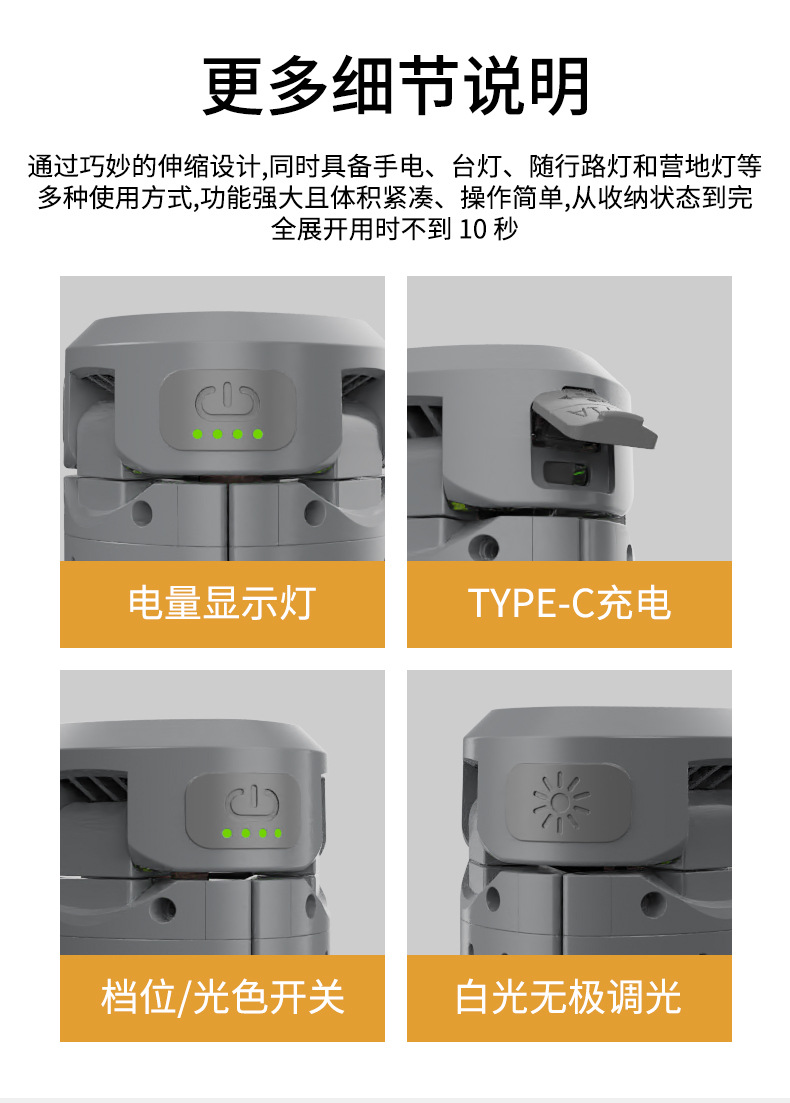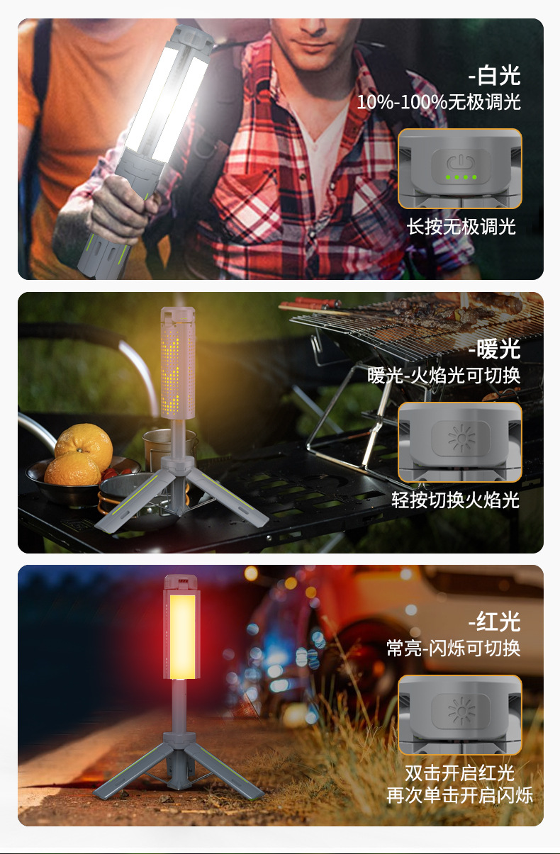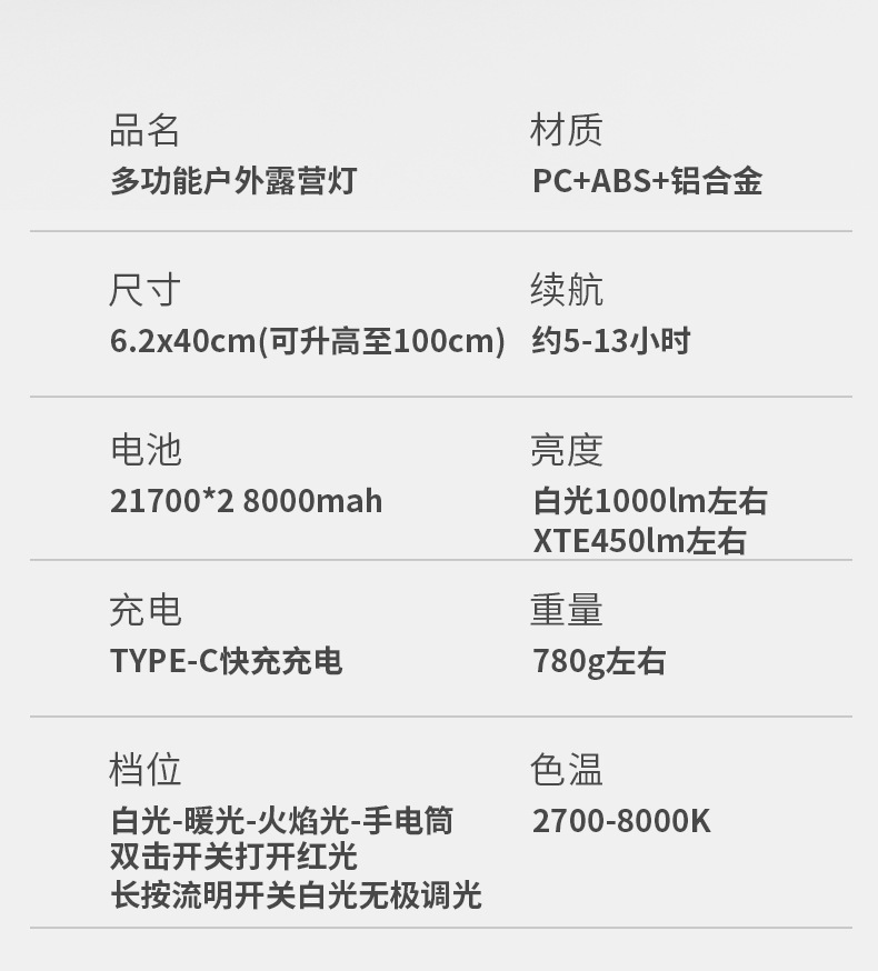 白光照明灯(长按无极调光),10-100亮度随心调。