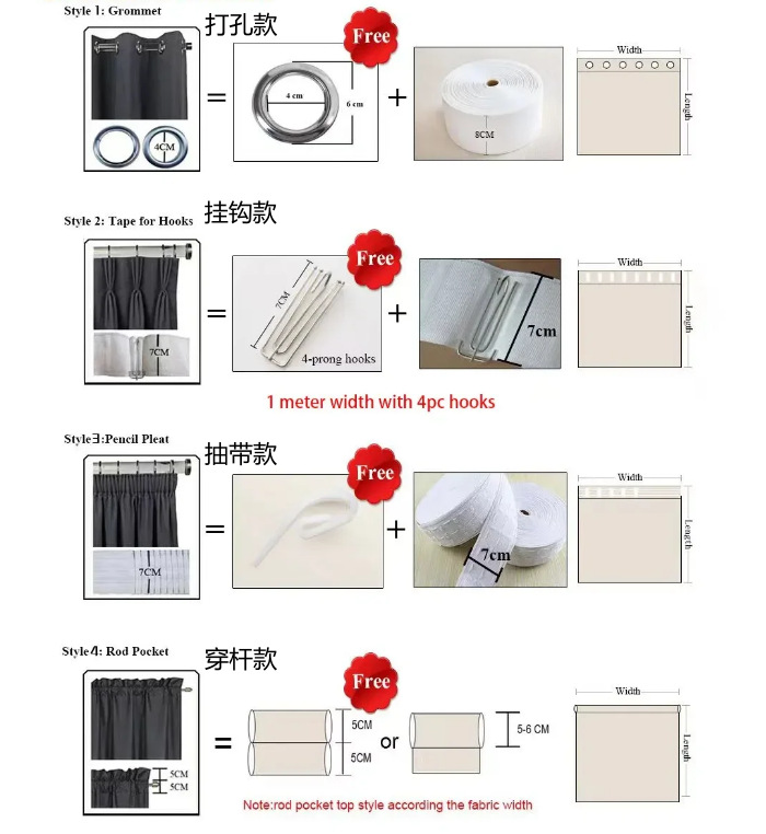 请注意,穿杆款/打孔款/挂钩款是指加工方式,不送杆子、罗马杆或轨道。
