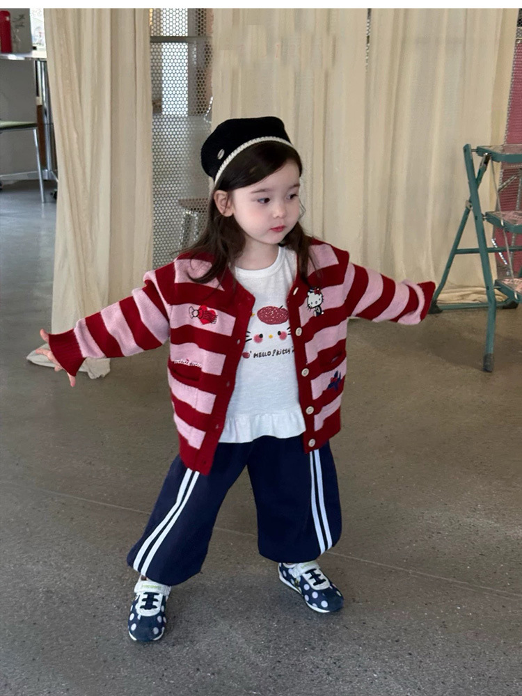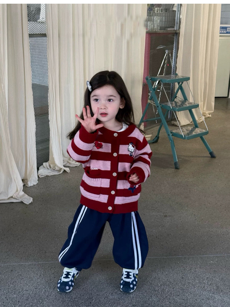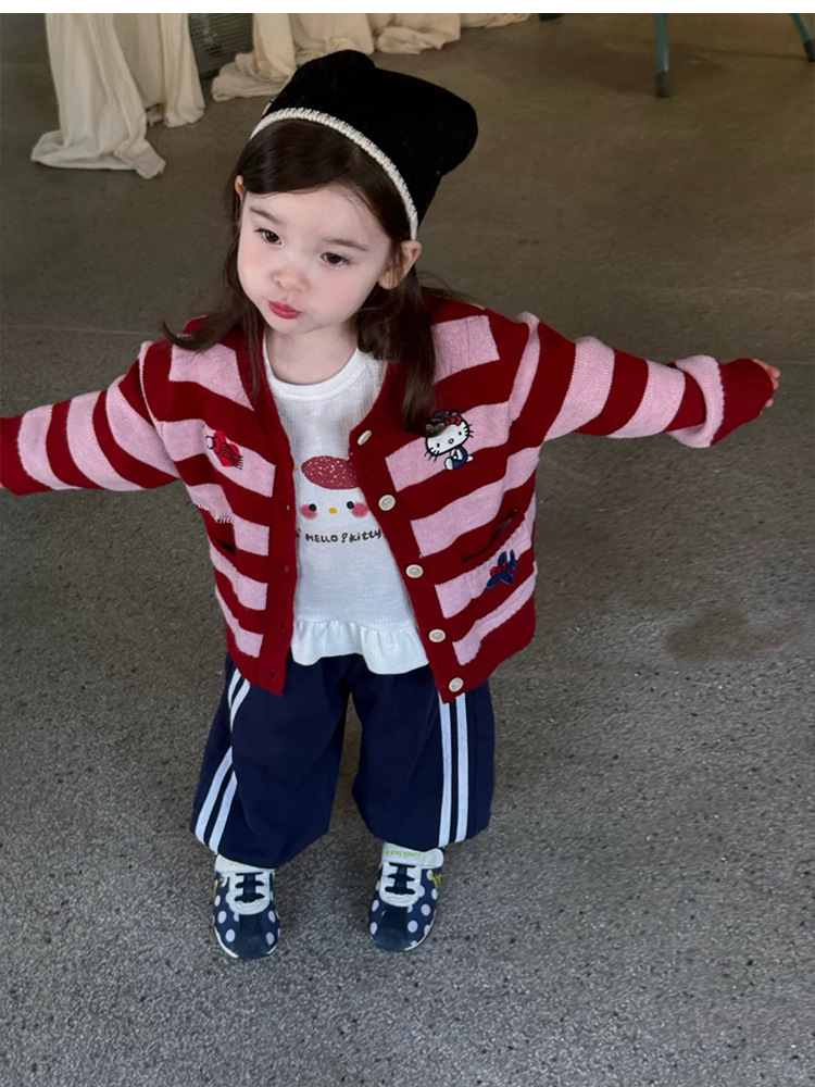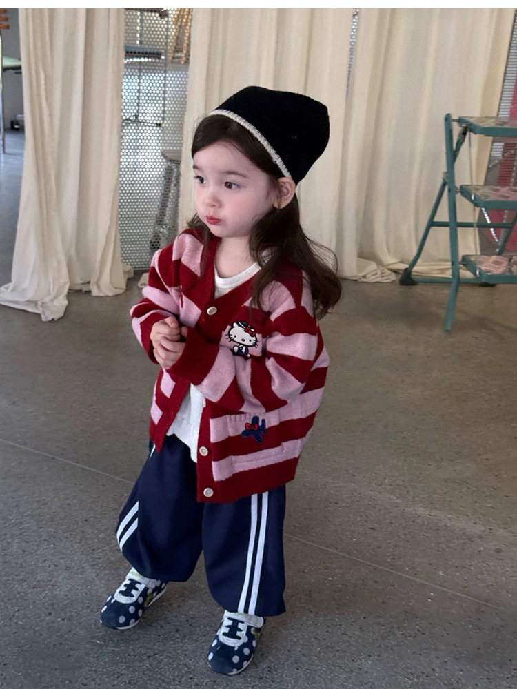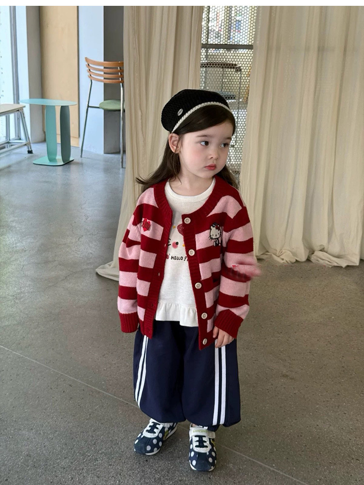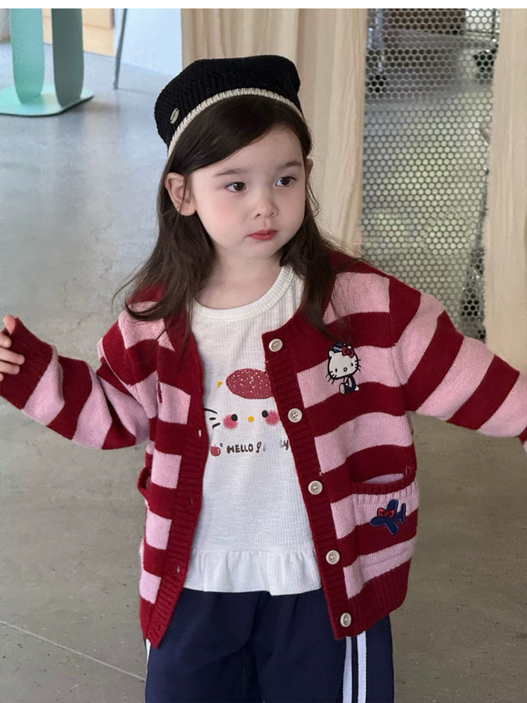 여자 니트 카디건 재킷 2025 가을 새 아기 귀여운 kt 고양이 만화 줄무늬 스웨터 루즈 탑