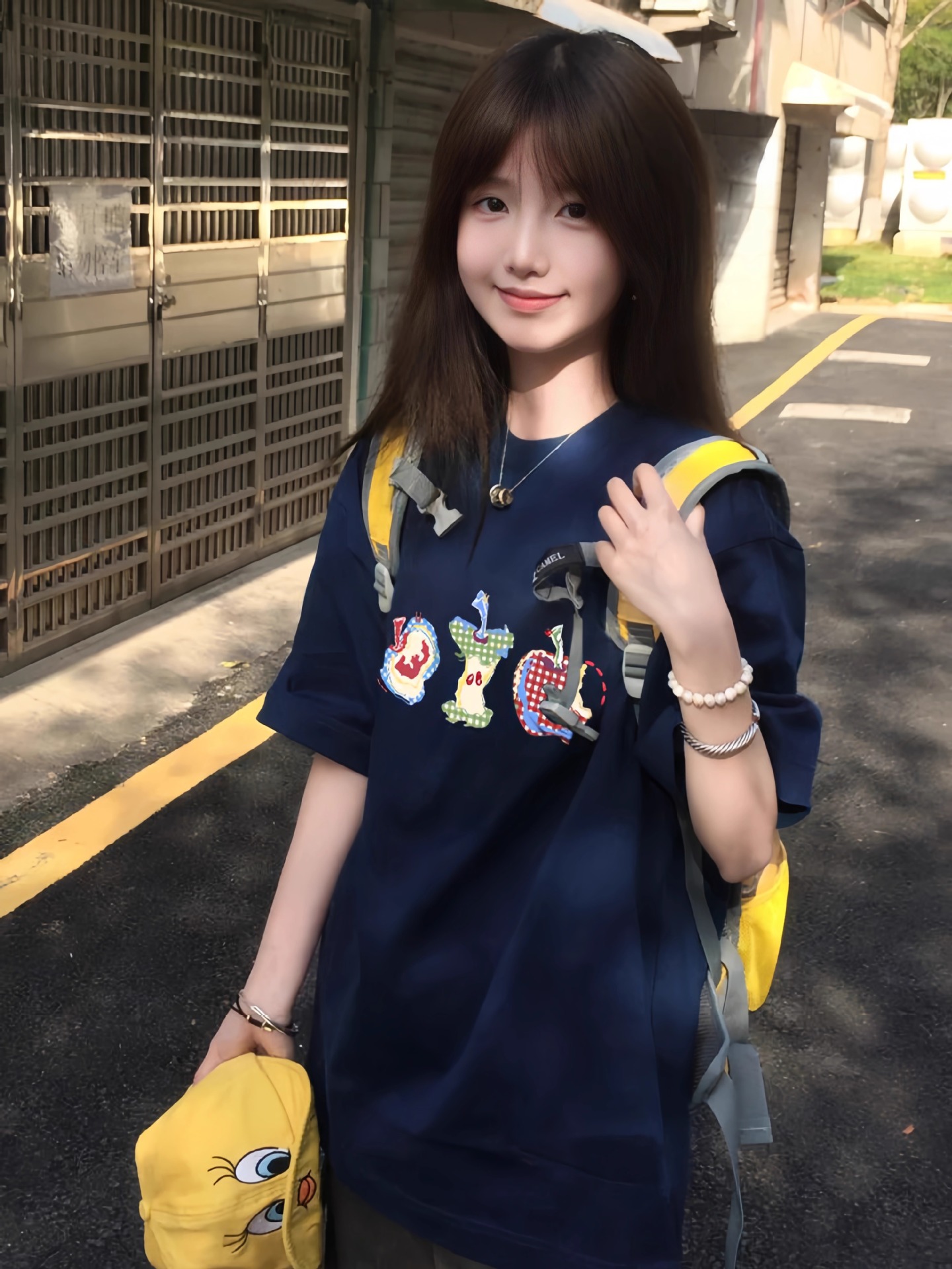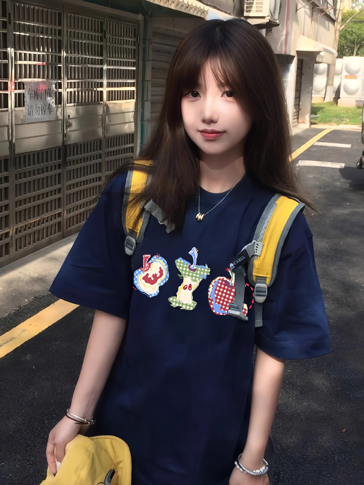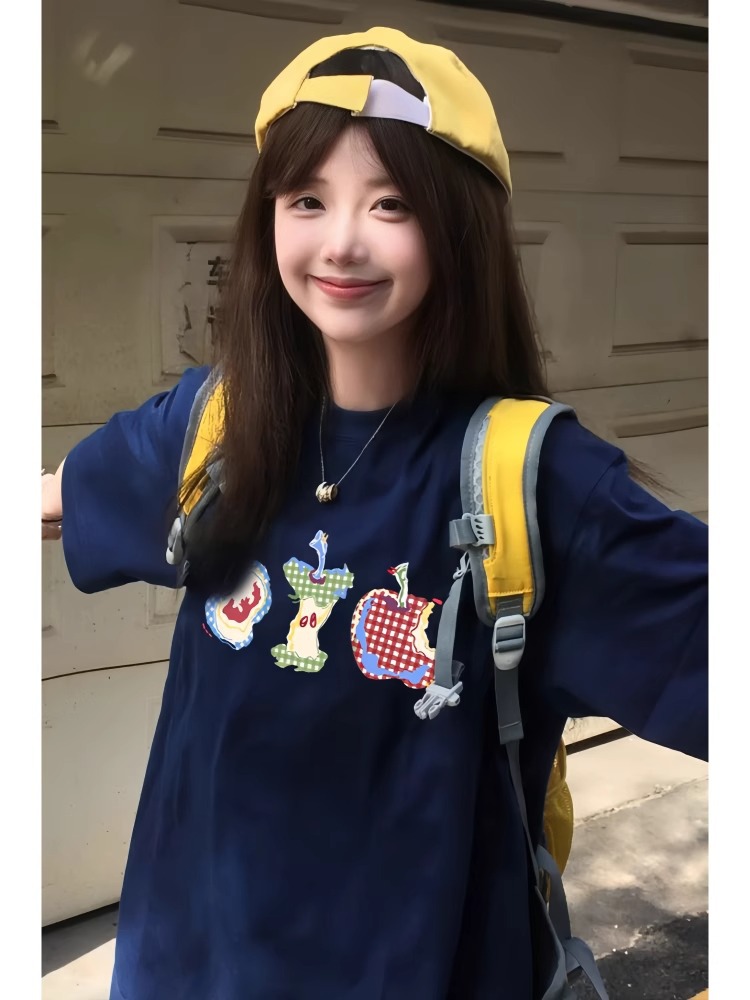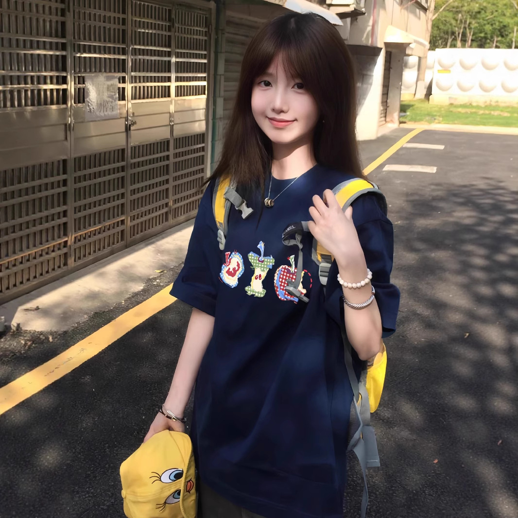 Fat mm 아메리칸 네이비 블루 특대 반팔 티셔츠 여성 여름 중학생 티셔츠 루즈 반팔 탑