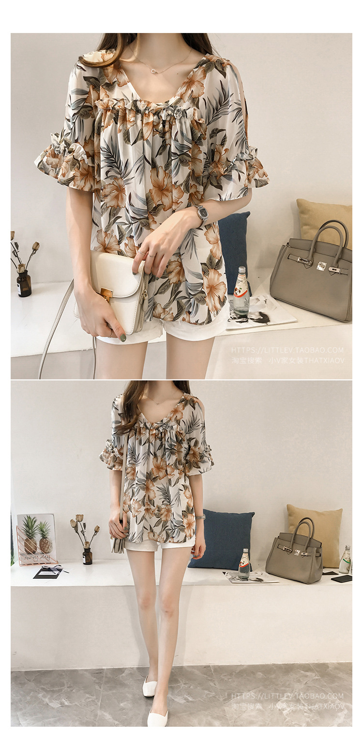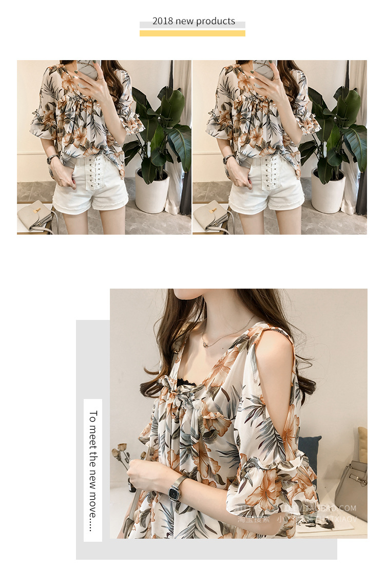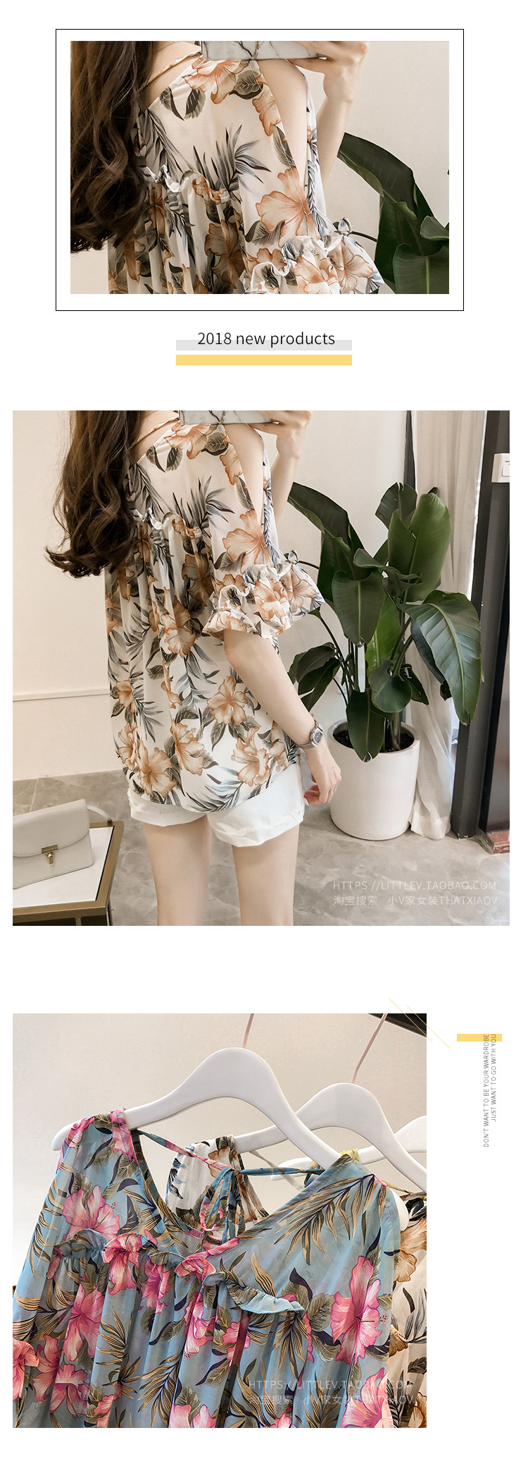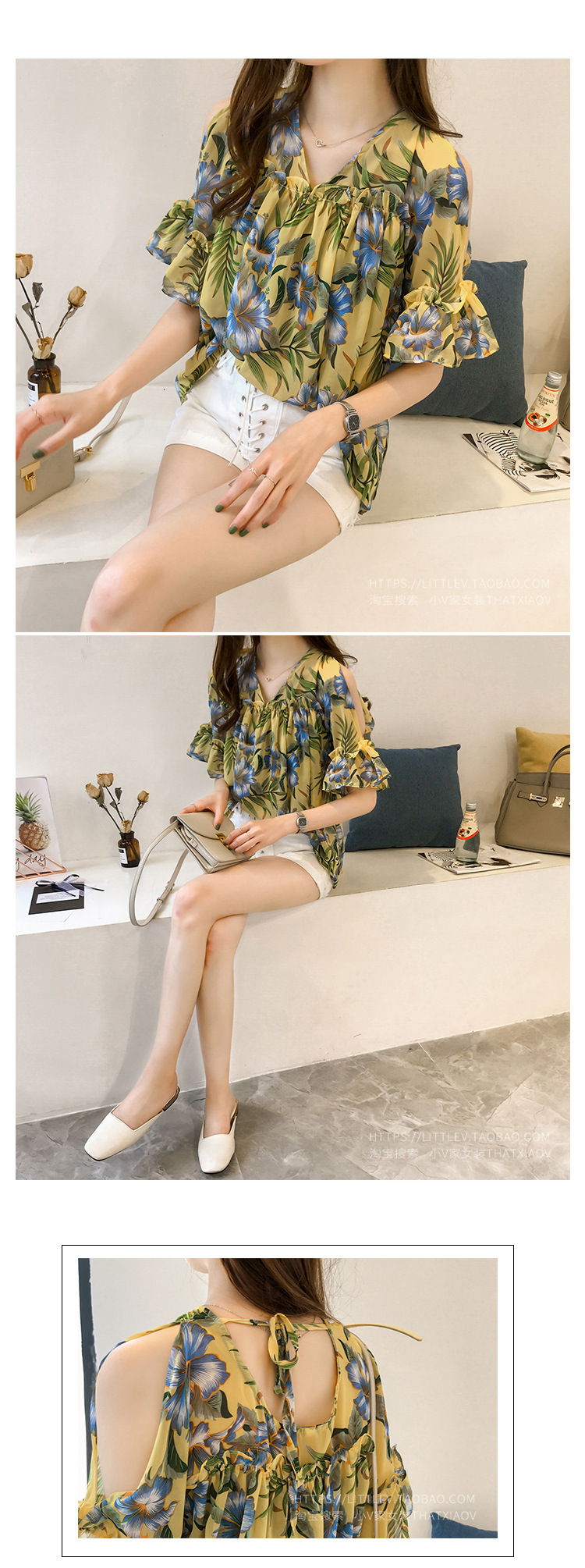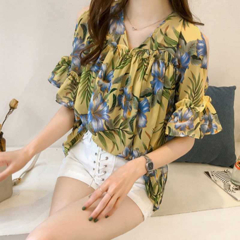 2024 여름 달콤한 벨 슬리브 바닥 탑 새로운 프린트 오프 숄더 쉬폰 셔츠 루즈 배 커버 베이비돌 셔츠스토어 가기