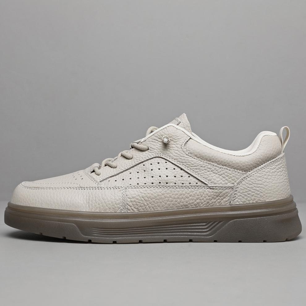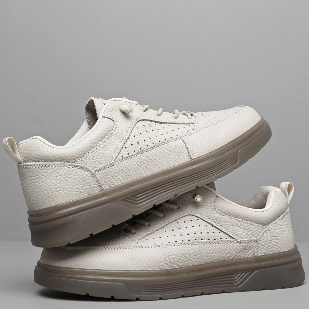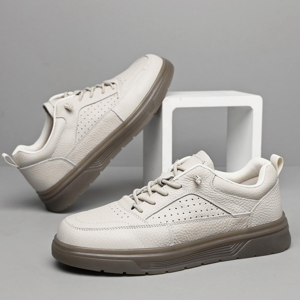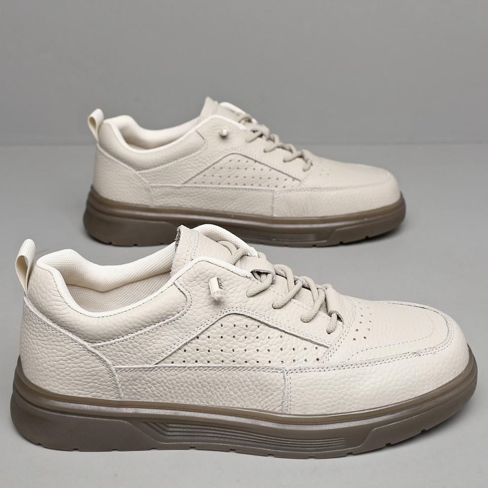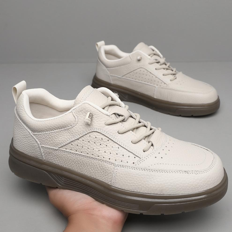 캐주얼하고 다재다능한 화이트 패셔너블한 남성화, 부드러운 표면의 두꺼운 밑창 신발, 통기성 좋은 신발, 2025 여름 중공 로우탑 가죽 신발스토어 가기