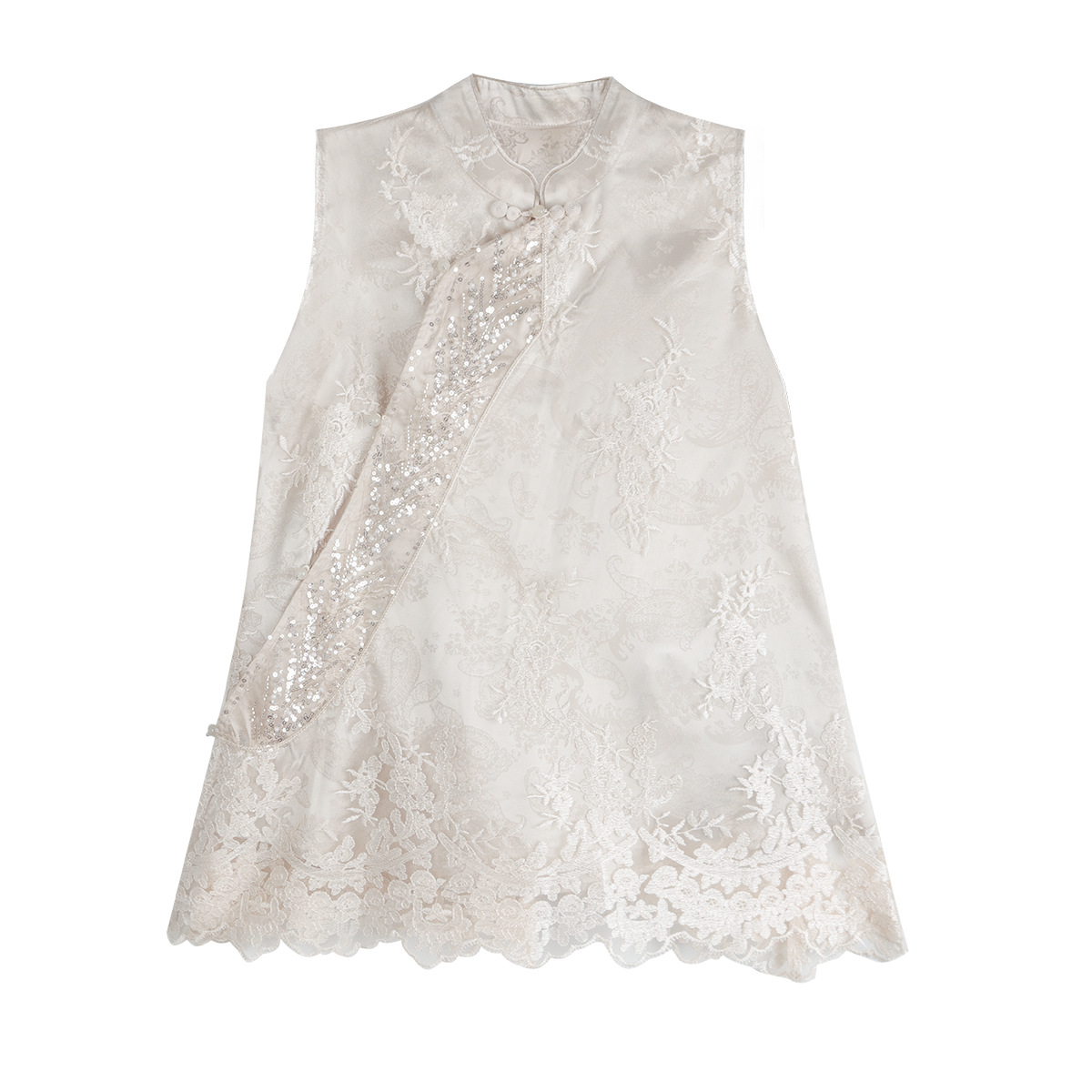 绣制出传统纹样珠片在光线折射下闪烁着璀璨光芒为素雅的杏白色增添华丽感,