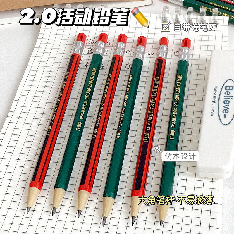 초등학생을 위한 모조 나무 육각봉 자동연필, 깎이지 않는 연속연필 필기구, 연필깎이 포함 0.2 샤프펜슬