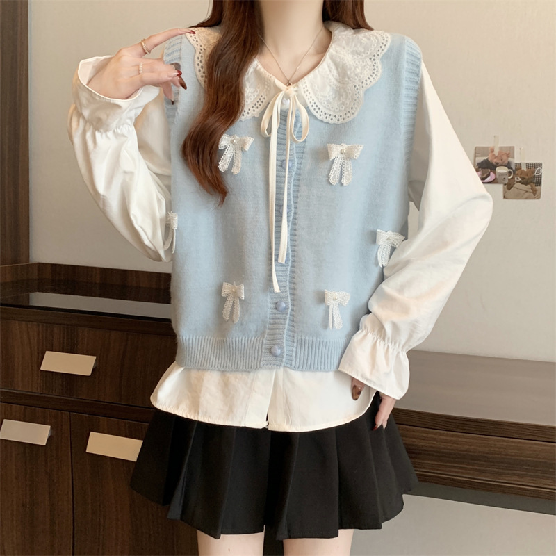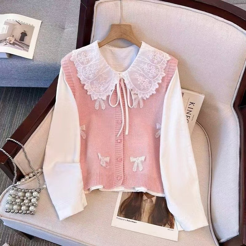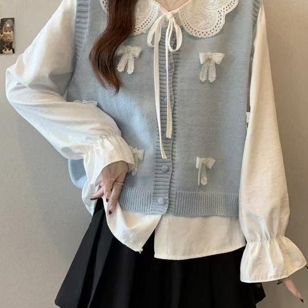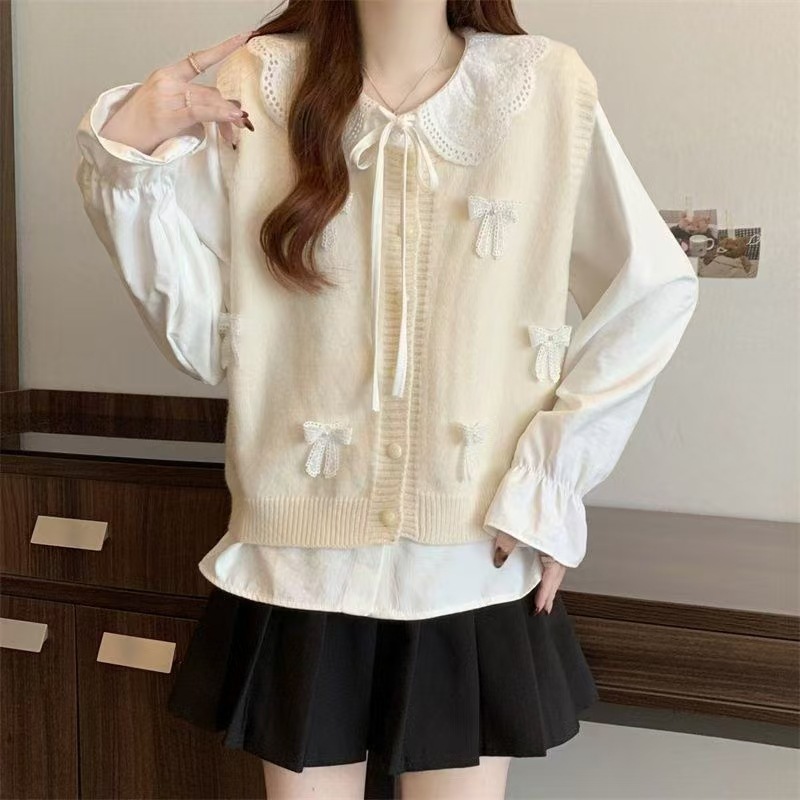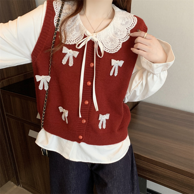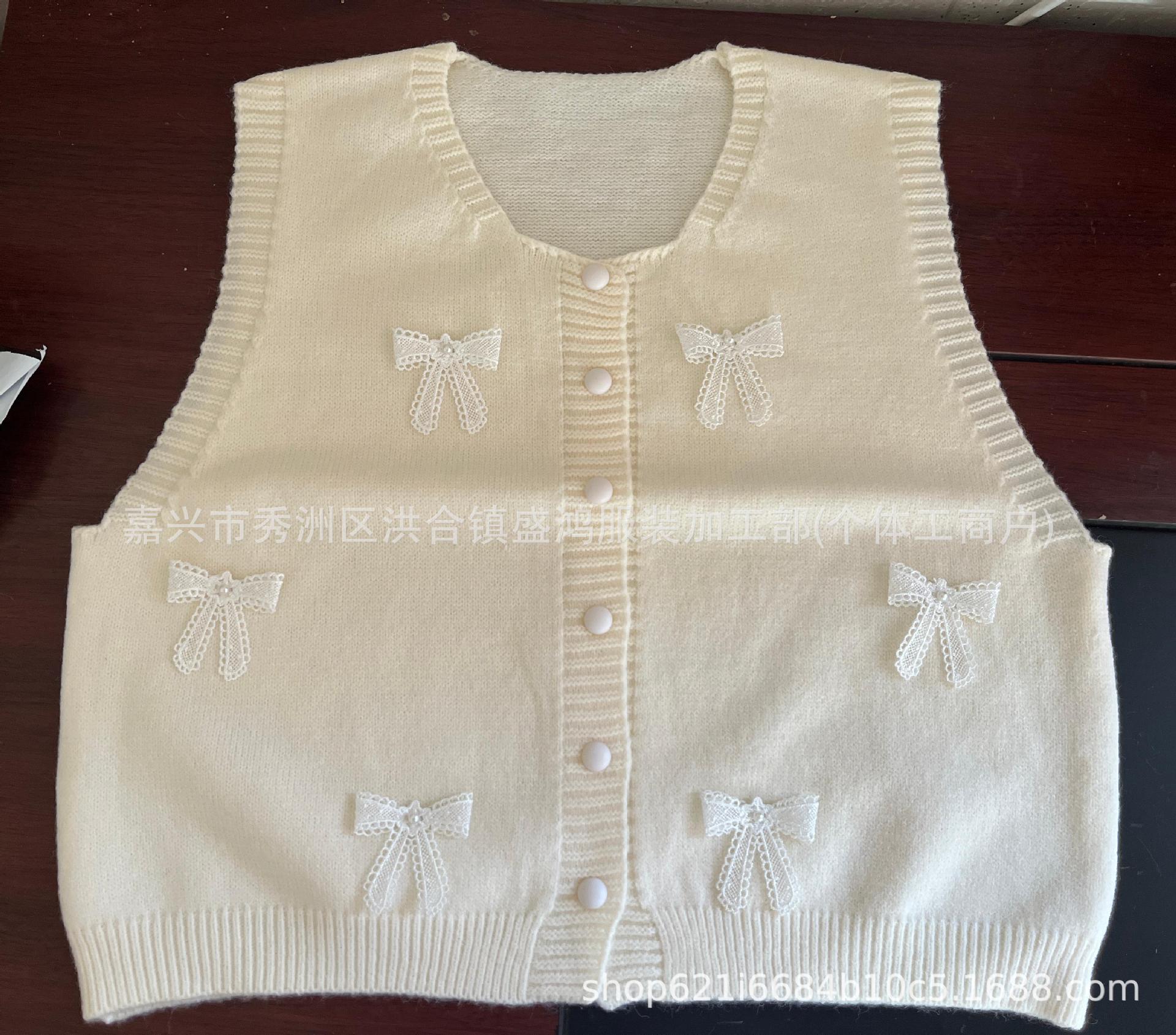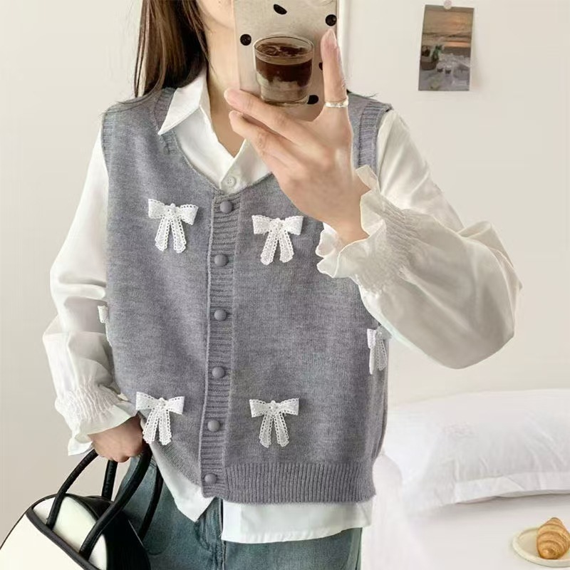 봄과 가을 여아를 위한 연령 감소 나비 매듭 니트 조끼, 프렌치 스타일, 상큼하고 부드럽고 달콤한 스타일의 레이어드 스웨터 조끼스토어 가기