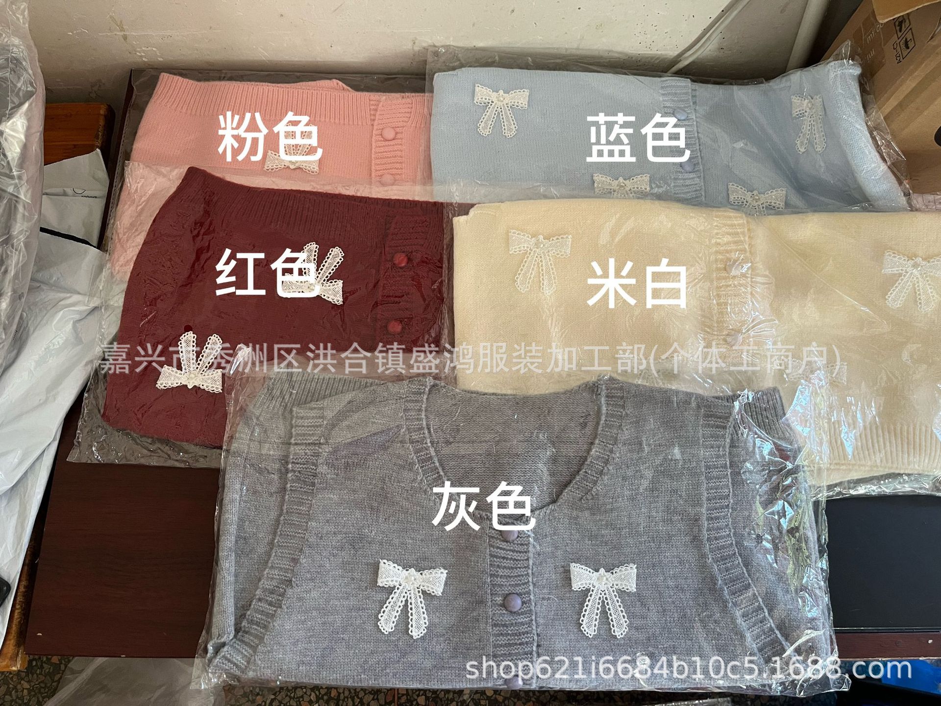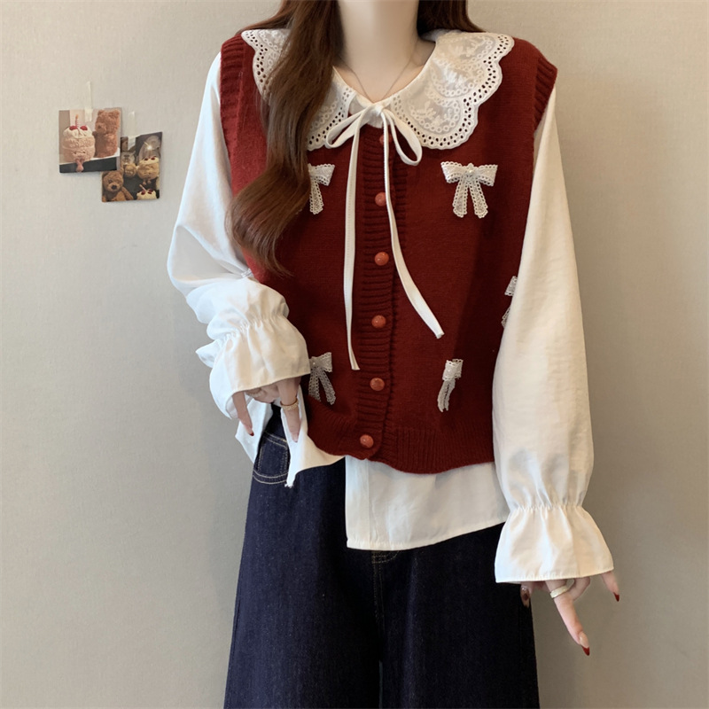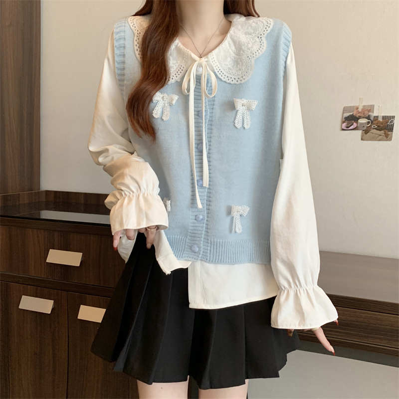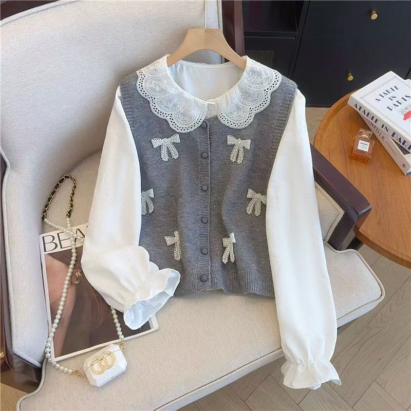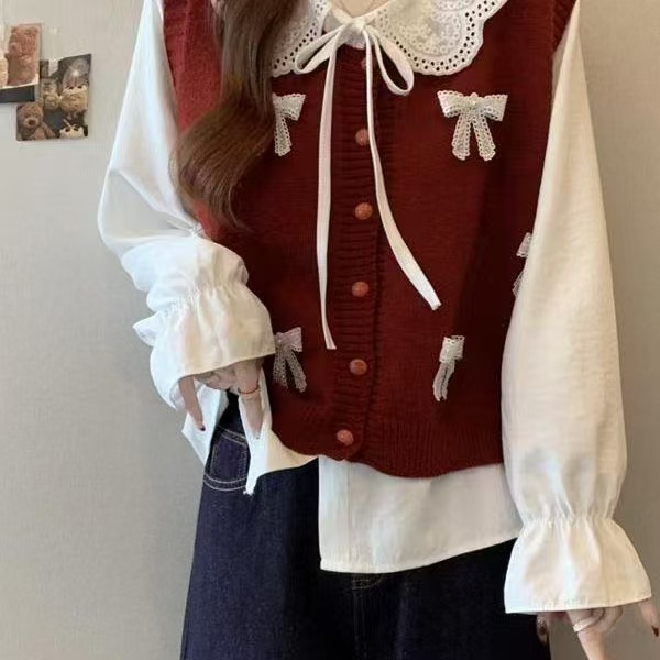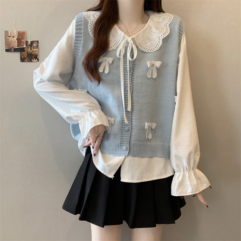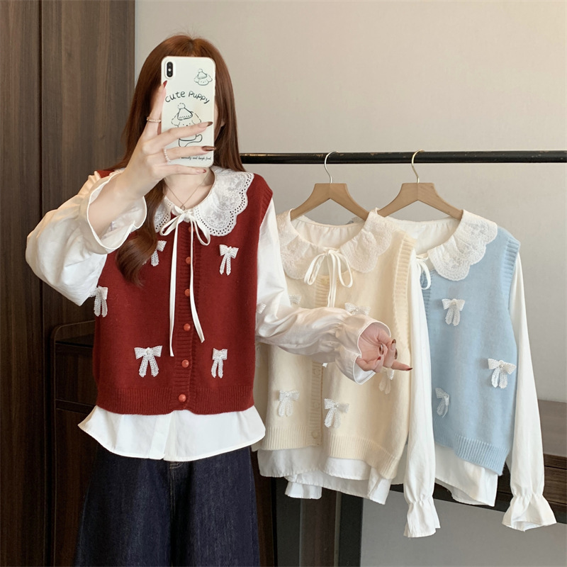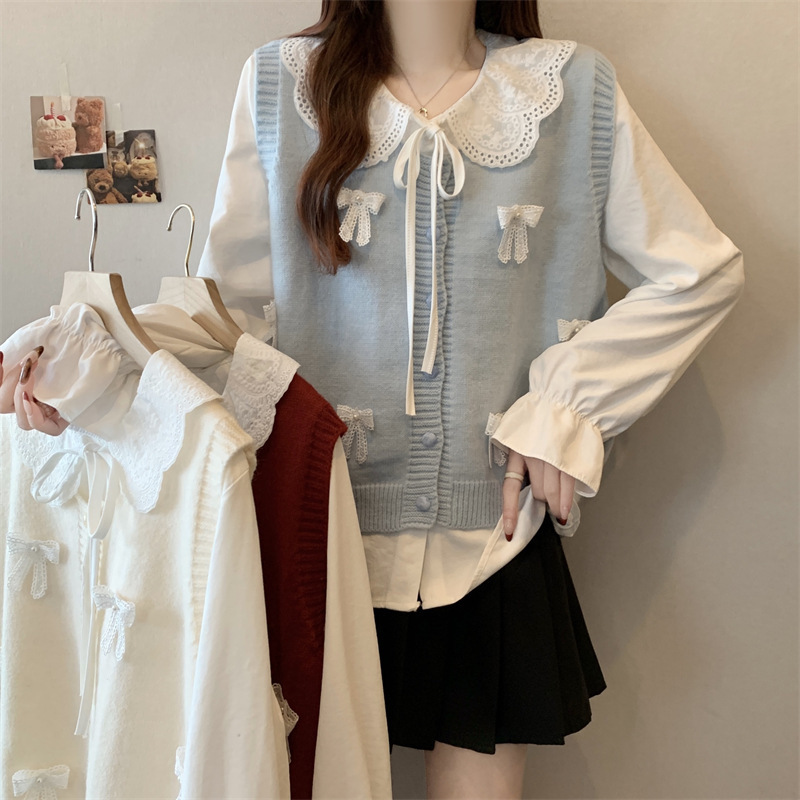 봄과 가을 여아를 위한 연령 감소 나비 매듭 니트 조끼, 프렌치 스타일, 상큼하고 부드럽고 달콤한 스타일의 레이어드 스웨터 조끼스토어 가기