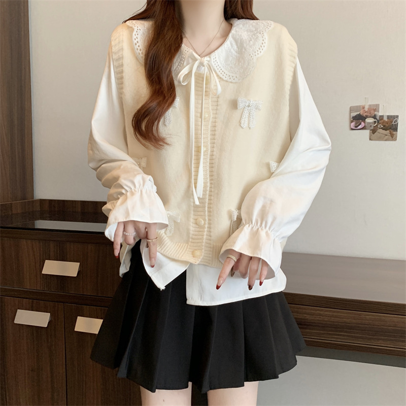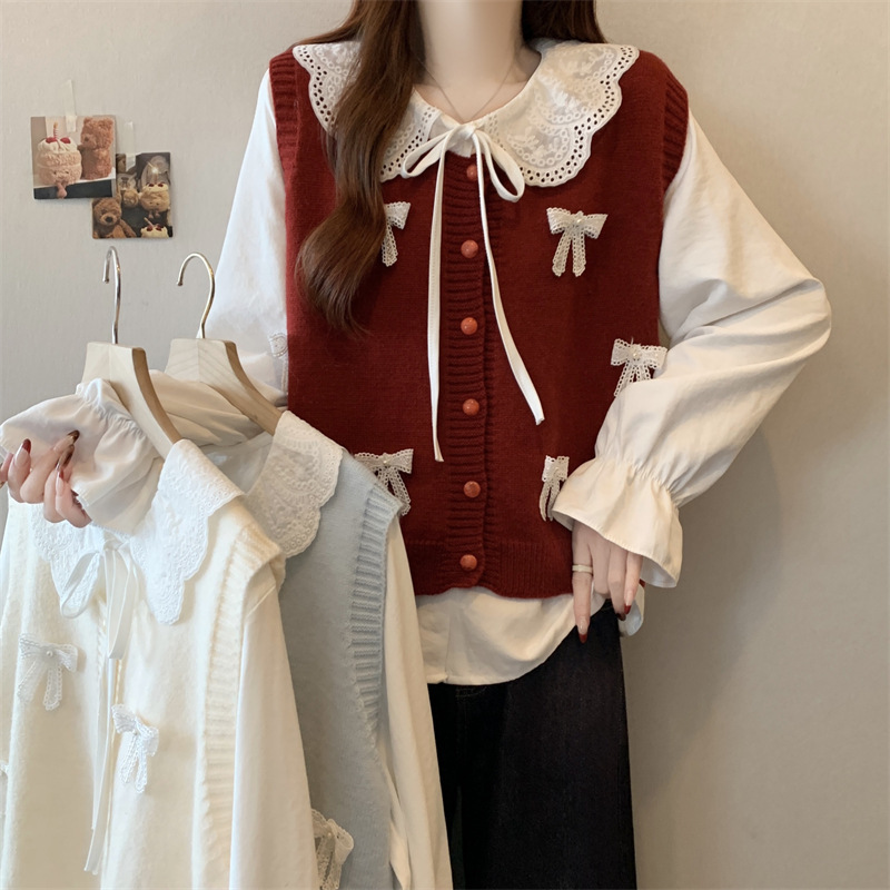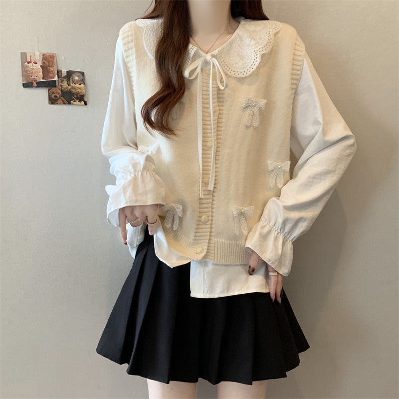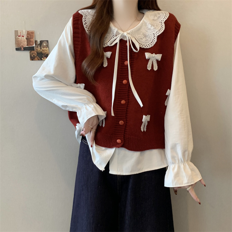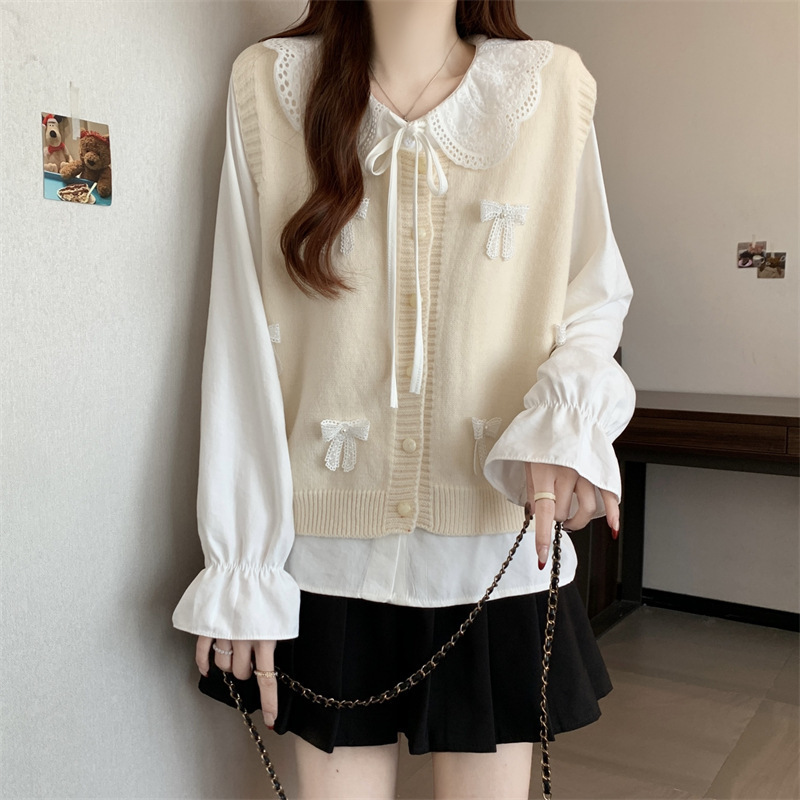 봄과 가을 여아를 위한 연령 감소 나비 매듭 니트 조끼, 프렌치 스타일, 상큼하고 부드럽고 달콤한 스타일의 레이어드 스웨터 조끼