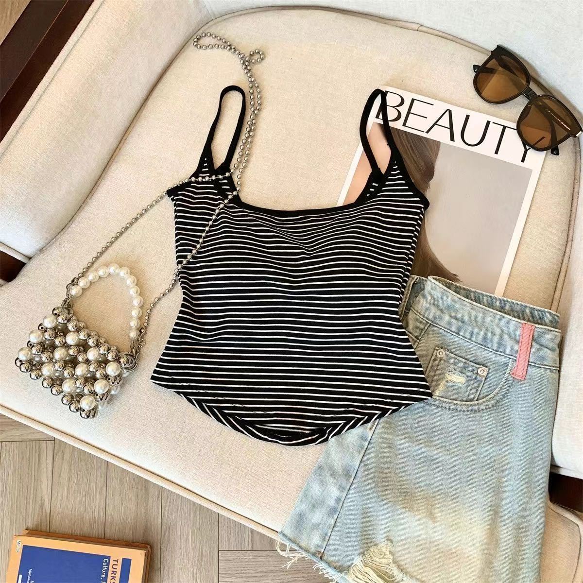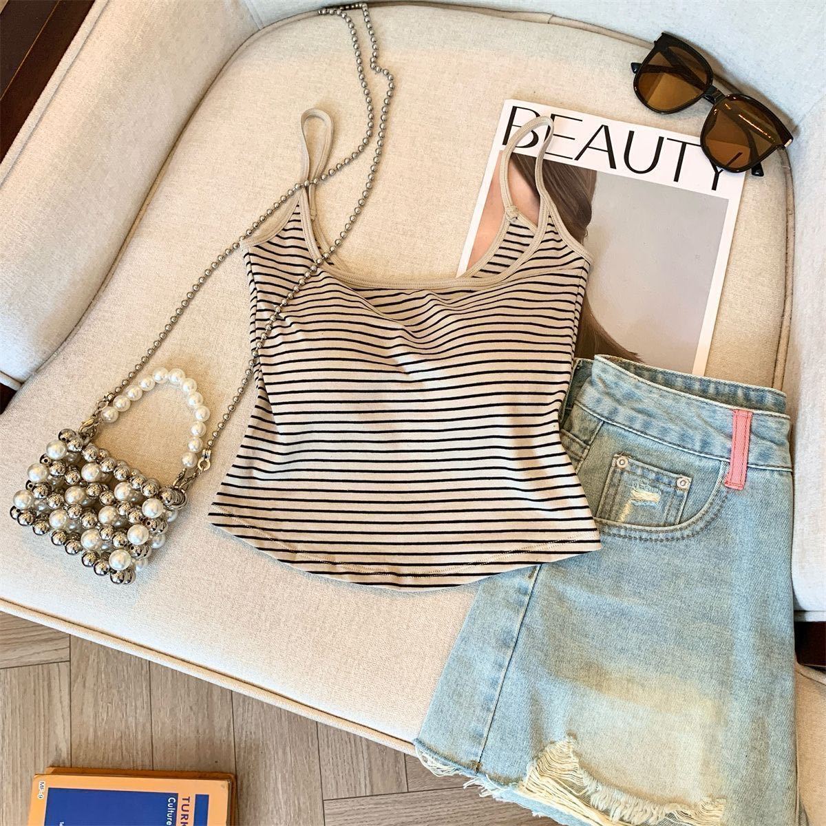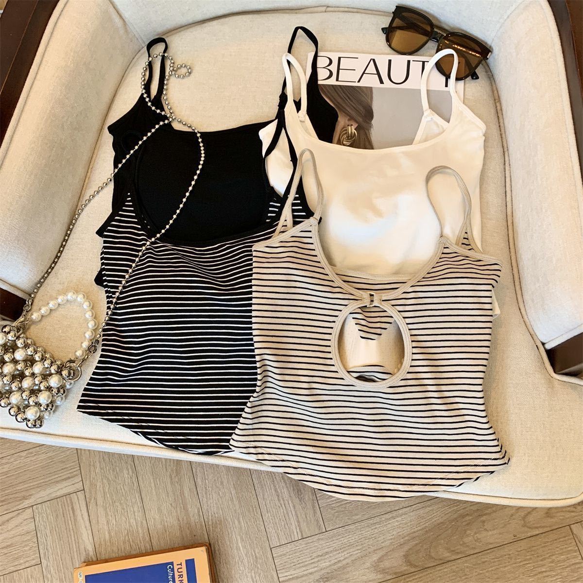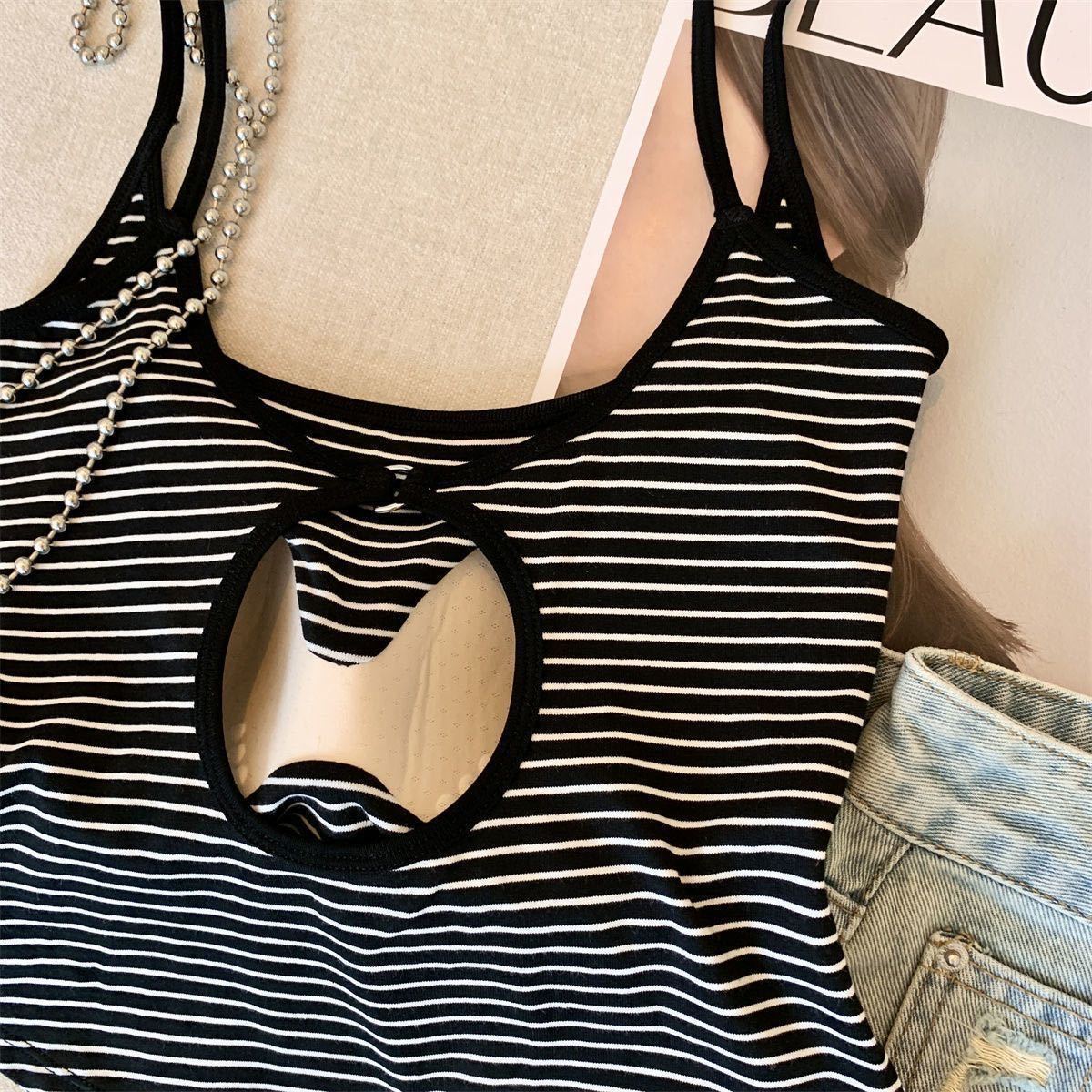 캐주얼하고 패셔너블한 스트라이프 멜빵, 메탈 중공 아름다운 등, 패셔너블하고 편안하며 가슴 패드가 있는 외부에 착용할 수 있는 작은 조끼스토어 가기