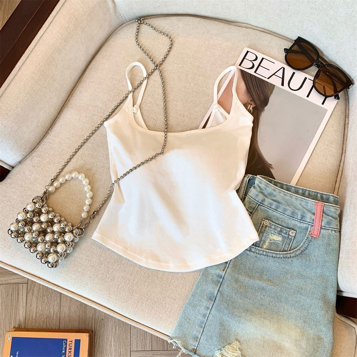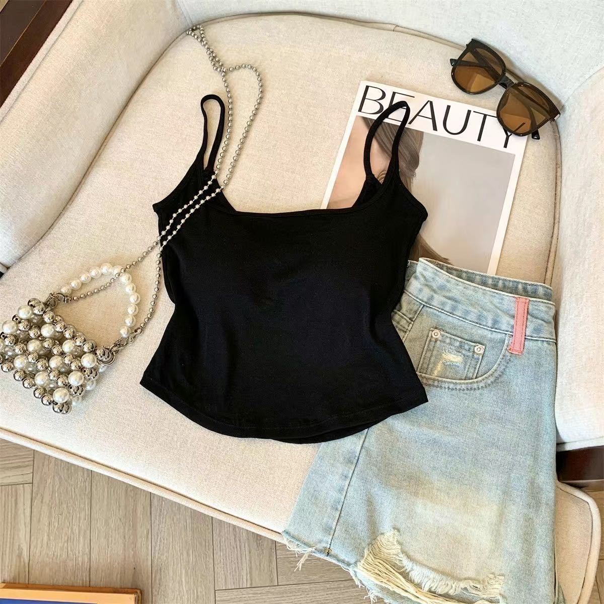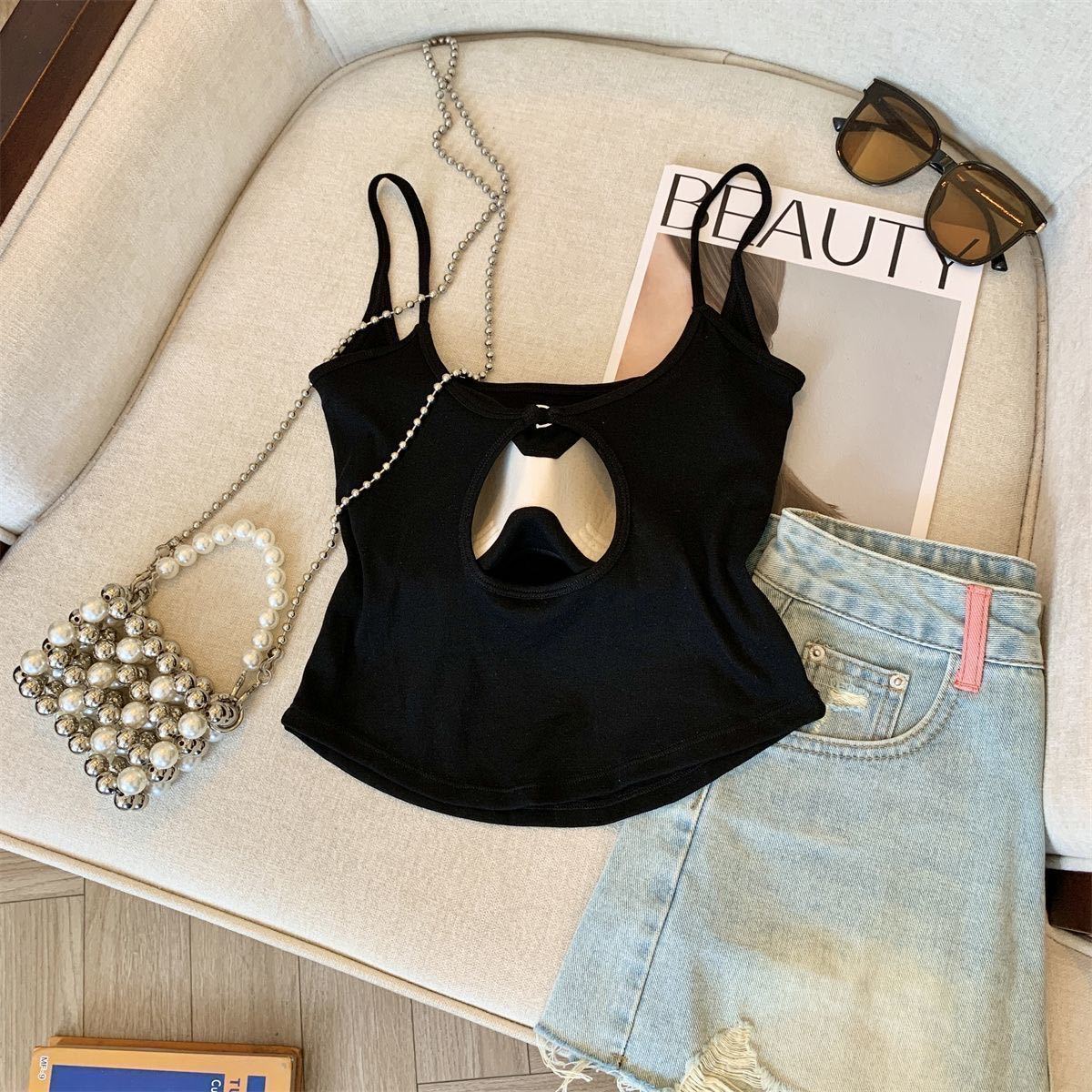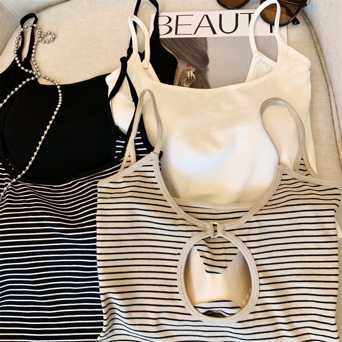 캐주얼하고 패셔너블한 스트라이프 멜빵, 메탈 중공 아름다운 등, 패셔너블하고 편안하며 가슴 패드가 있는 외부에 착용할 수 있는 작은 조끼스토어 가기