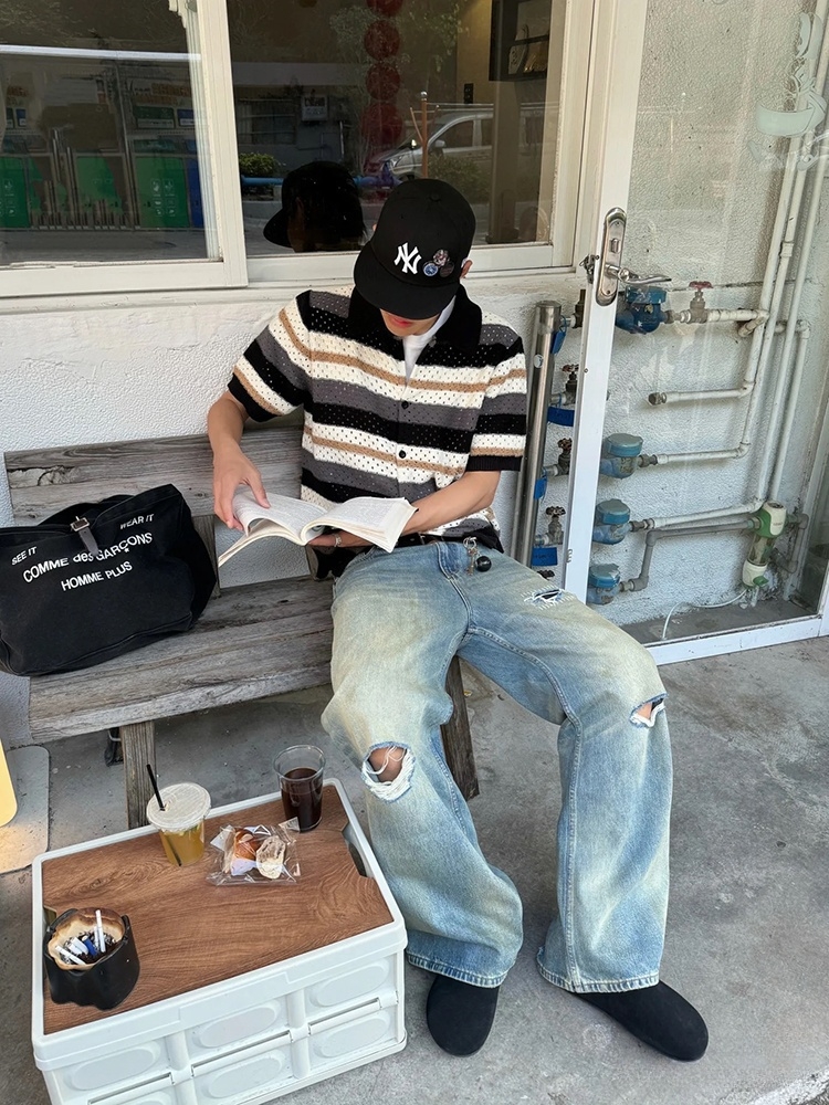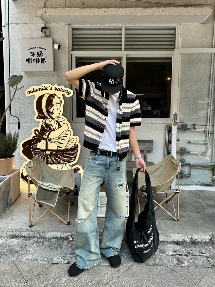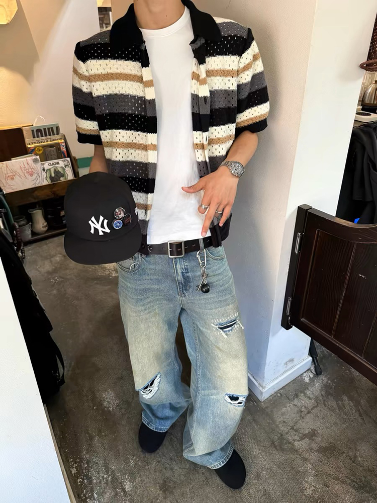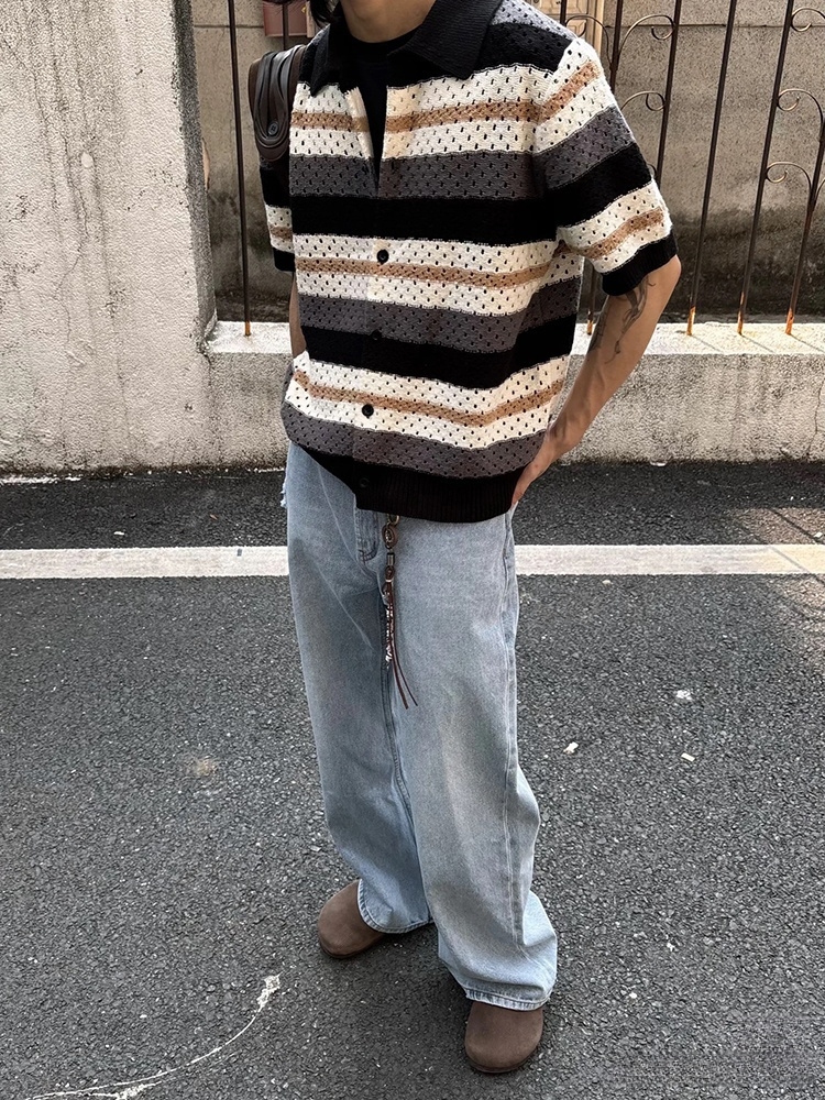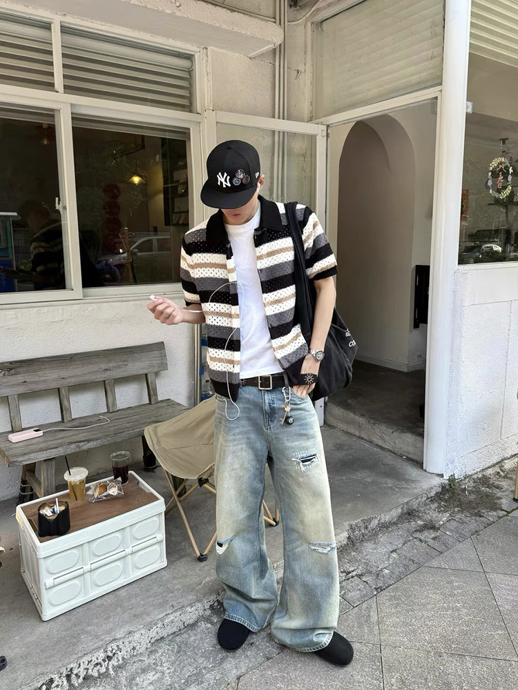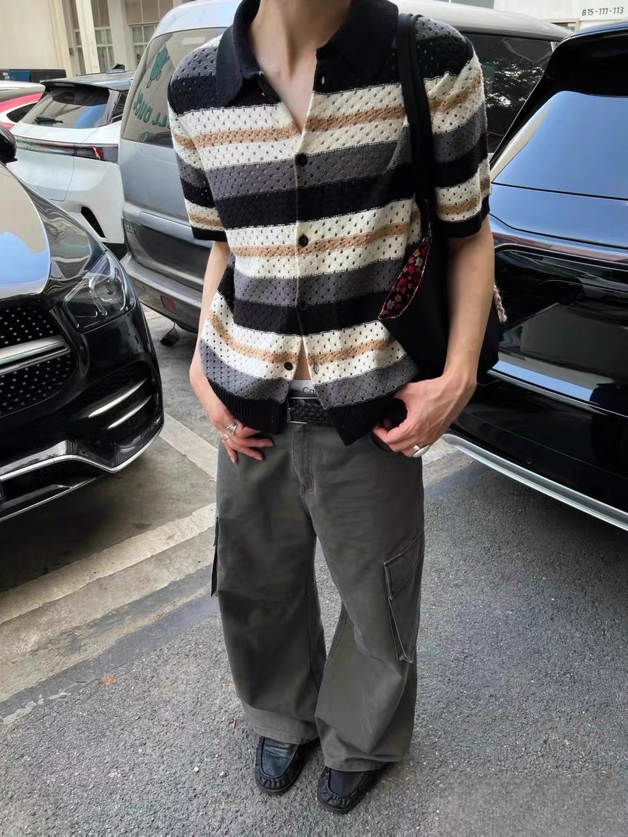 남성용 니치 트렌디 할로우 스트라이프 팽창 코튼 니트 반팔 가디건 여름 신작 올드 머니 스타일 숄더 박시 탑스토어 가기