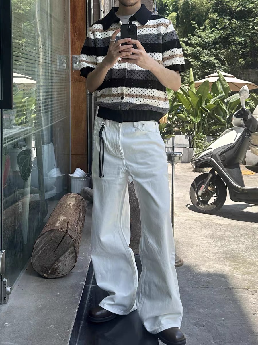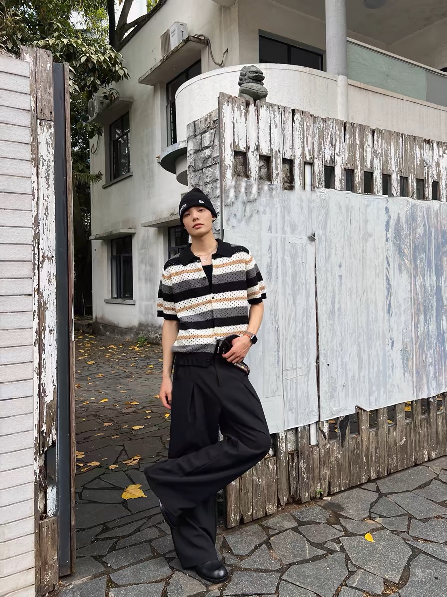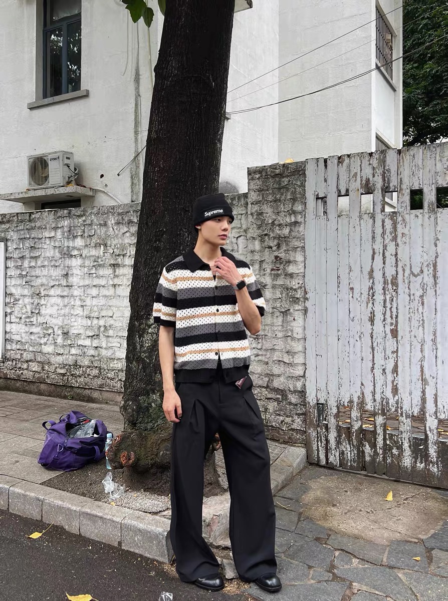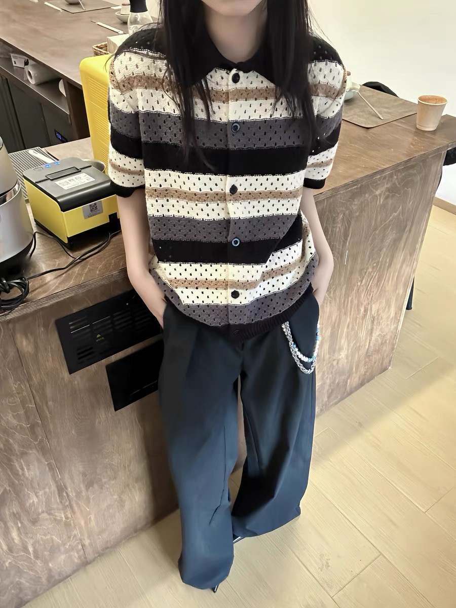 남성용 니치 트렌디 할로우 스트라이프 팽창 코튼 니트 반팔 가디건 여름 신작 올드 머니 스타일 숄더 박시 탑스토어 가기