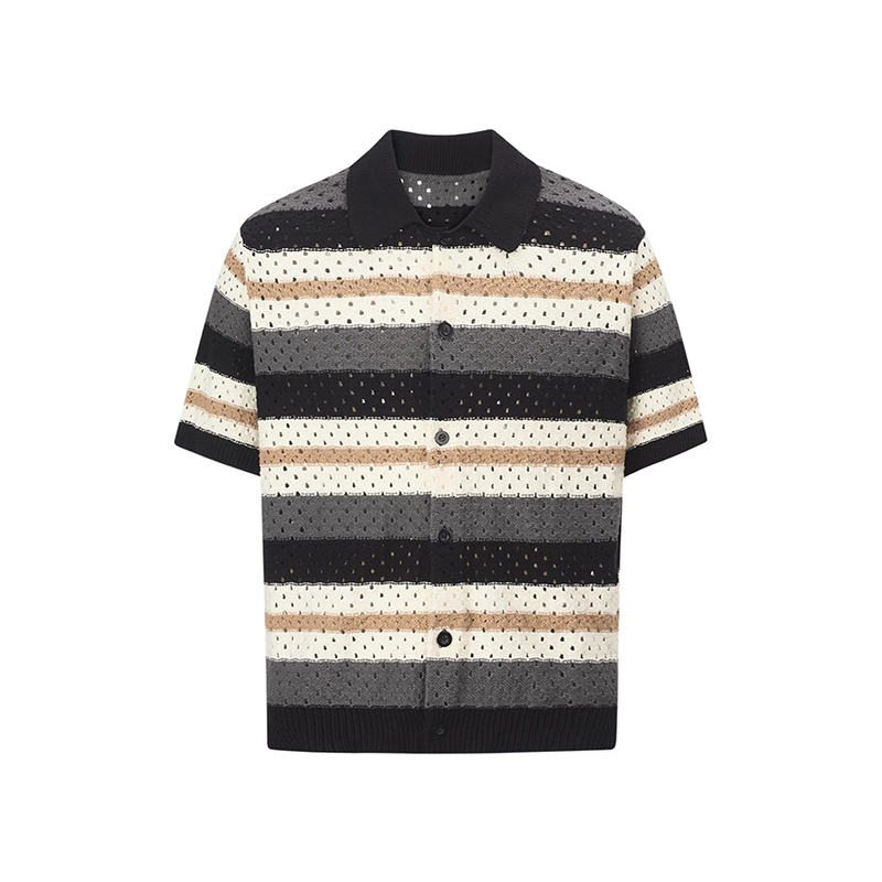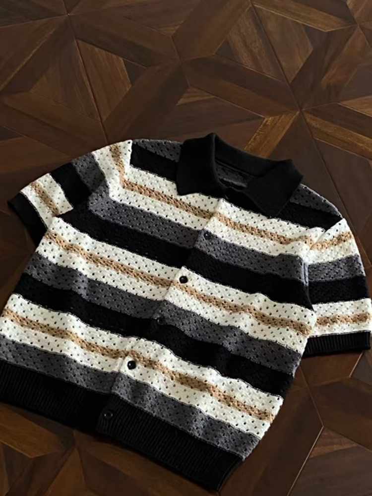 남성용 니치 트렌디 할로우 스트라이프 팽창 코튼 니트 반팔 가디건 여름 신작 올드 머니 스타일 숄더 박시 탑
