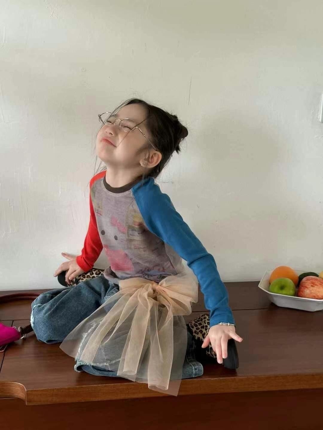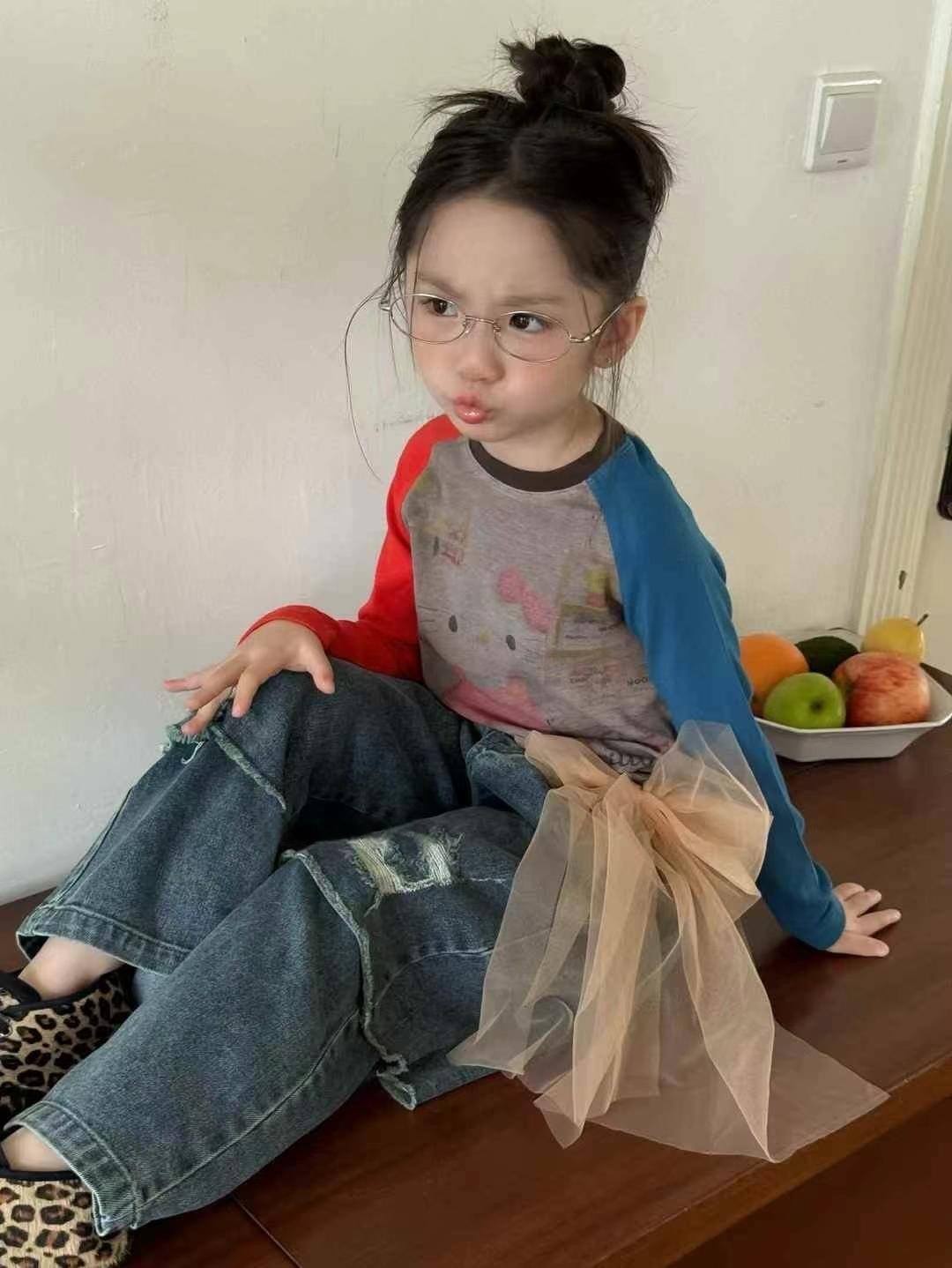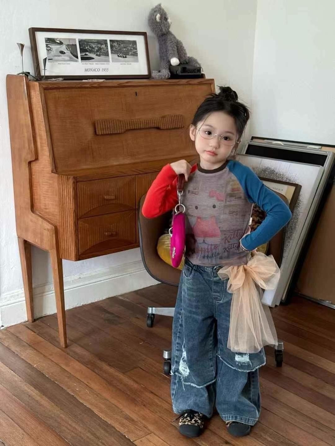 한국 아동복 여아 kt 고양이 긴팔 배색 티셔츠 25 신작 가을 아동용 바닥 셔츠 아름다운 서양식 탑 트렌디스토어 가기