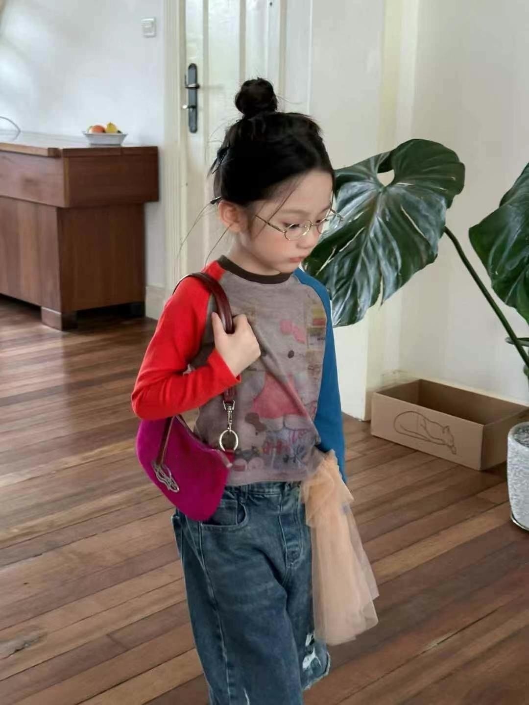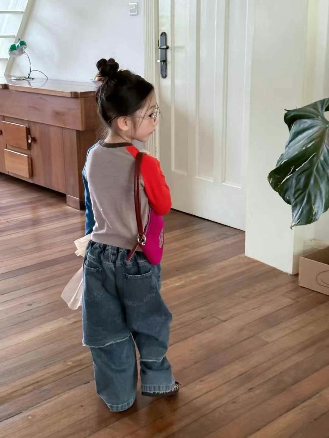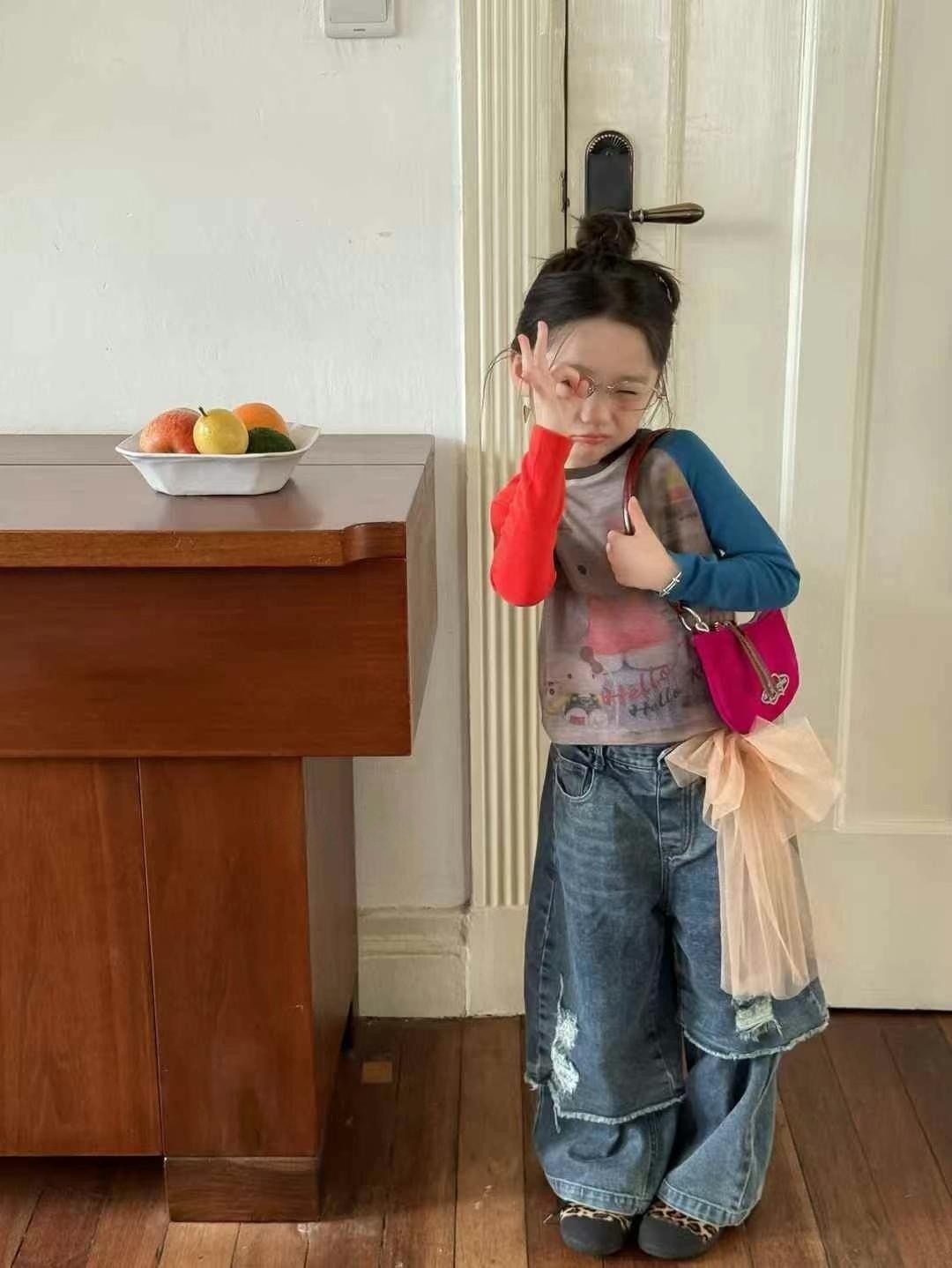 한국 아동복 여아 kt 고양이 긴팔 배색 티셔츠 25 신작 가을 아동용 바닥 셔츠 아름다운 서양식 탑 트렌디스토어 가기