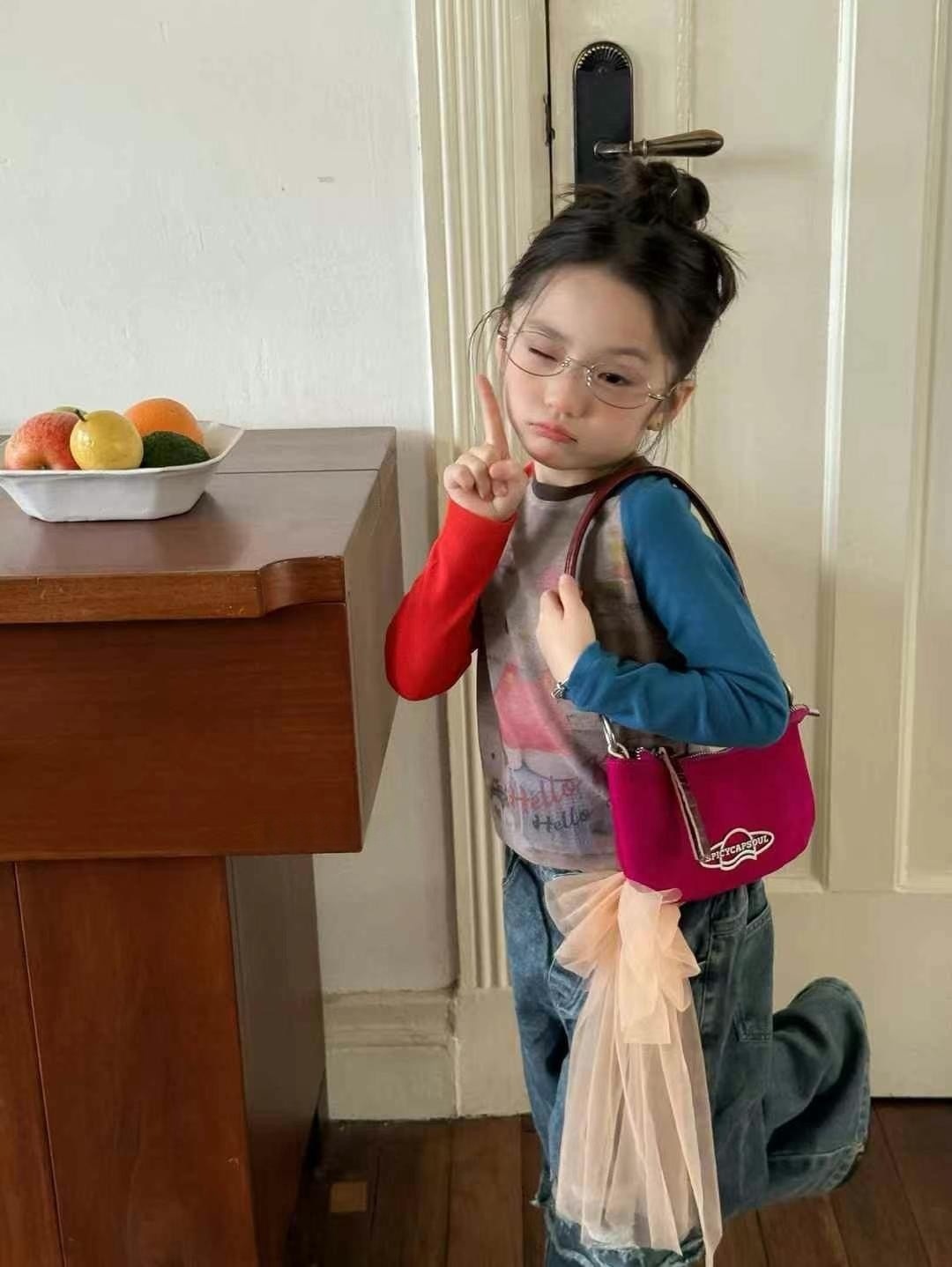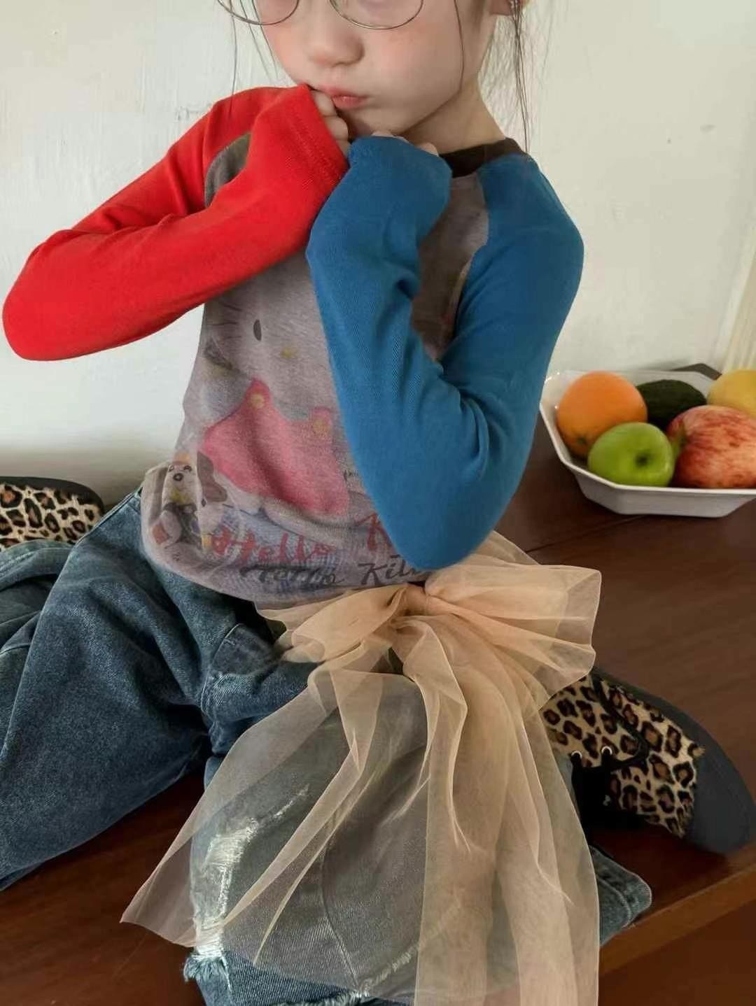 한국 아동복 여아 kt 고양이 긴팔 배색 티셔츠 25 신작 가을 아동용 바닥 셔츠 아름다운 서양식 탑 트렌디