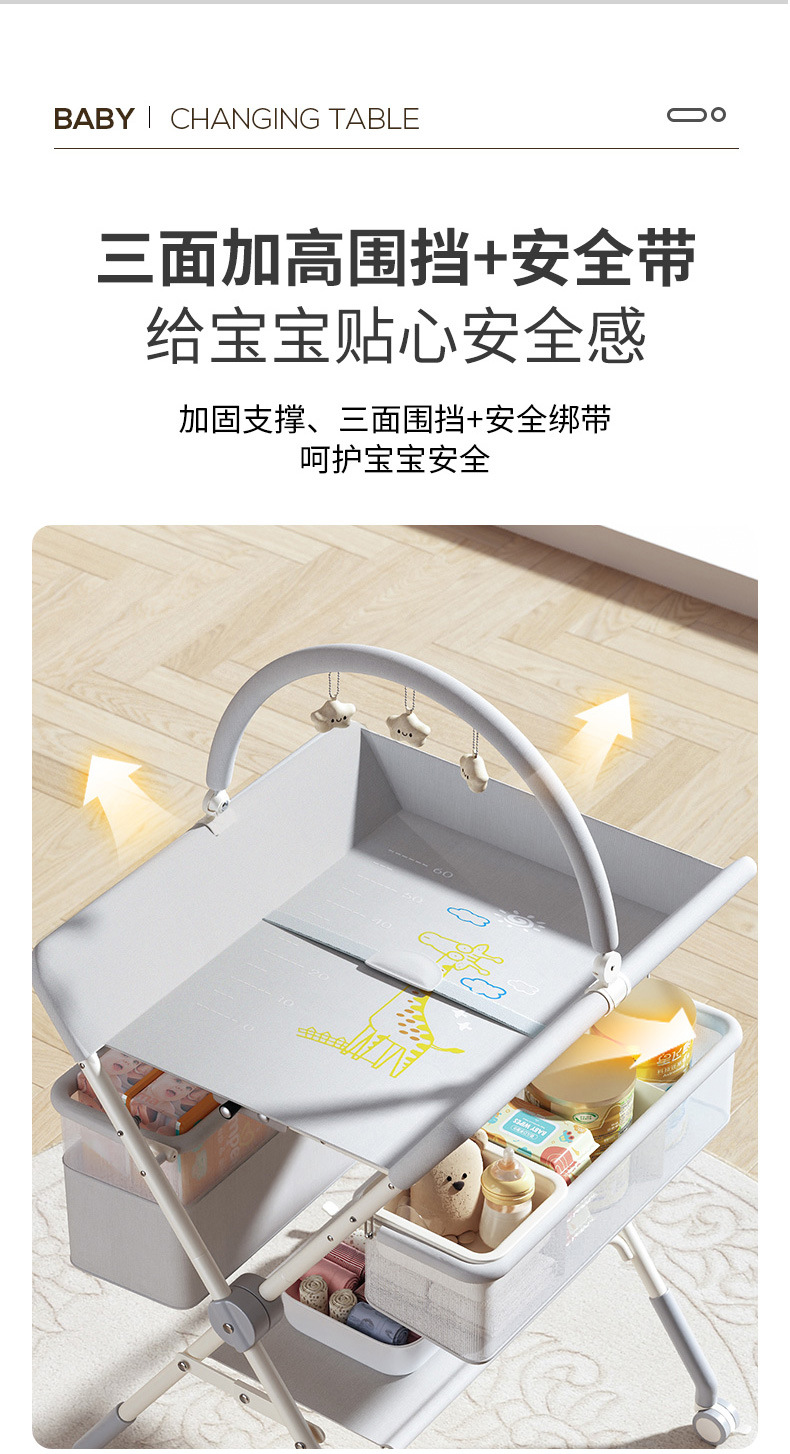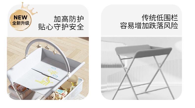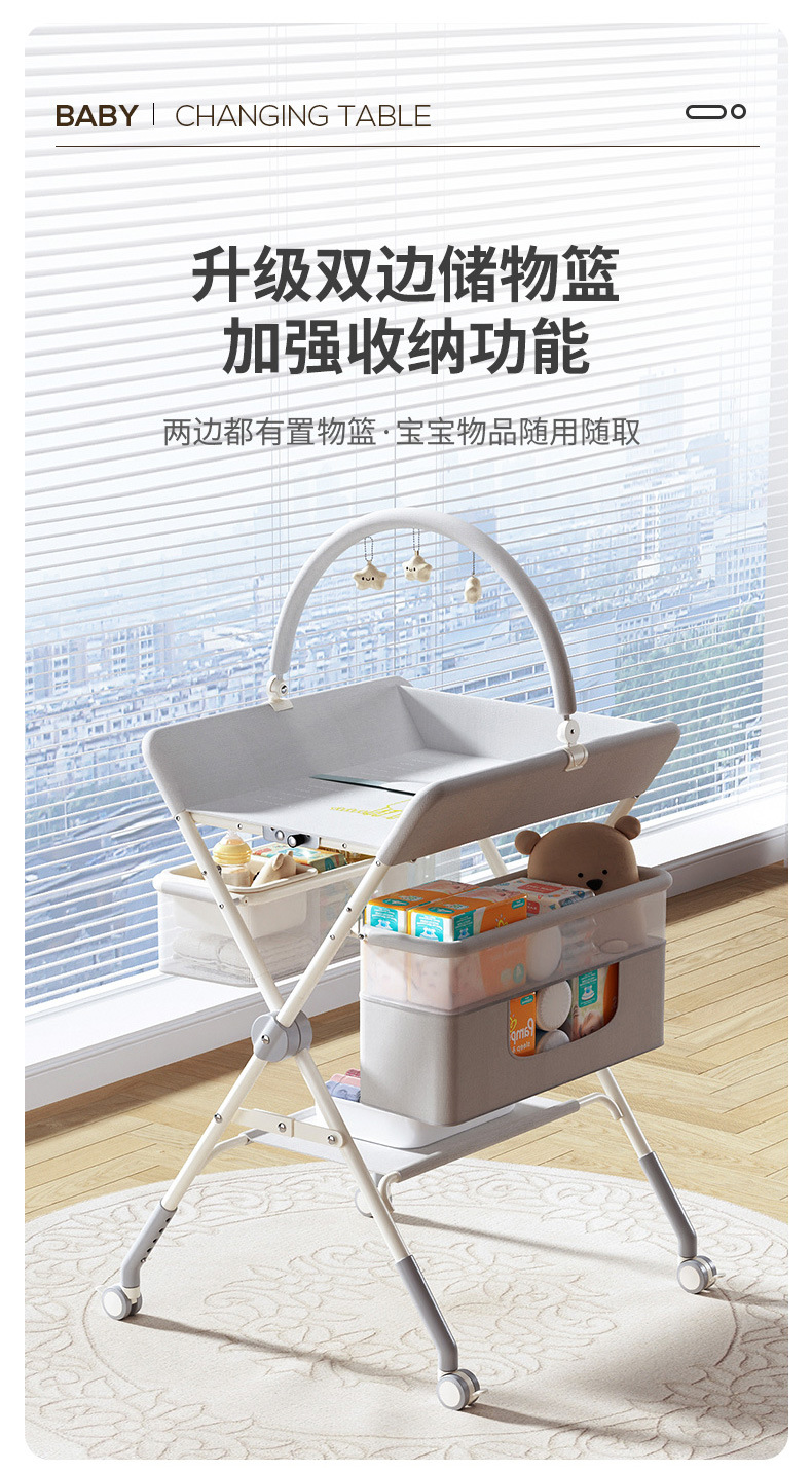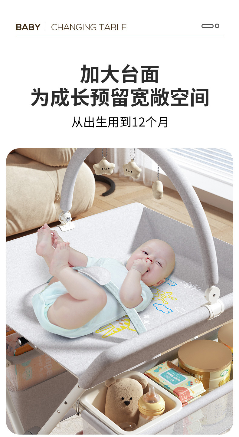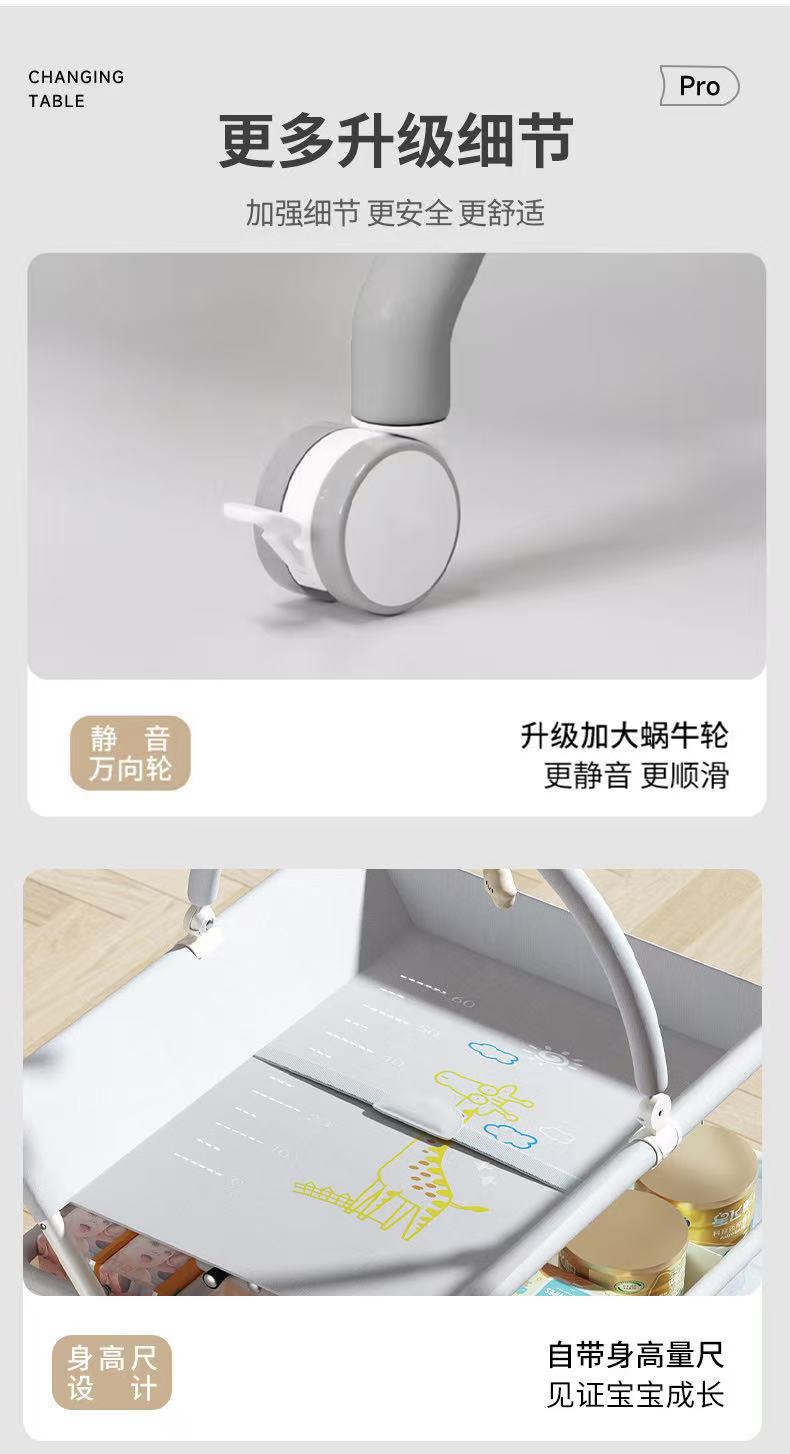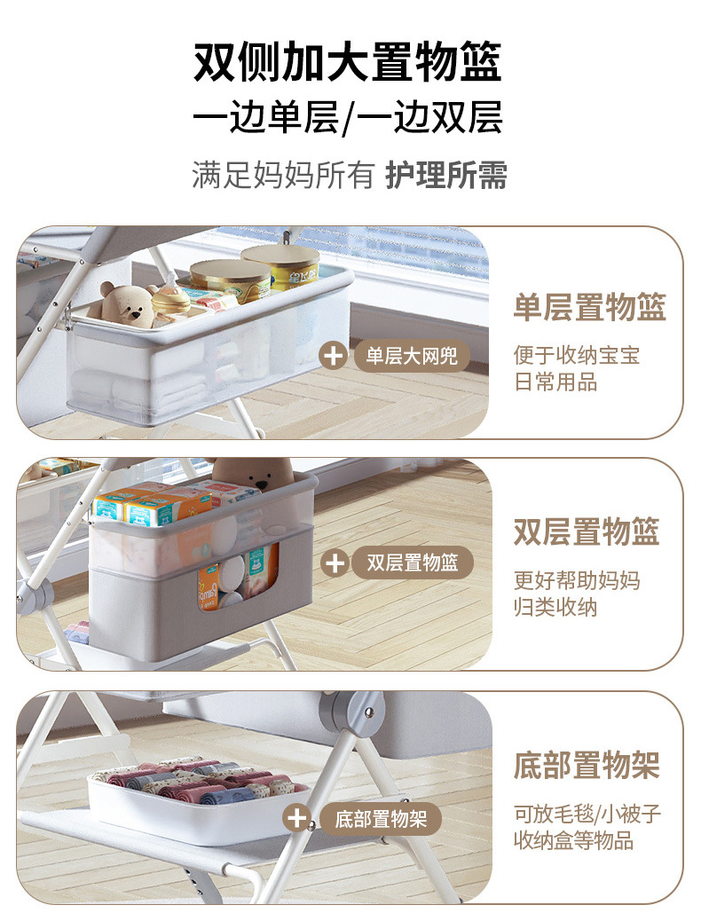 8、选配配件:可升降万向轮、单层侧兜、双层侧兜、玩具架、小水盆、隔尿垫、定型枕