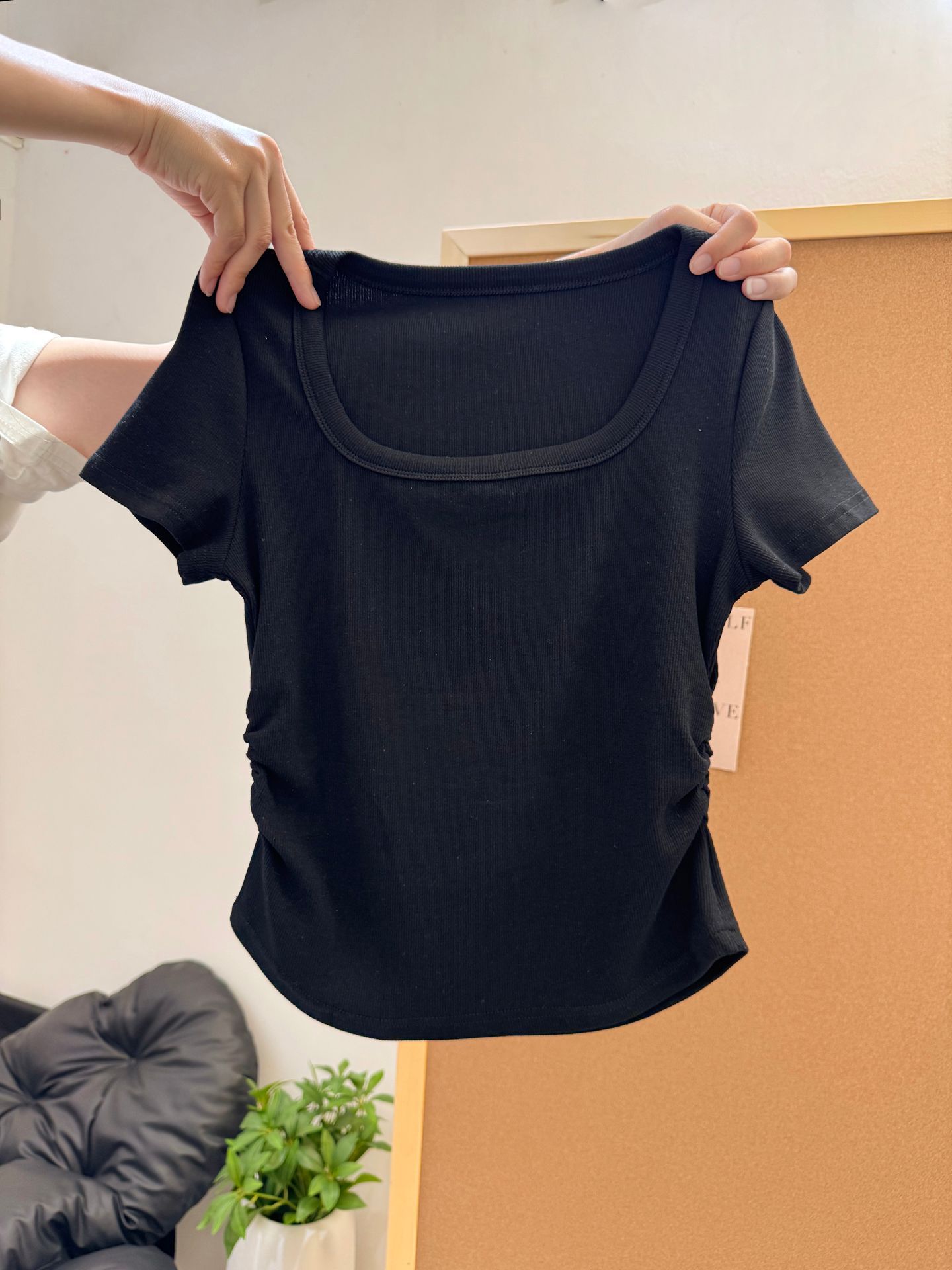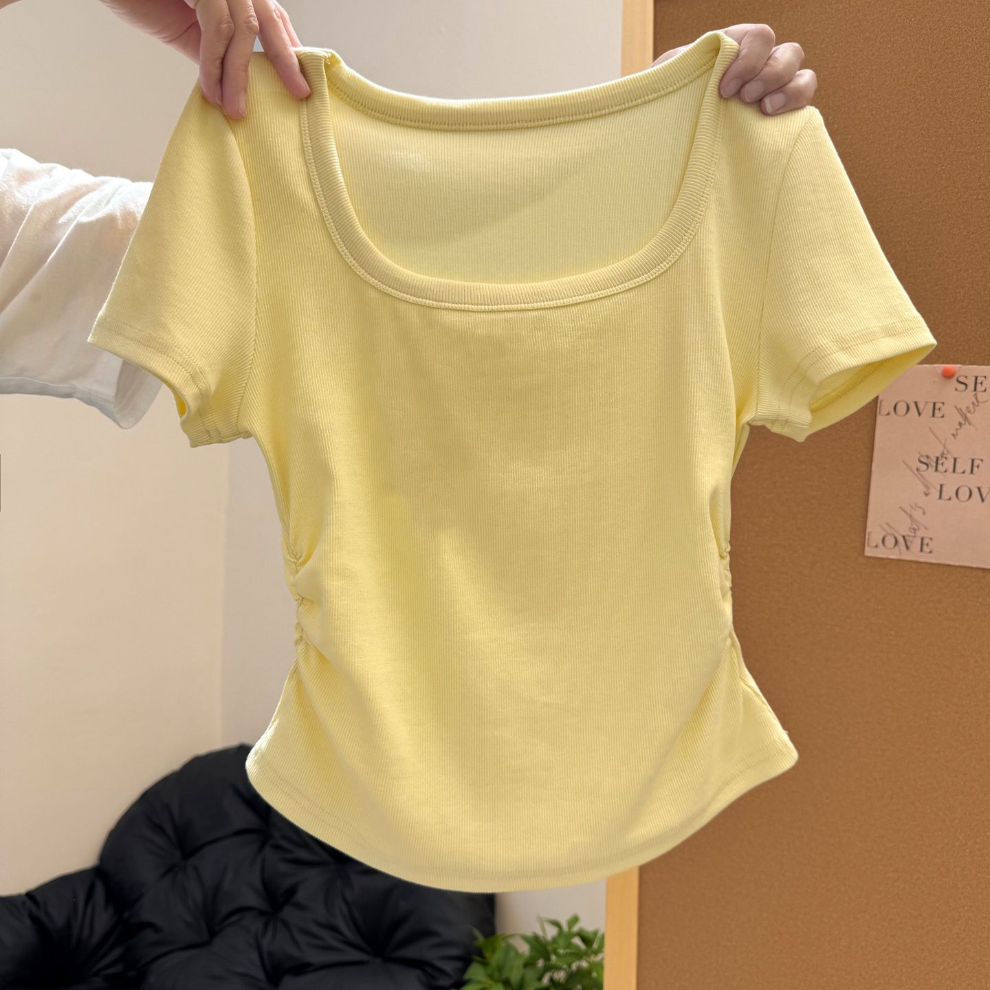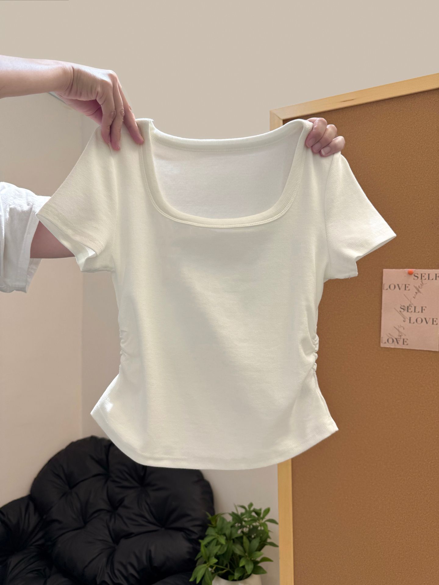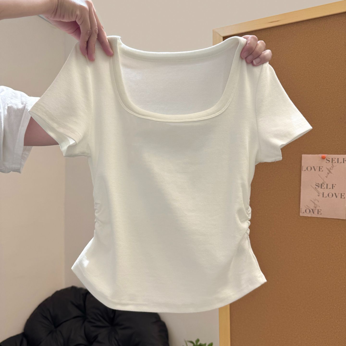 여름 여성용 스퀘어넥 숄더 반팔 티셔츠 슬림핏 한국 스타일 이너 레이어드 셔츠 쇼트 플리츠 웨이스트 반팔 탑스토어 가기