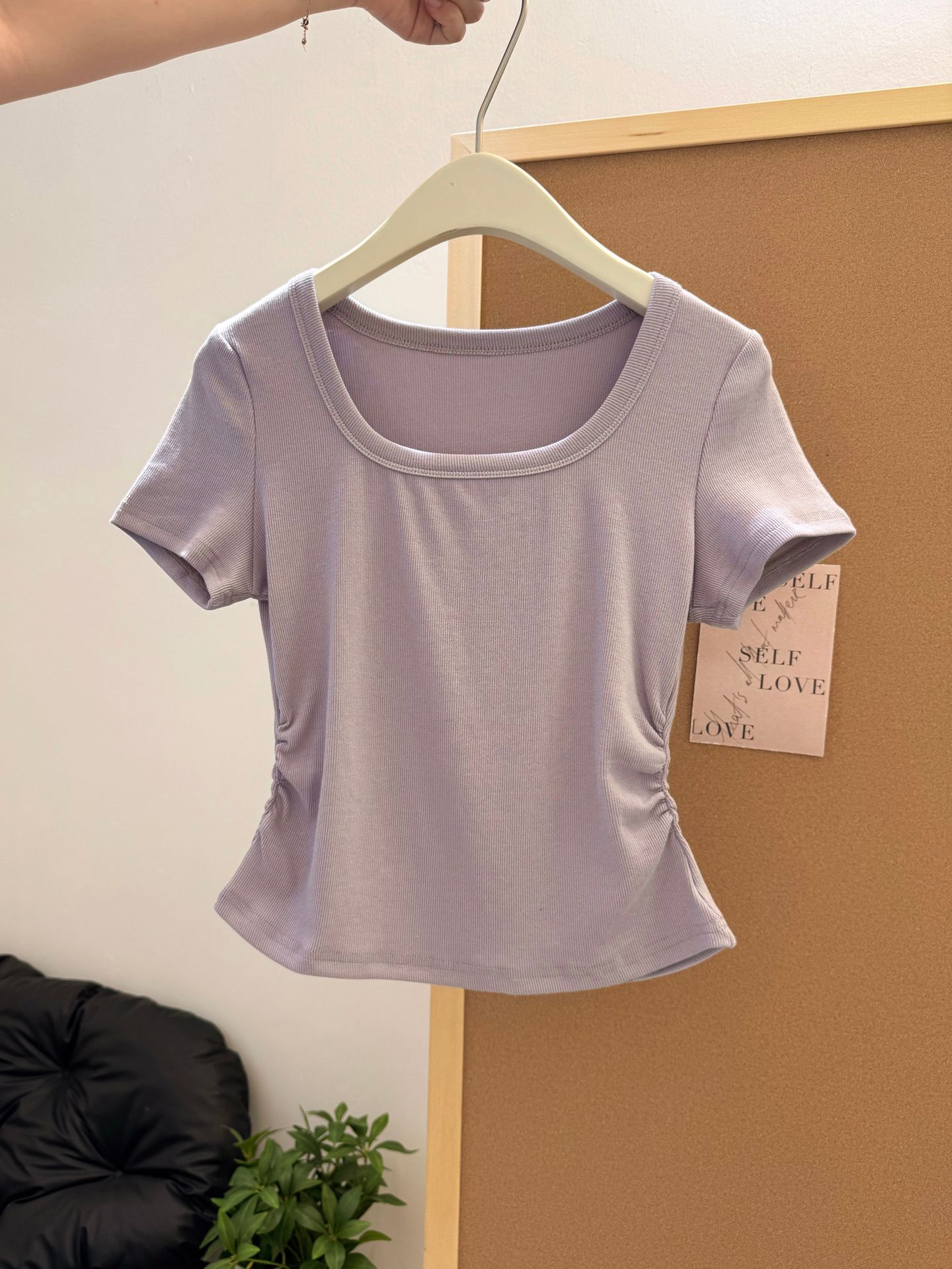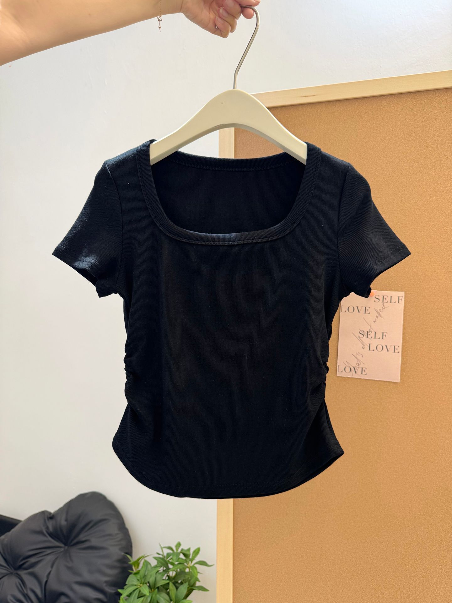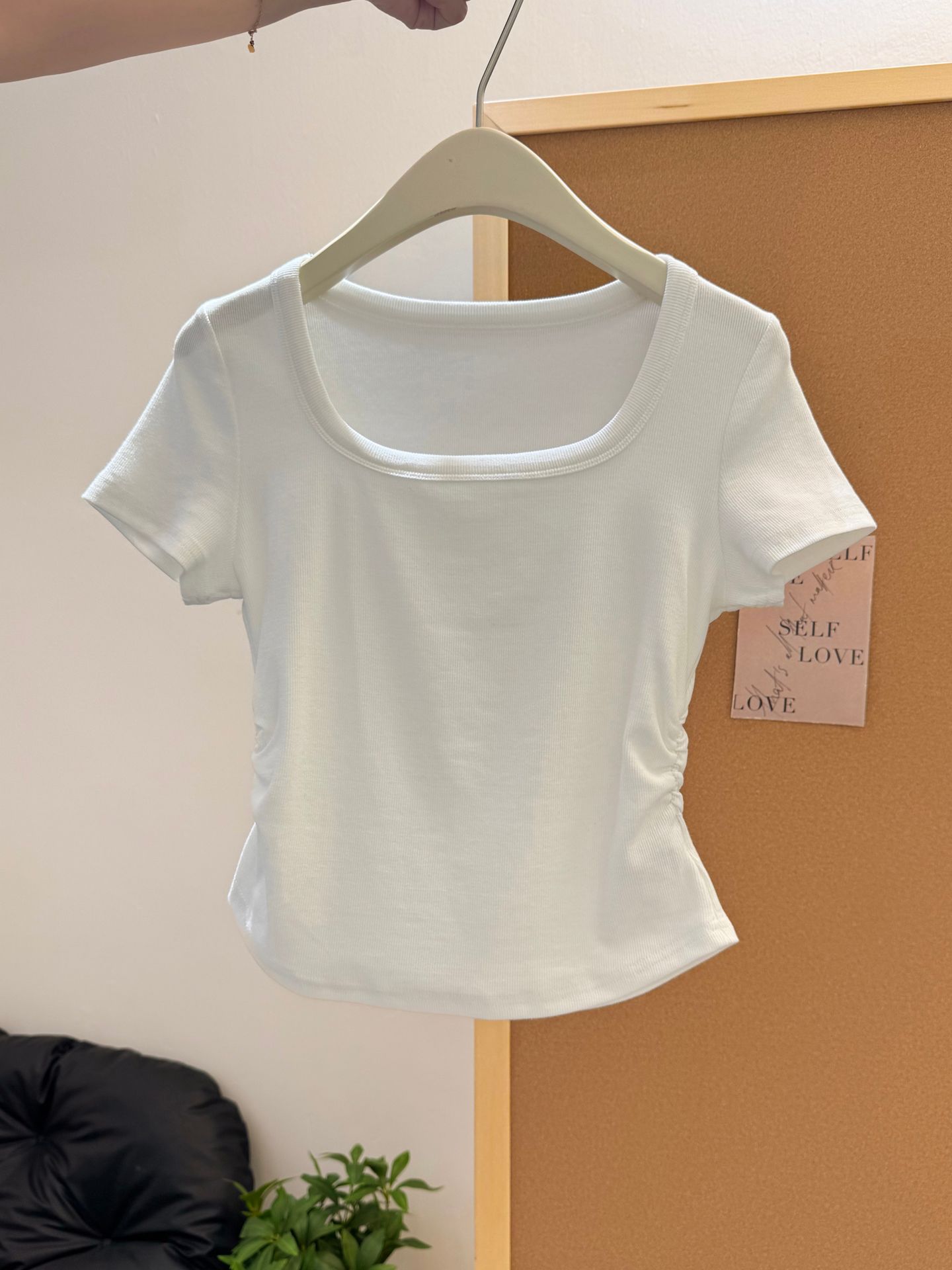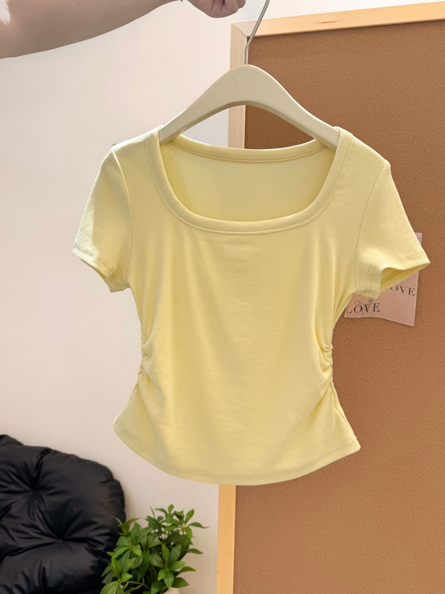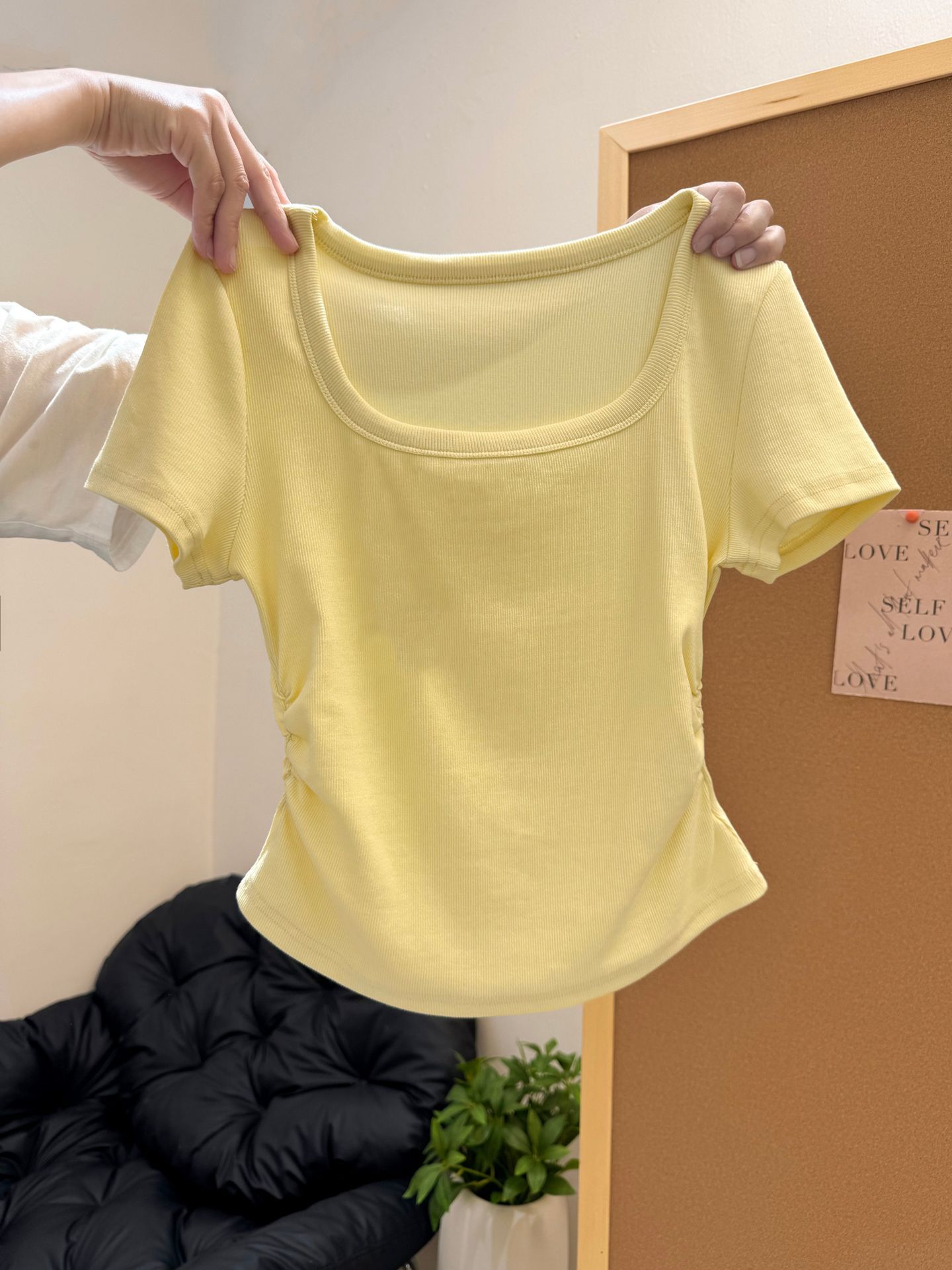 여름 여성용 스퀘어넥 숄더 반팔 티셔츠 슬림핏 한국 스타일 이너 레이어드 셔츠 쇼트 플리츠 웨이스트 반팔 탑스토어 가기
