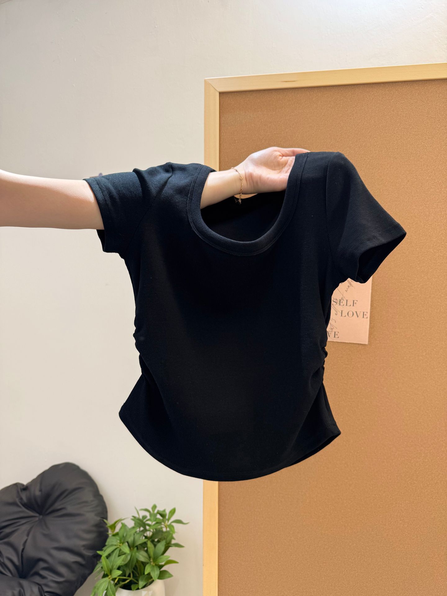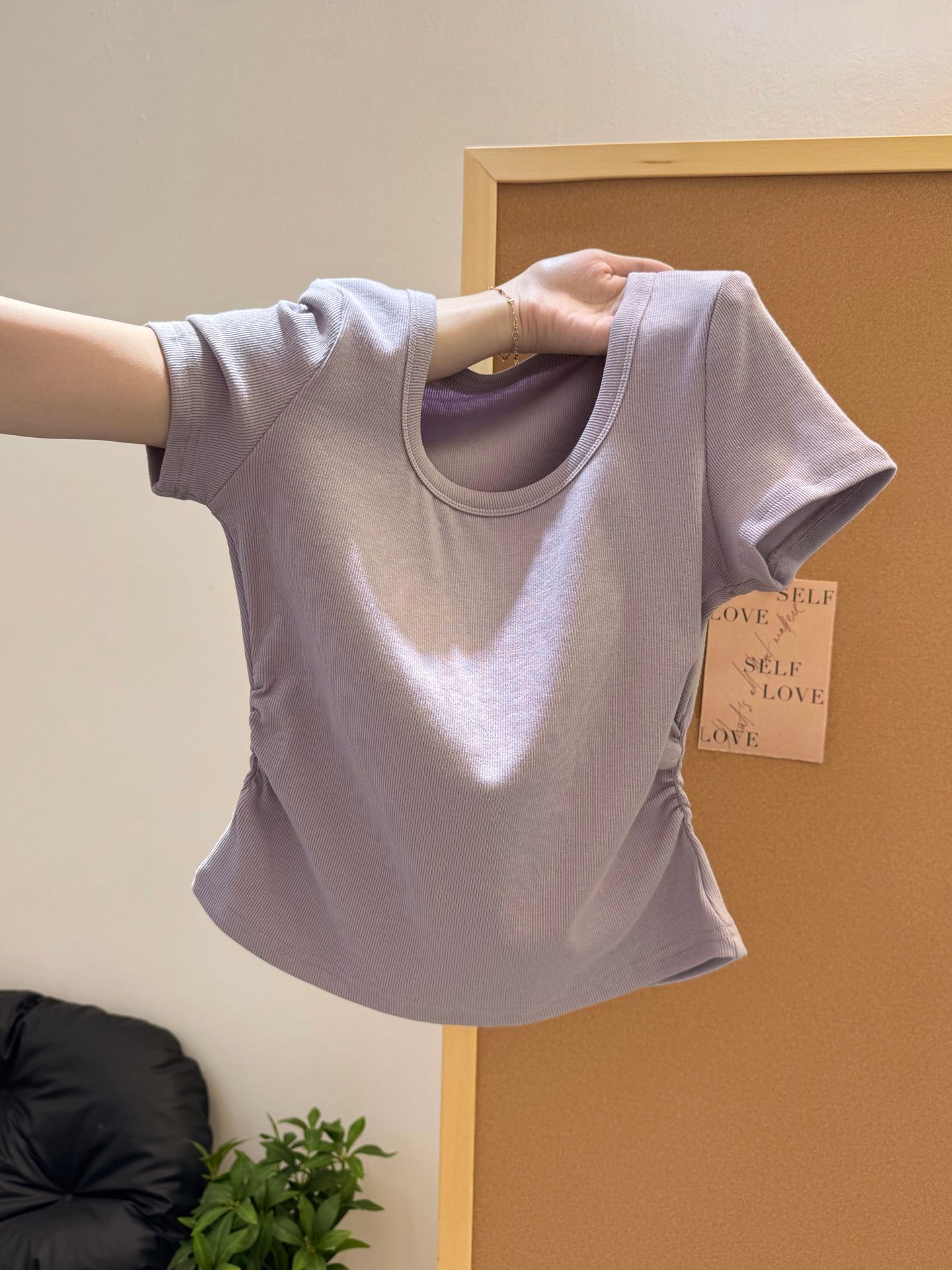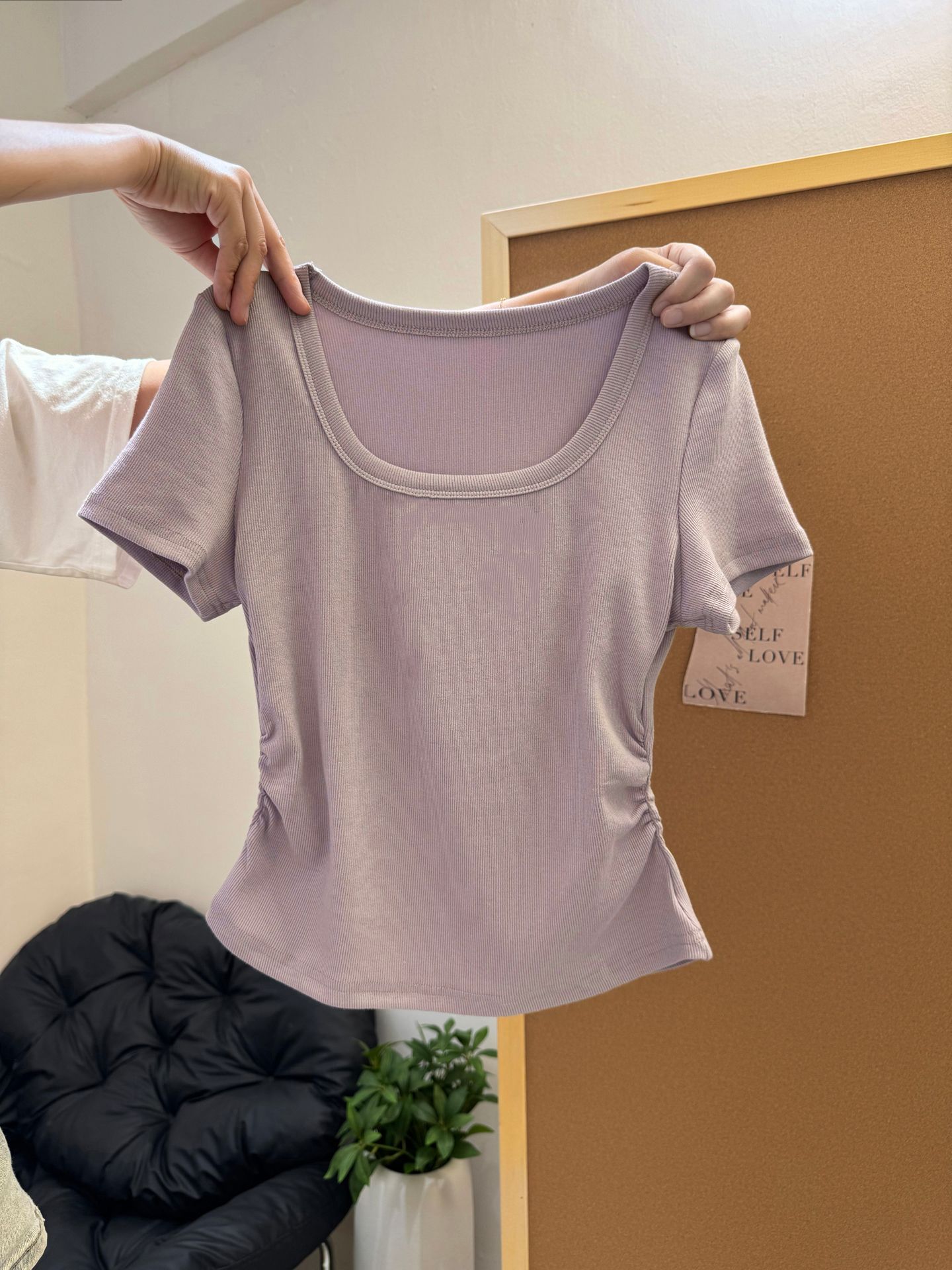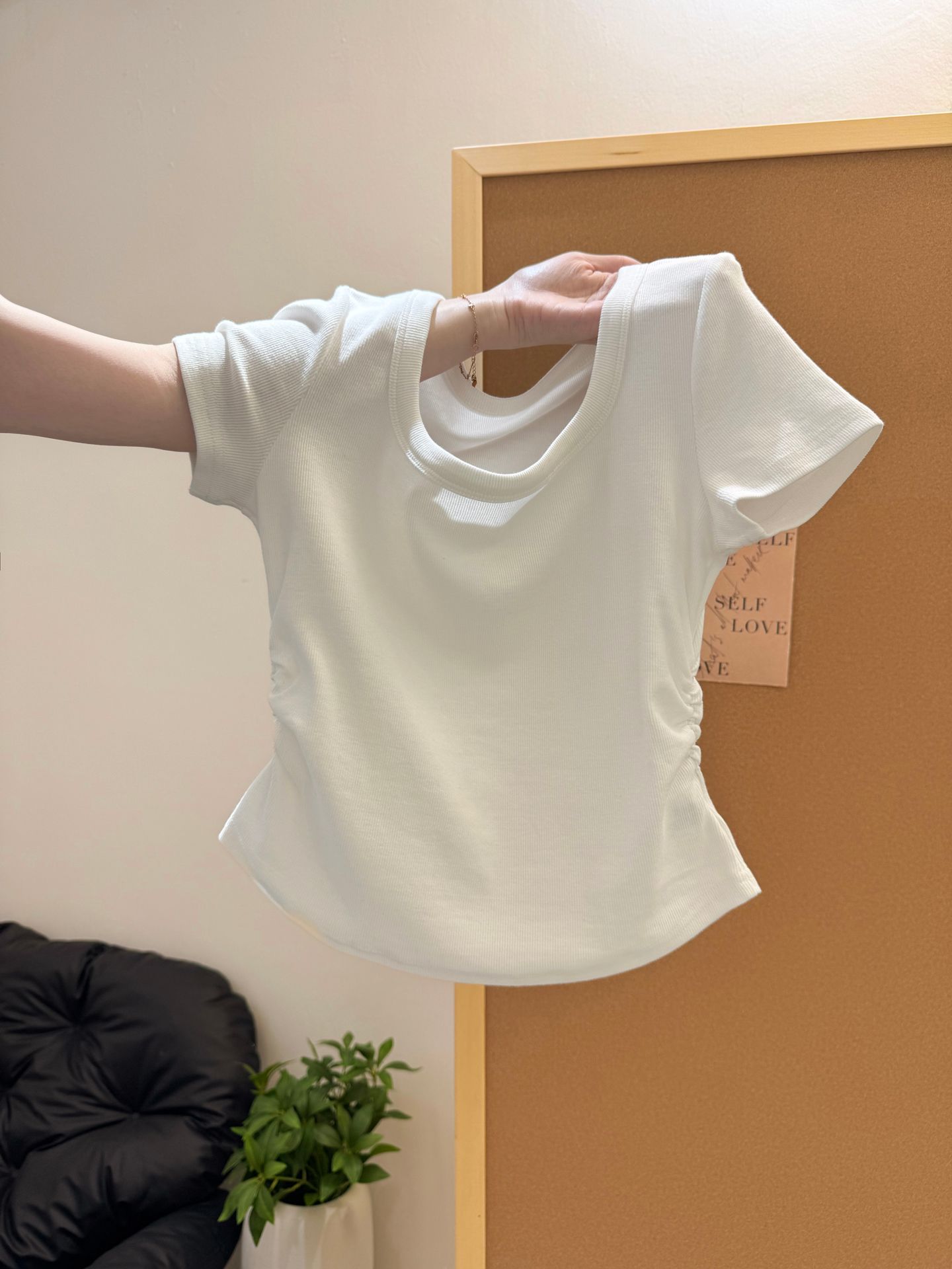 여름 여성용 스퀘어넥 숄더 반팔 티셔츠 슬림핏 한국 스타일 이너 레이어드 셔츠 쇼트 플리츠 웨이스트 반팔 탑스토어 가기