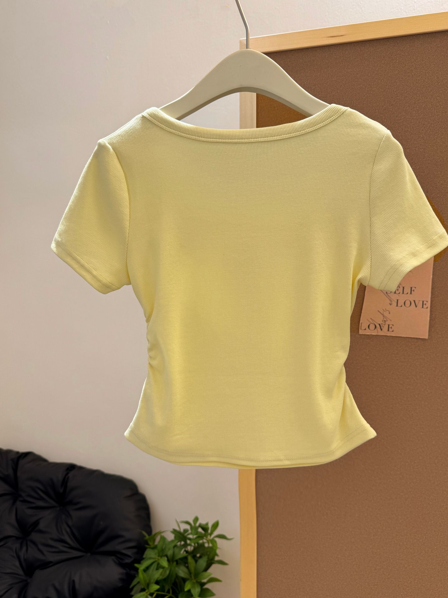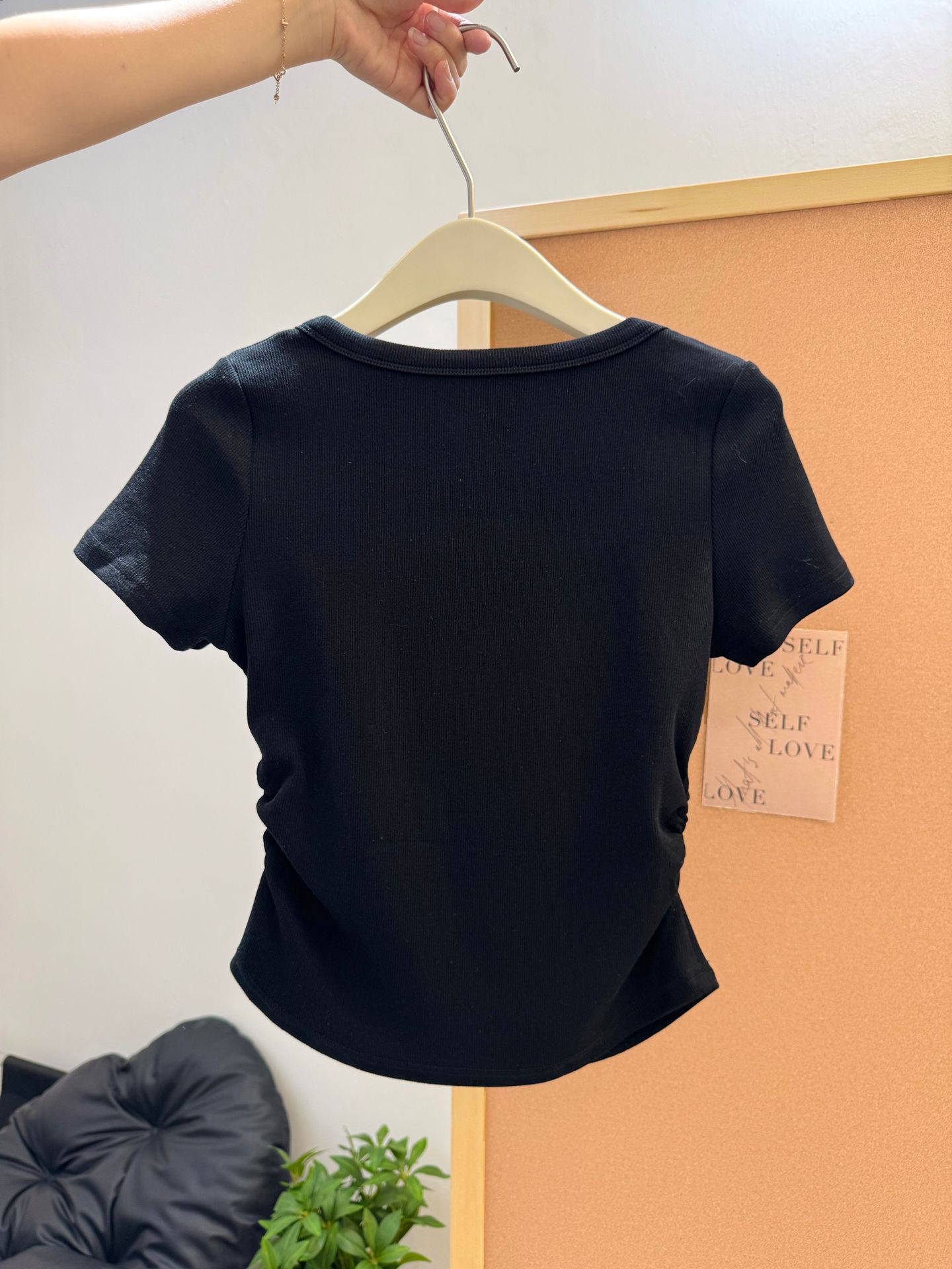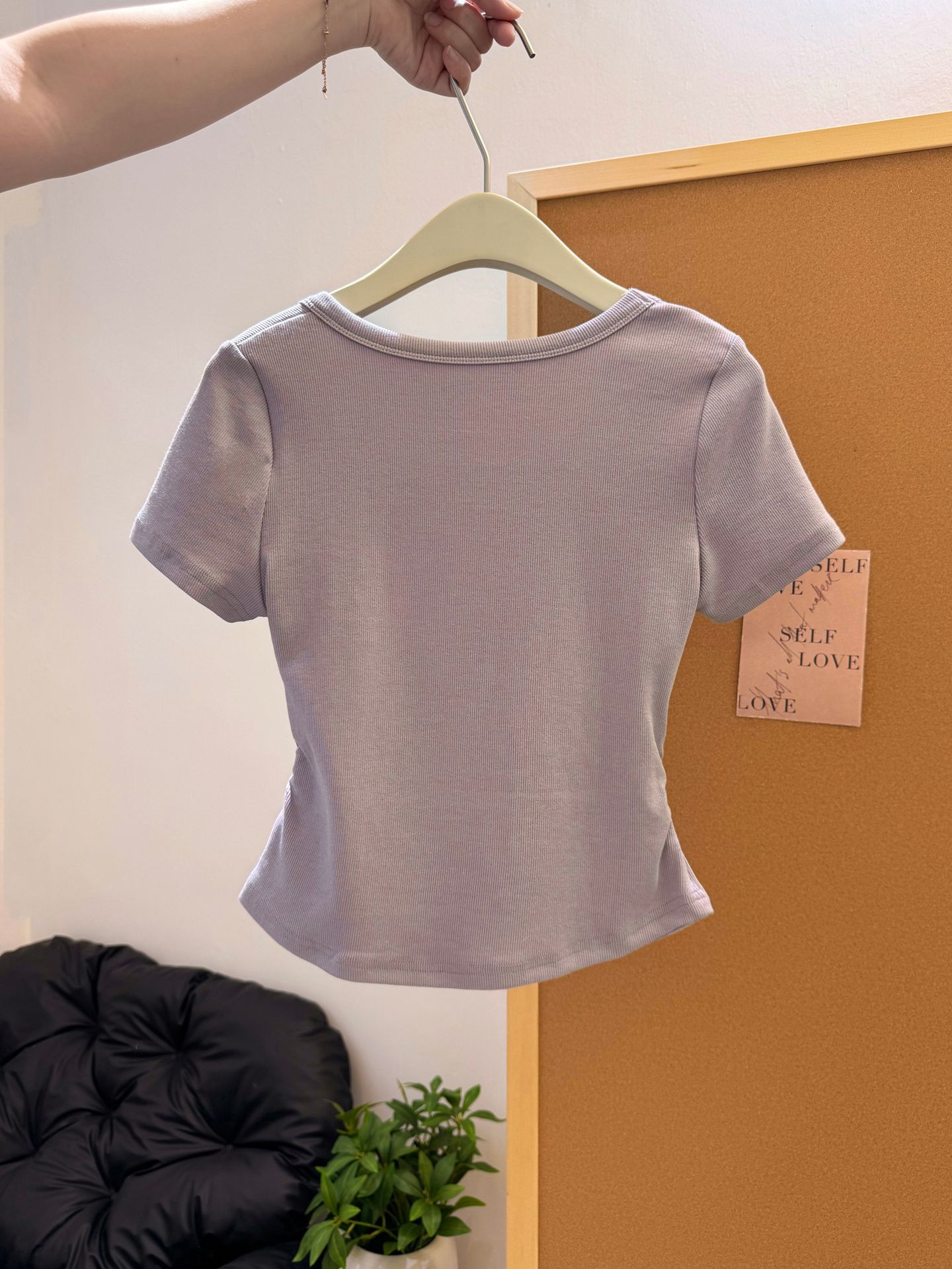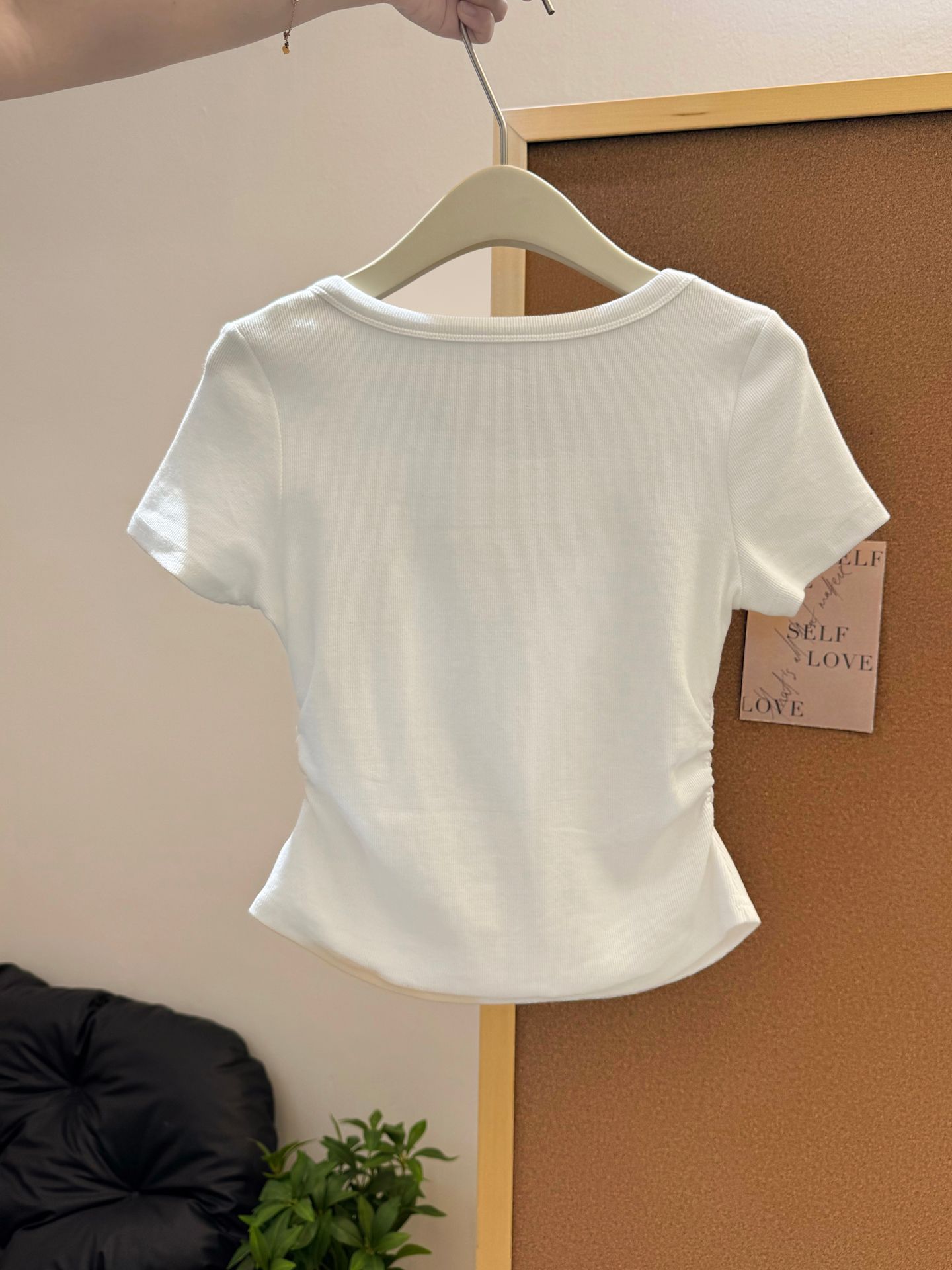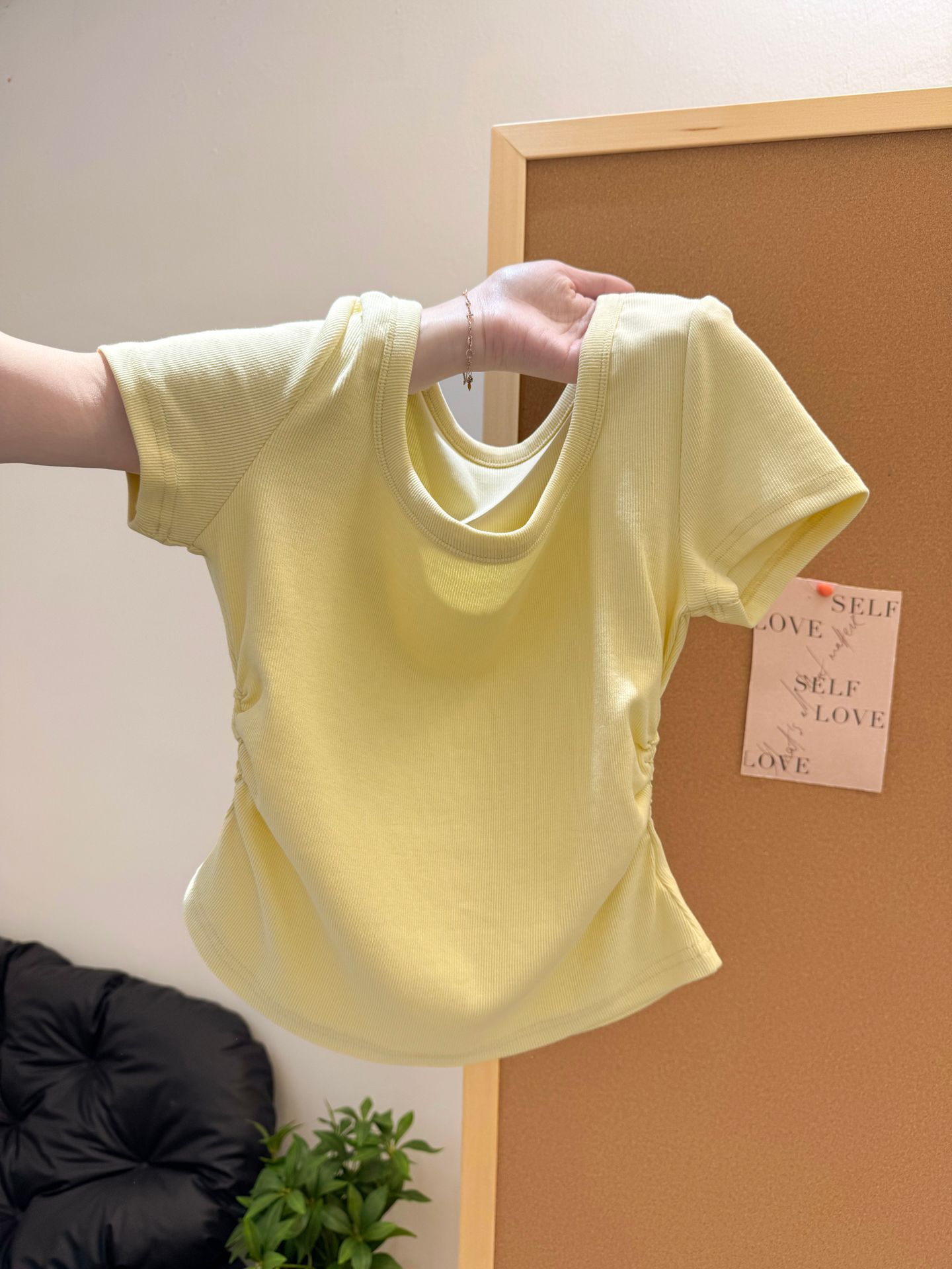 여름 여성용 스퀘어넥 숄더 반팔 티셔츠 슬림핏 한국 스타일 이너 레이어드 셔츠 쇼트 플리츠 웨이스트 반팔 탑스토어 가기