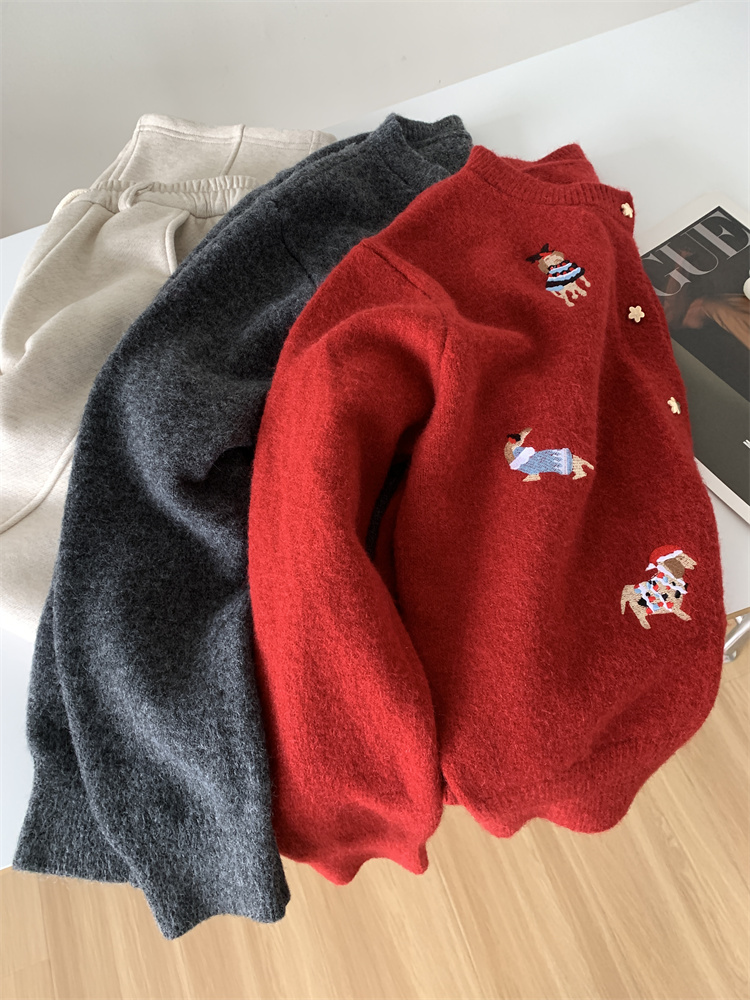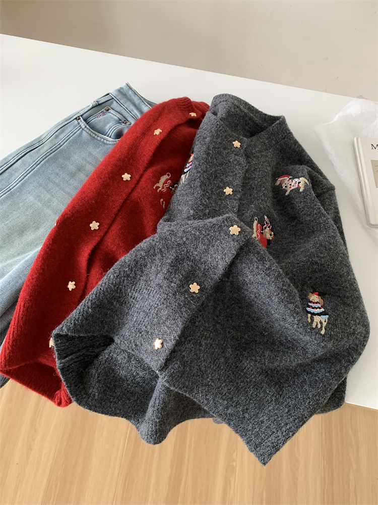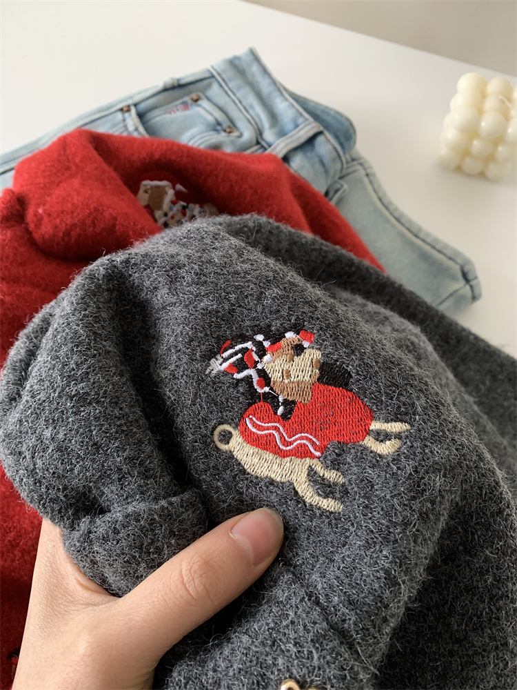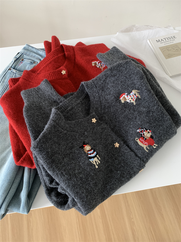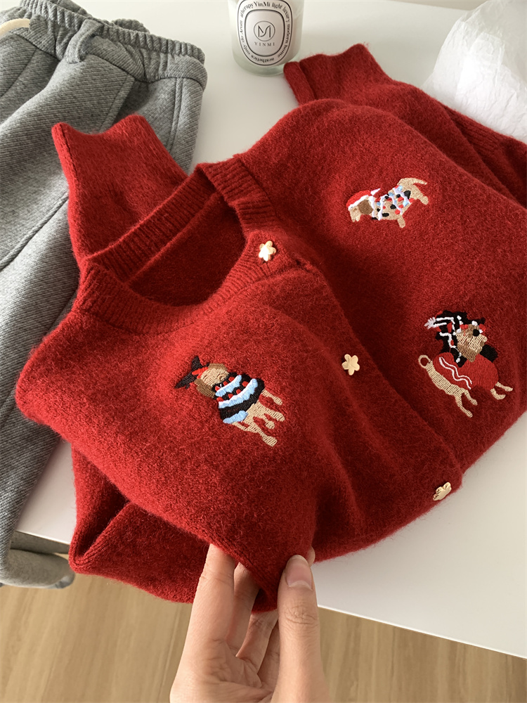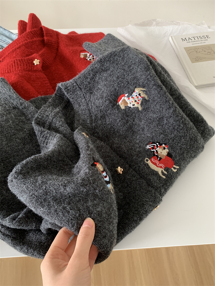 레트로 중공업 자수 크리스마스 빨간 강아지 니트 카디건 여성 디자인 오각형 버튼 스웨터 재킷 겨울스토어 가기