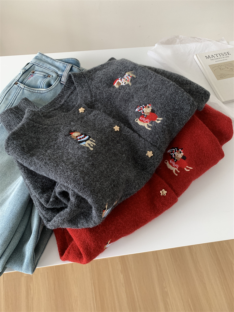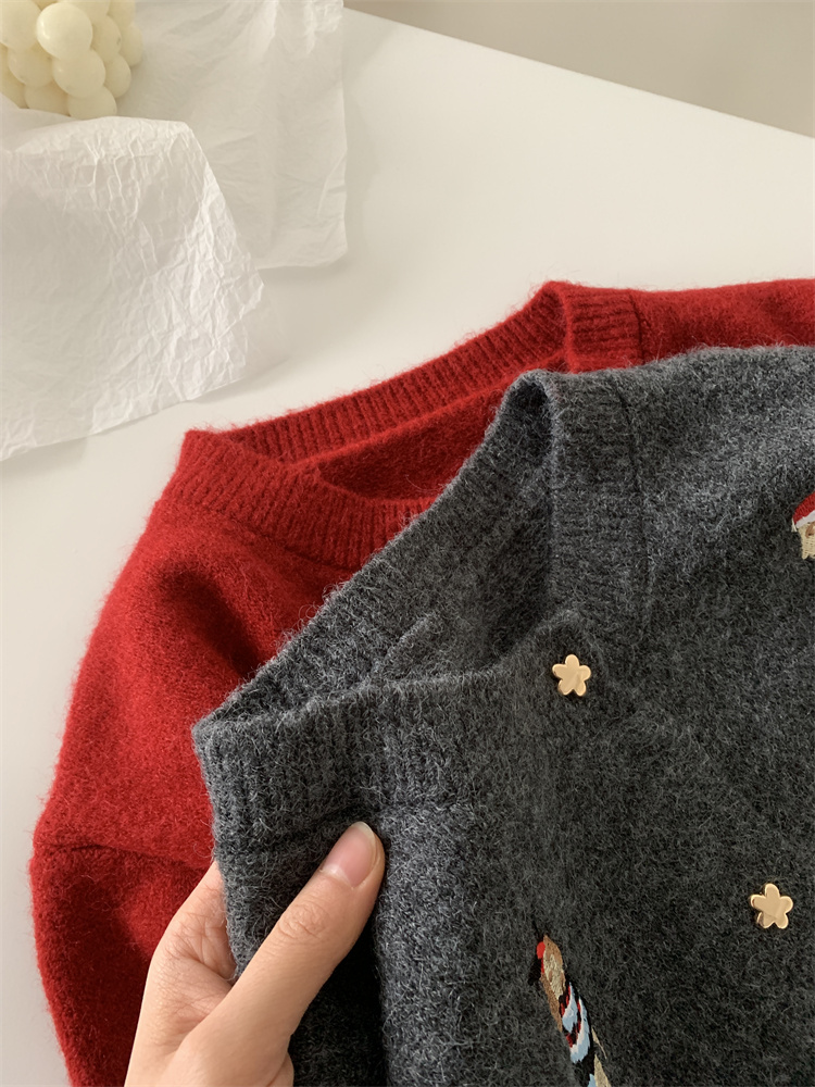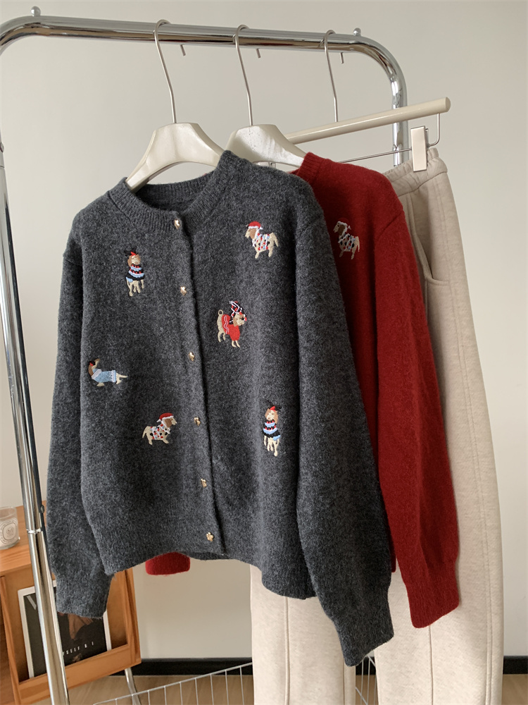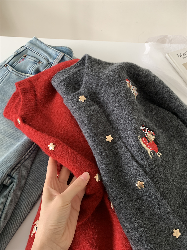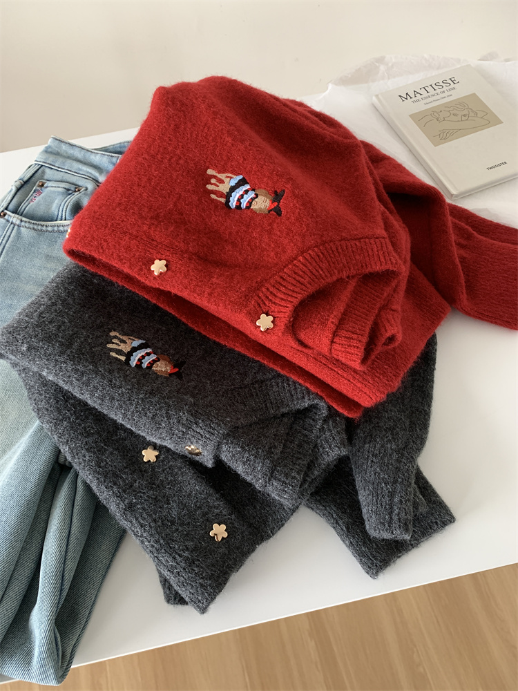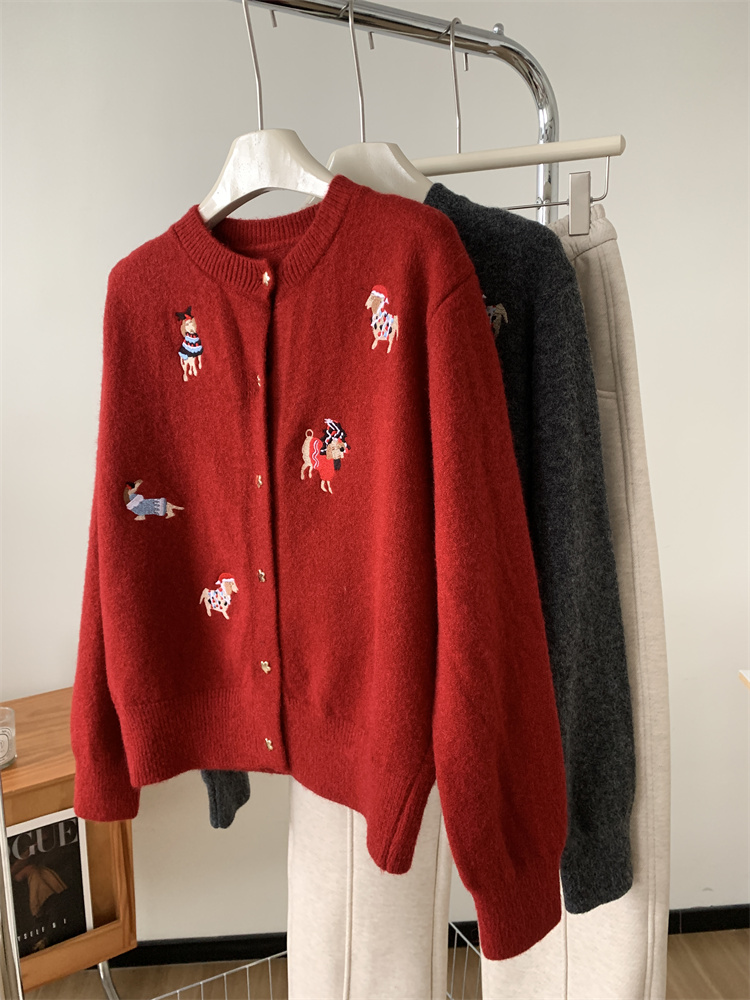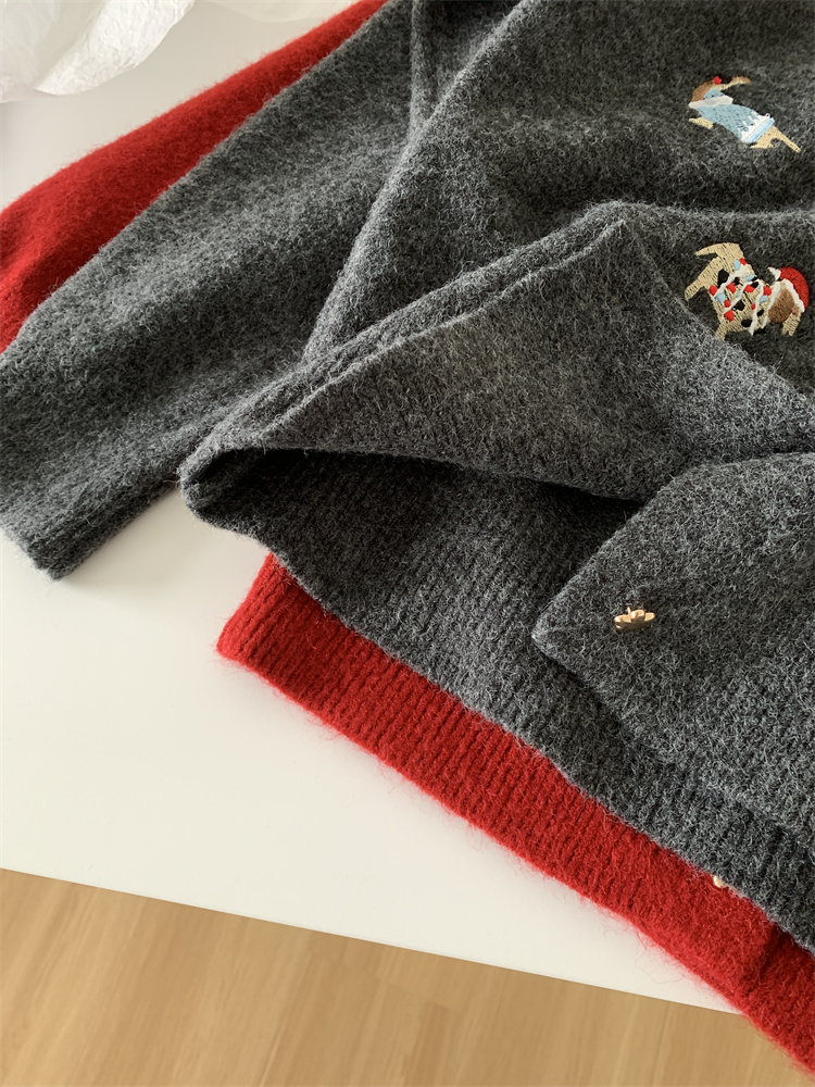 레트로 중공업 자수 크리스마스 빨간 강아지 니트 카디건 여성 디자인 오각형 버튼 스웨터 재킷 겨울스토어 가기