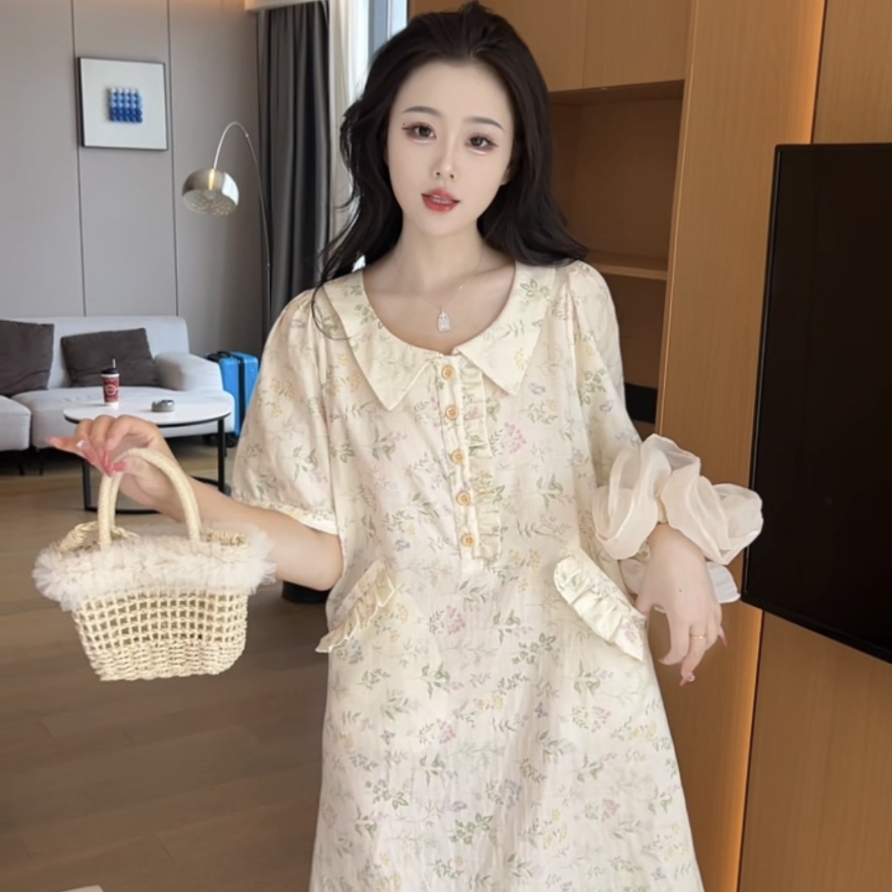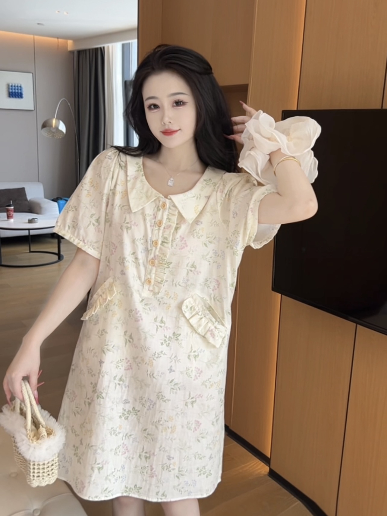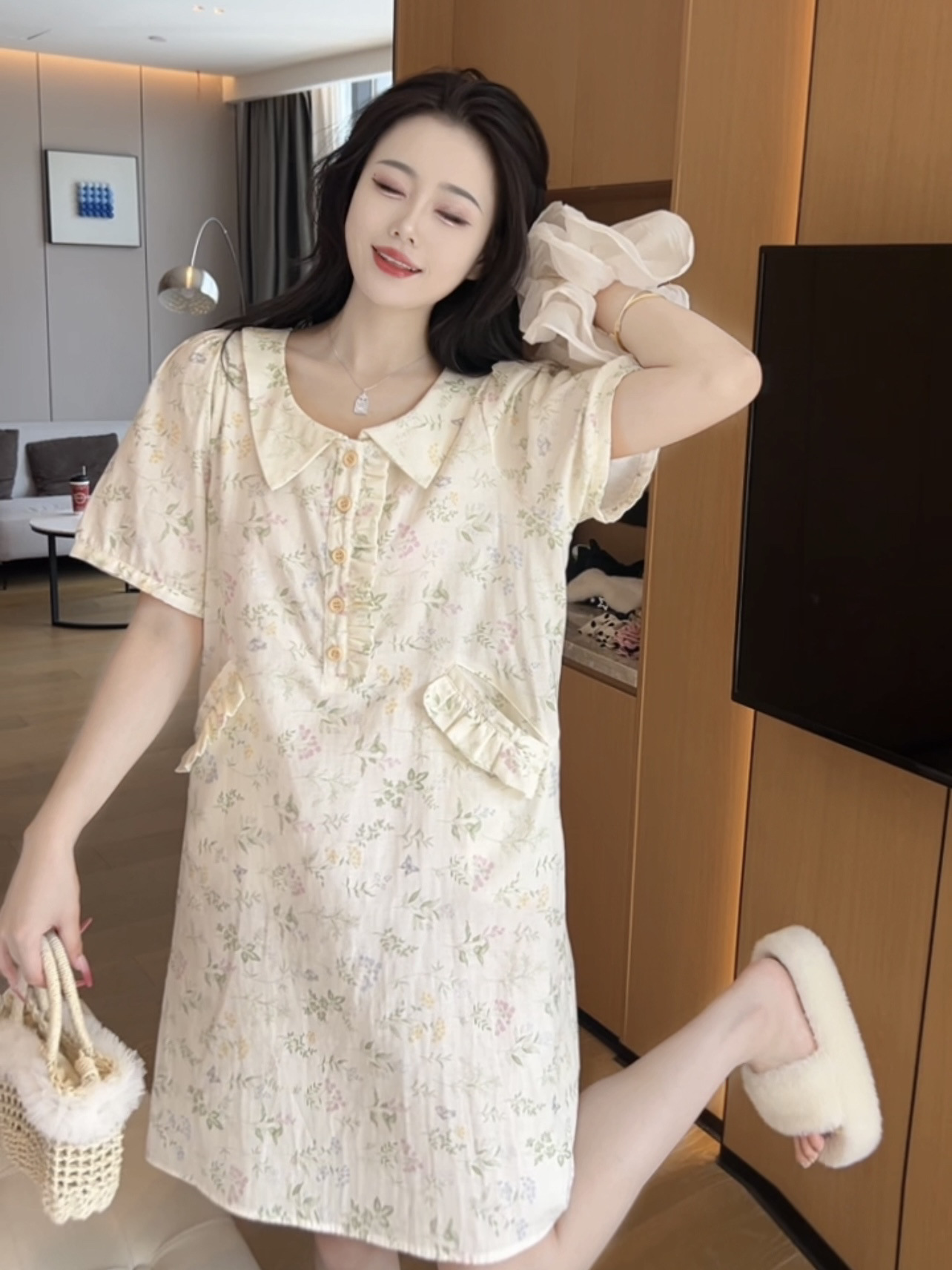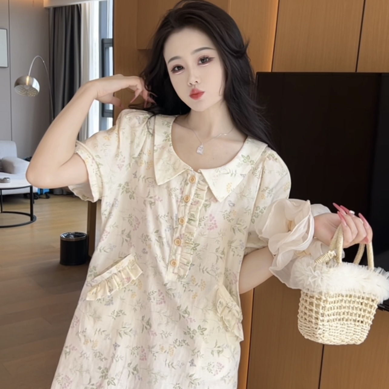 (그린리프) 여름 산뜻하고 귀여운 캐주얼 귀여운 반팔 잠옷 여성용 순면 중간 길이 포켓으로 밖에서 착용 가능