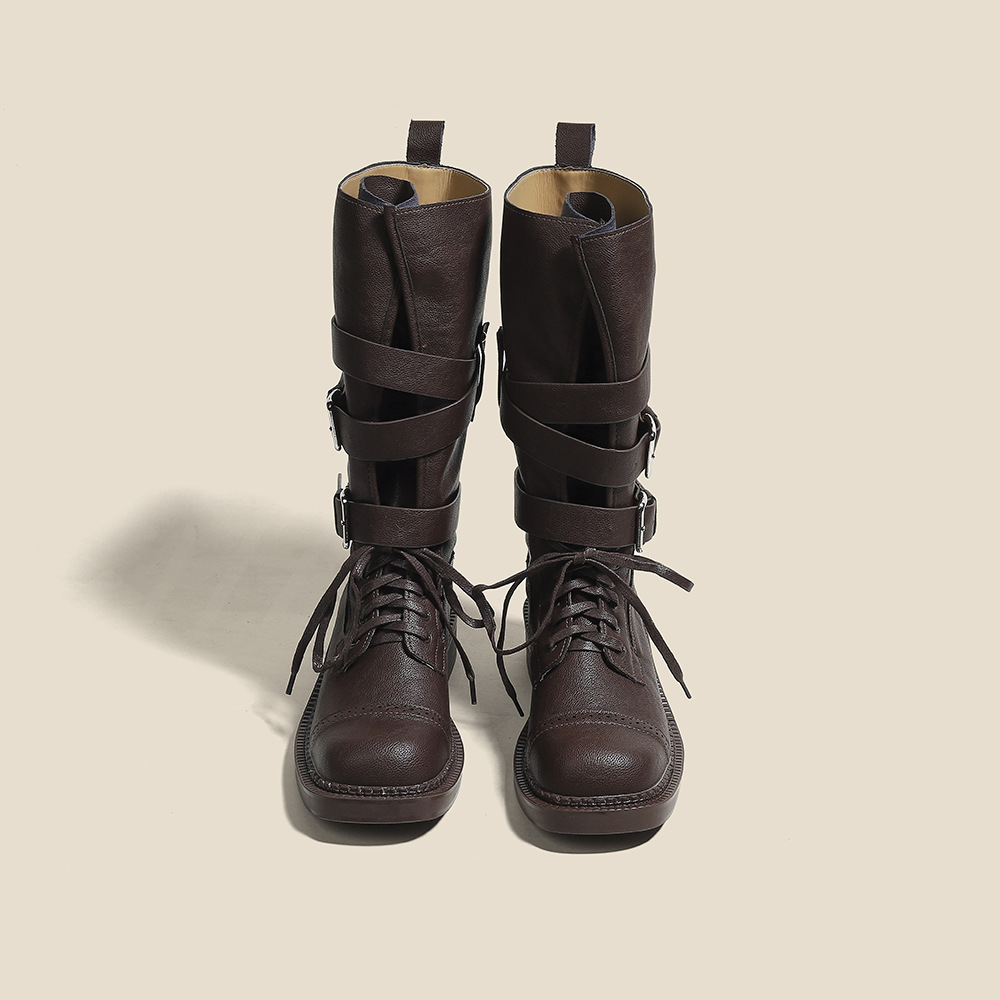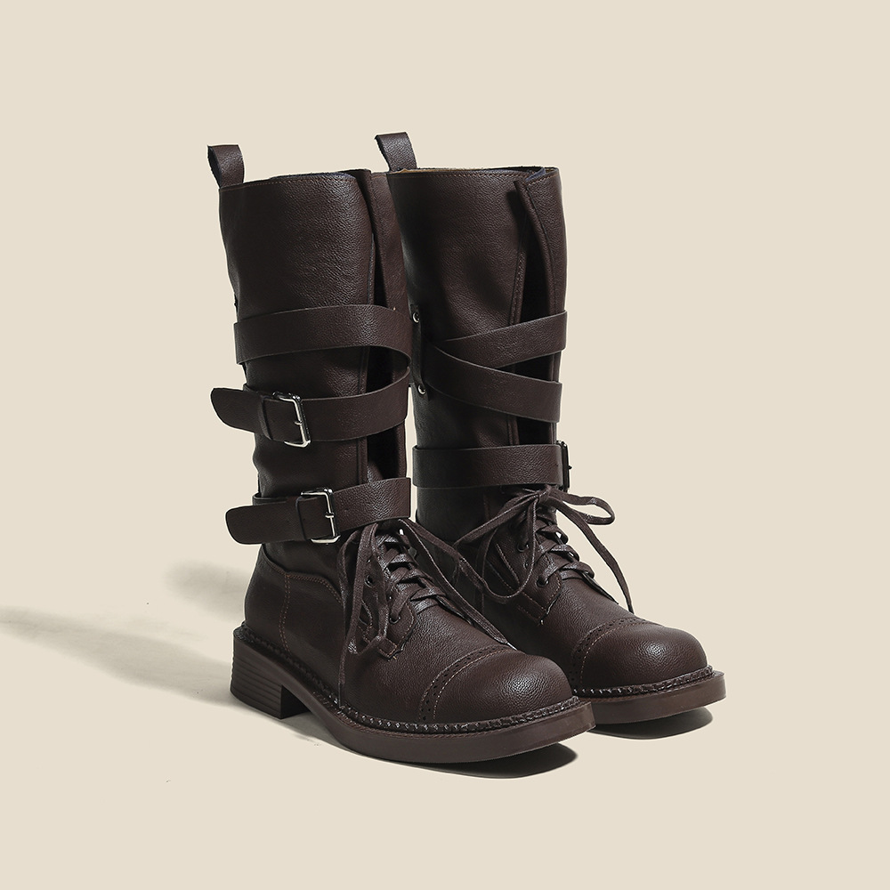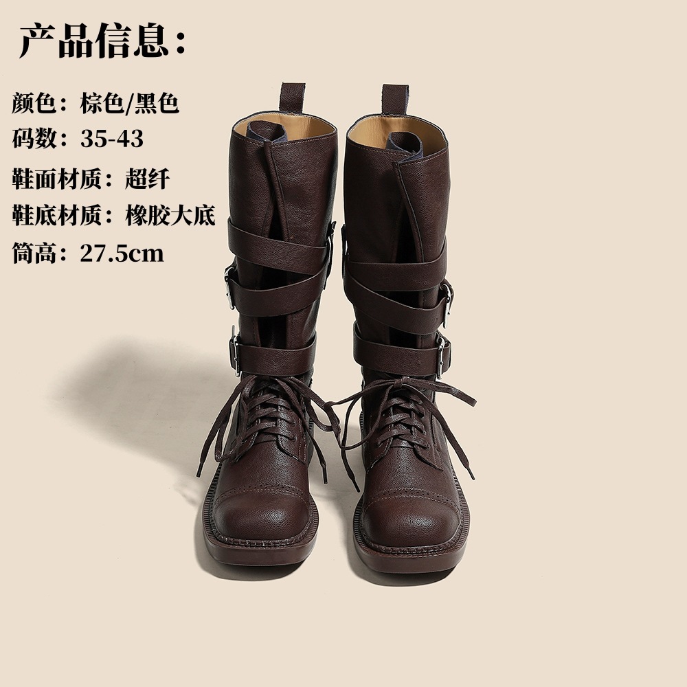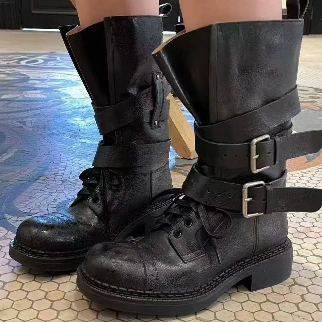 [재고 있음, 빠른 배송] 두꺼운 밑창 벨트 버클 쿨하고 멋진 여성용 오토바이 부츠, 중간 길이의 복고풍 영국 두꺼운 굽 스퀘어 토 마틴 부츠스토어 가기