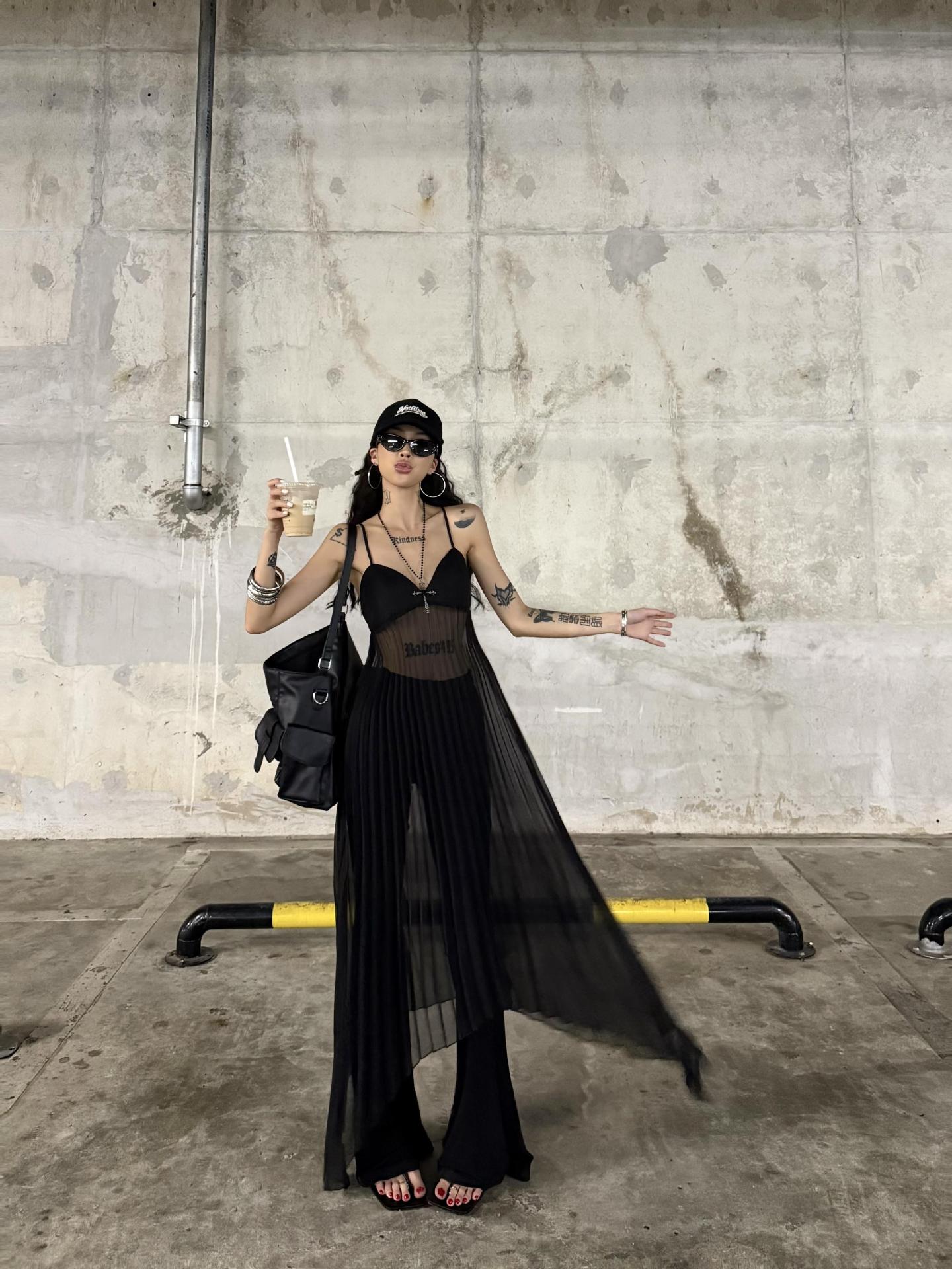 블랙 서스펜더 메쉬 스플 라이스 드레스 여성 여름 새로운 한국 스타일 스트리트 패션 다목적 플레어 바지 정장스토어 가기