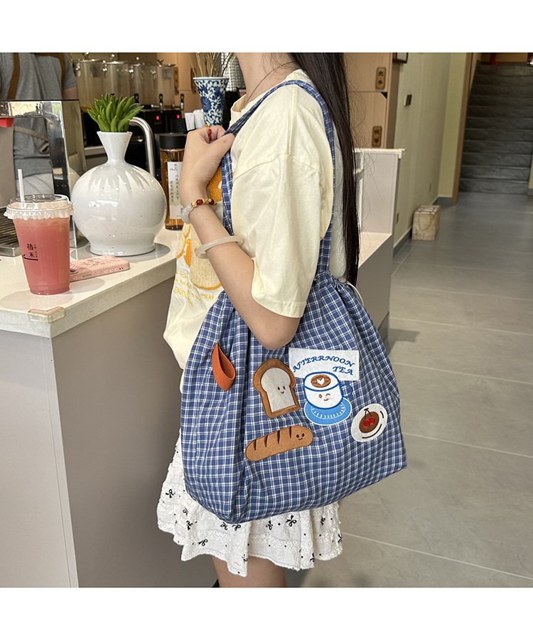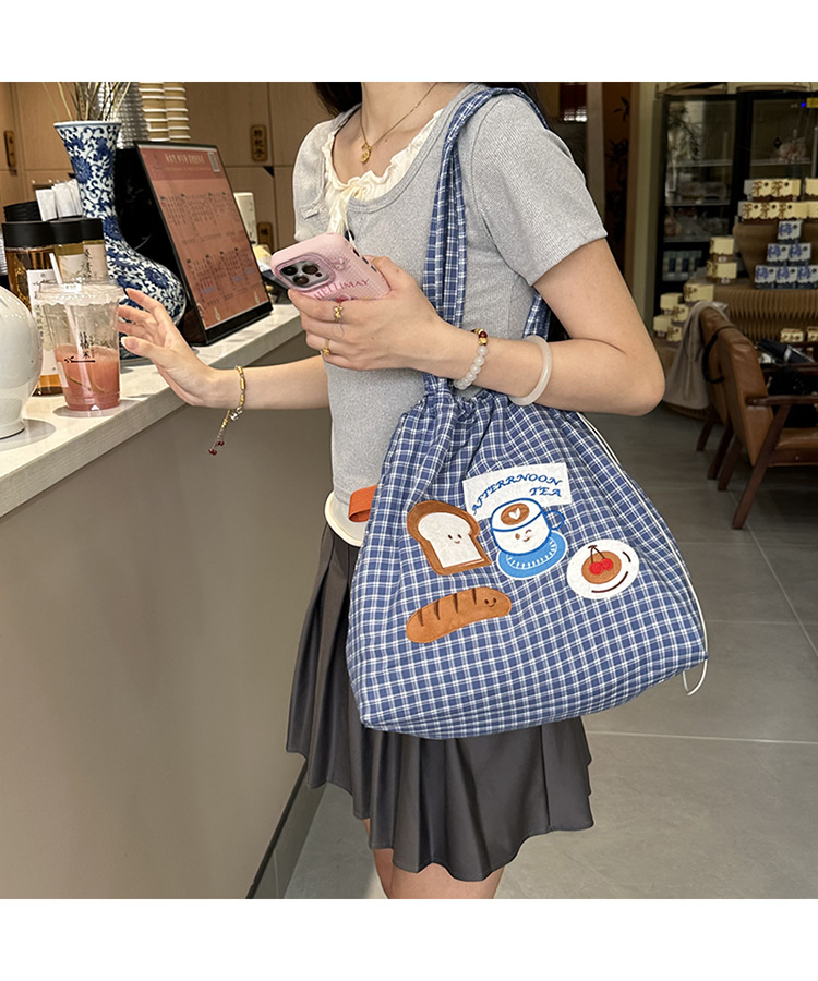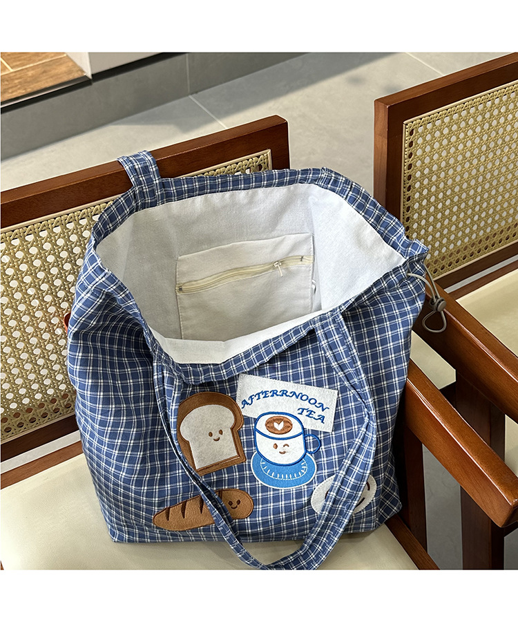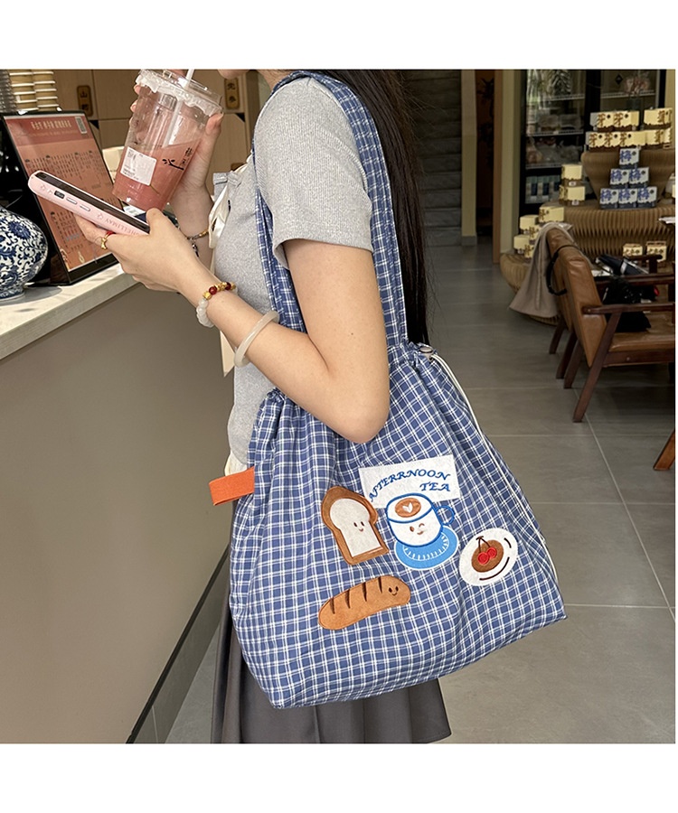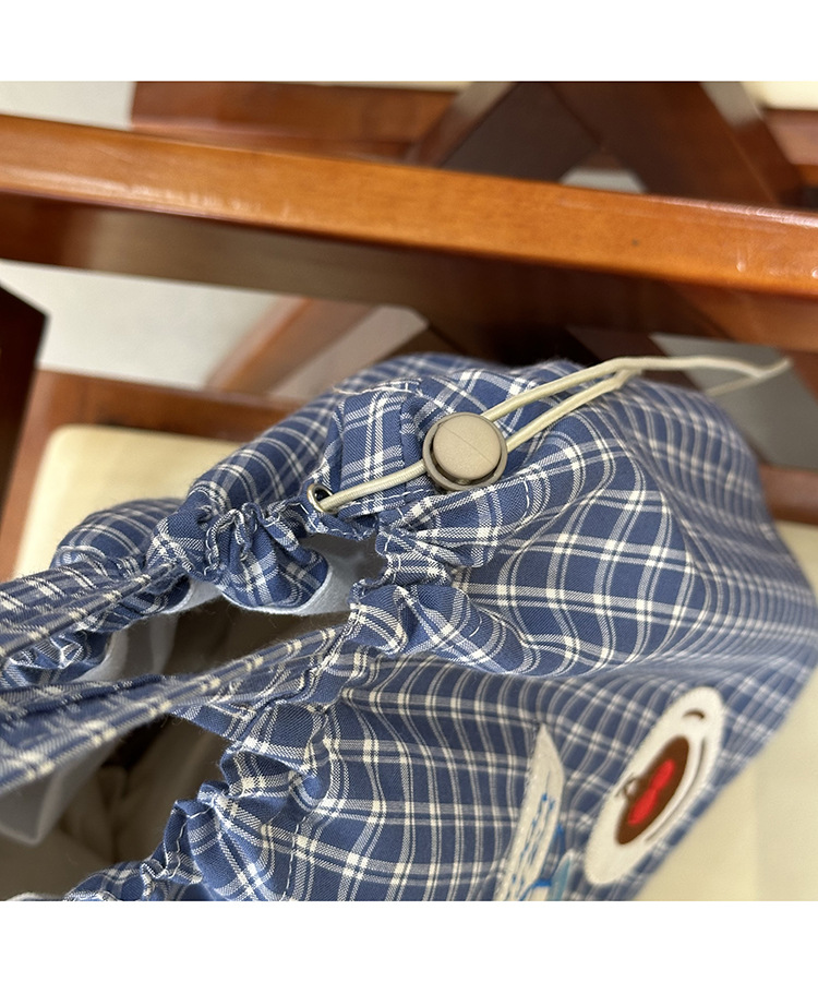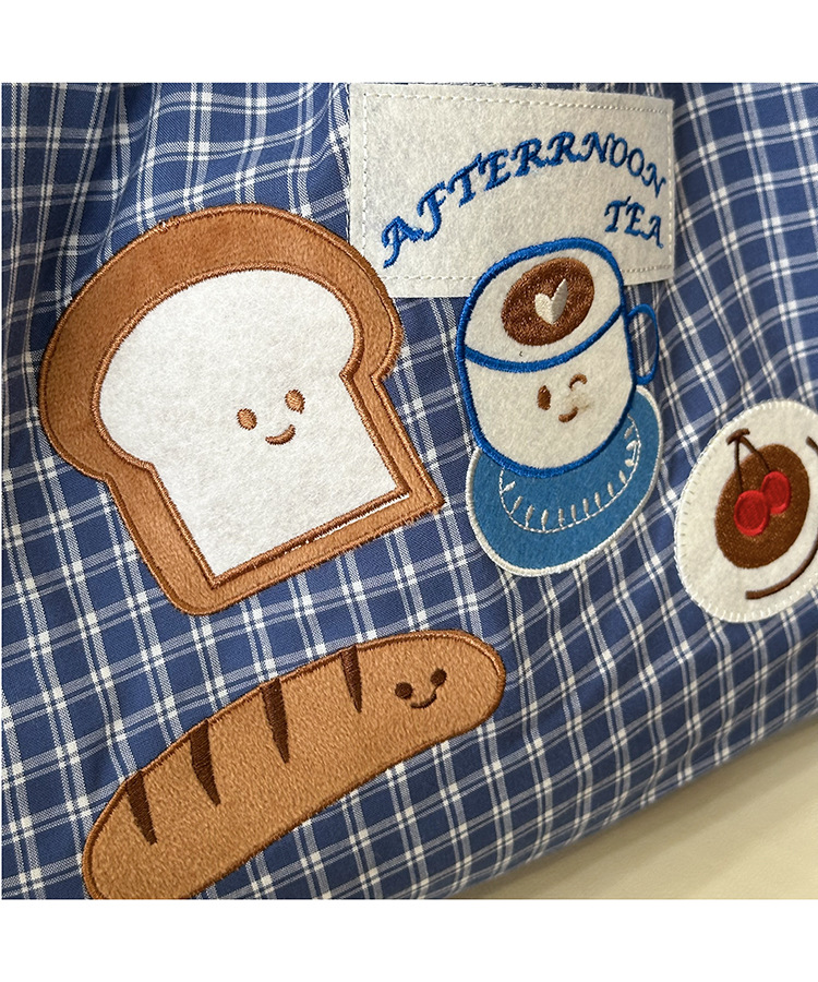 • 귀여운 수건 자수 조임끈 어깨 : 빵 커피 (블루 체크 무늬)