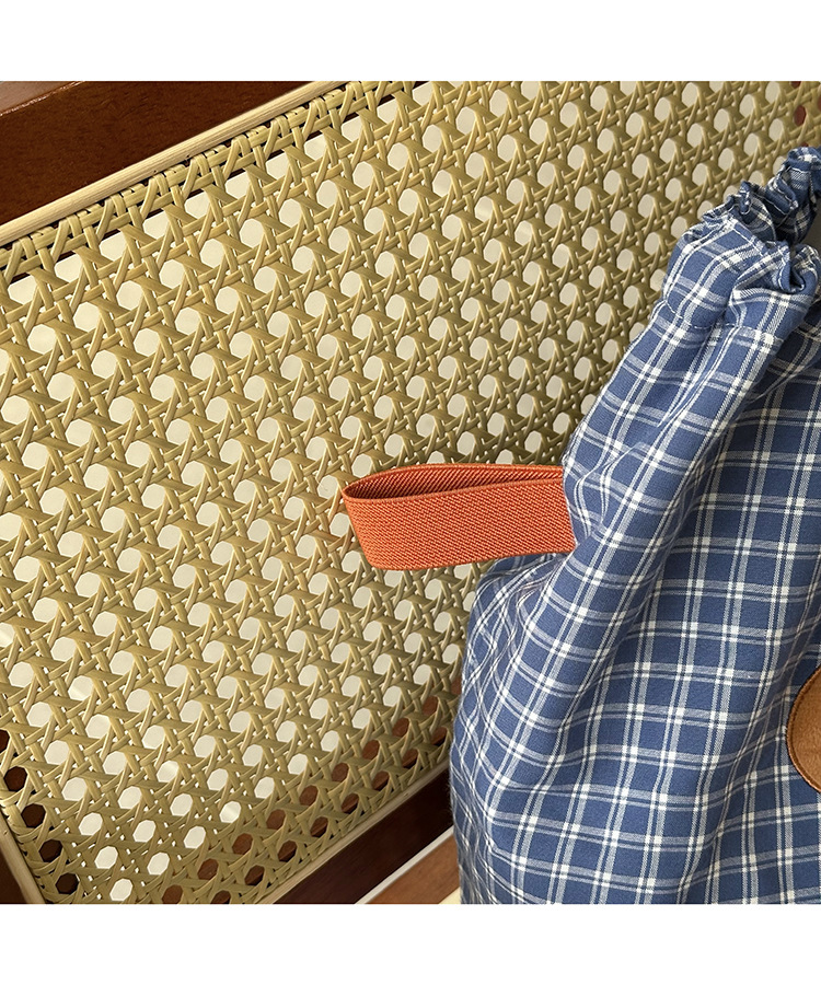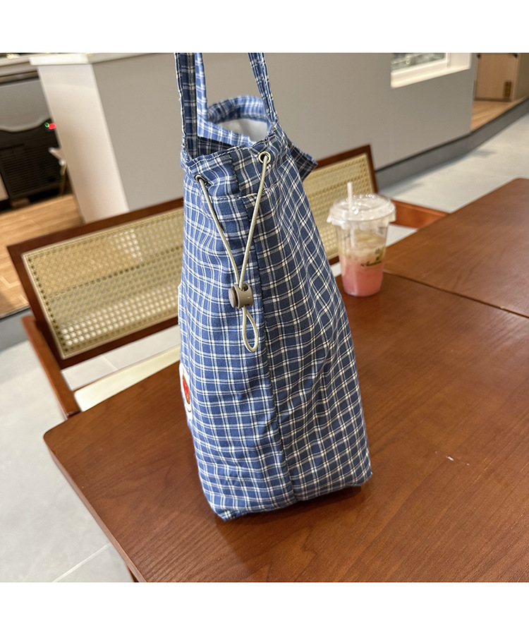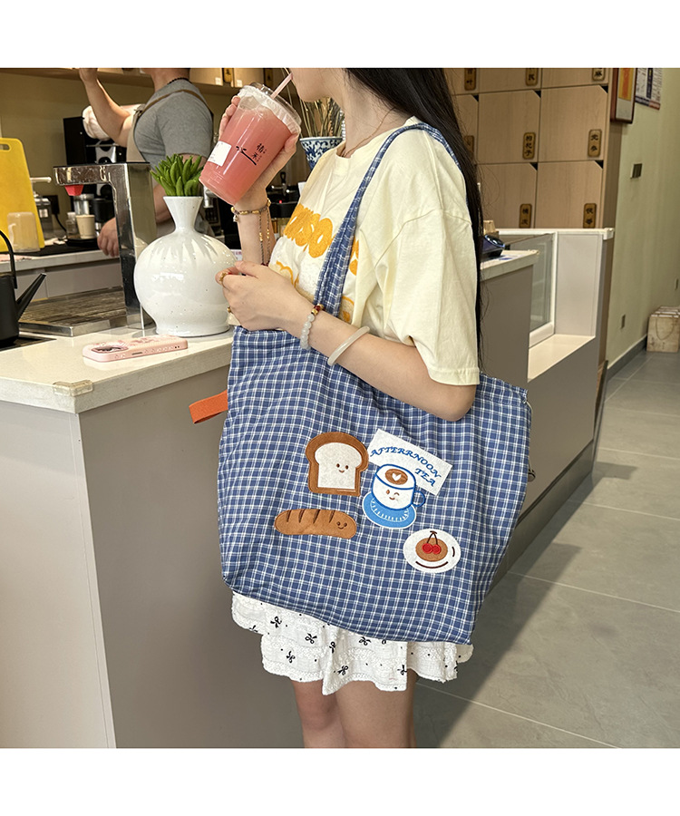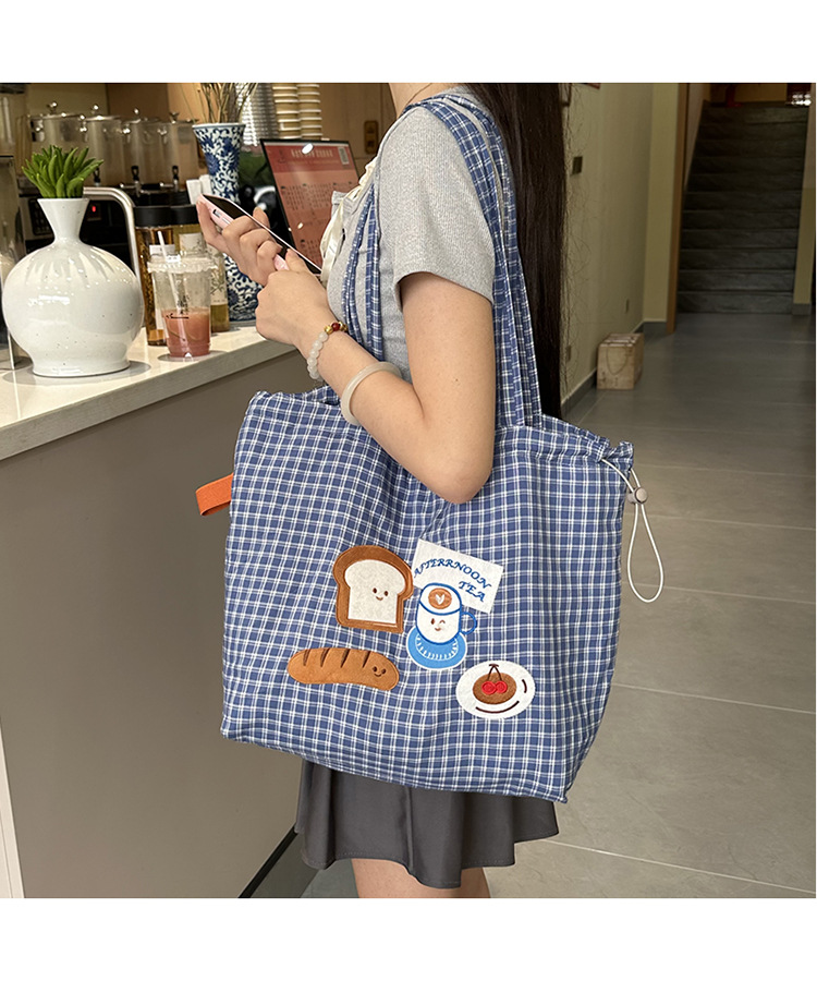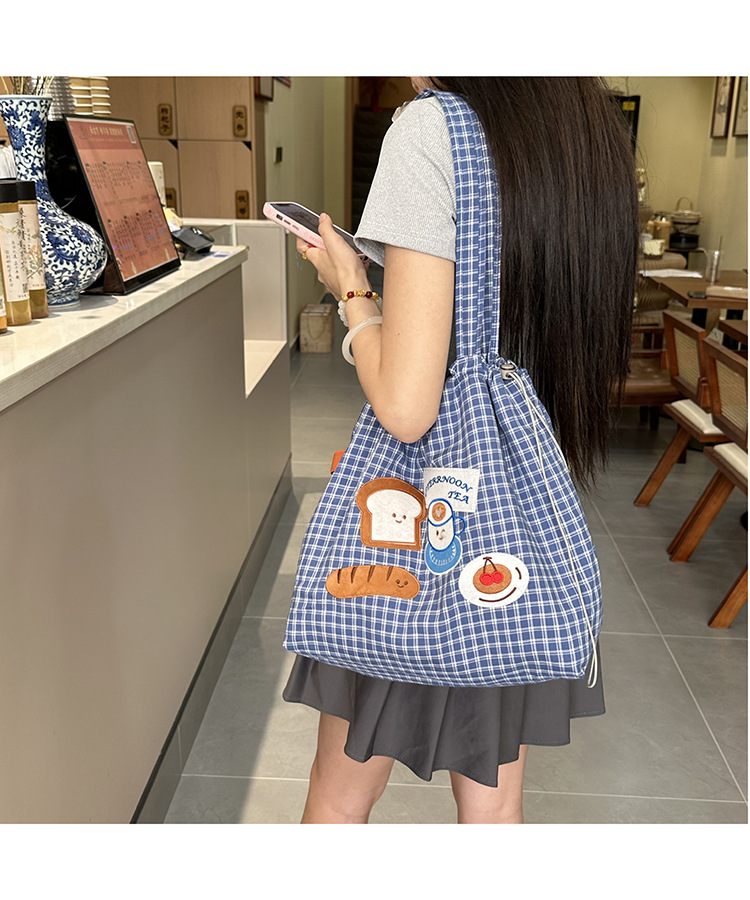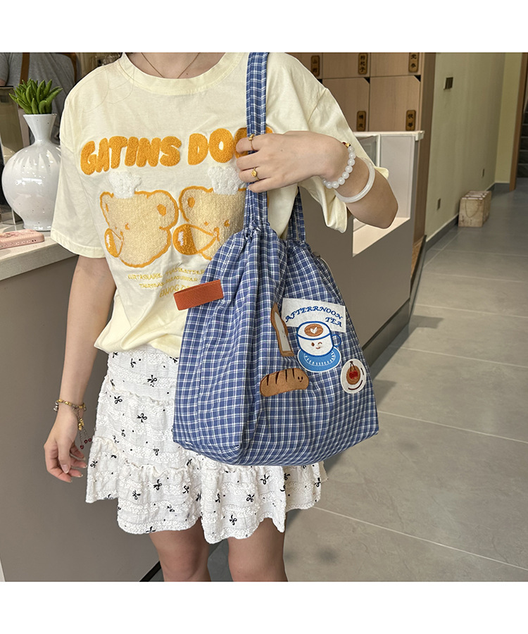 • 귀여운 수건 자수 조임끈 어깨 : 빵 커피 (블루 체크 무늬)