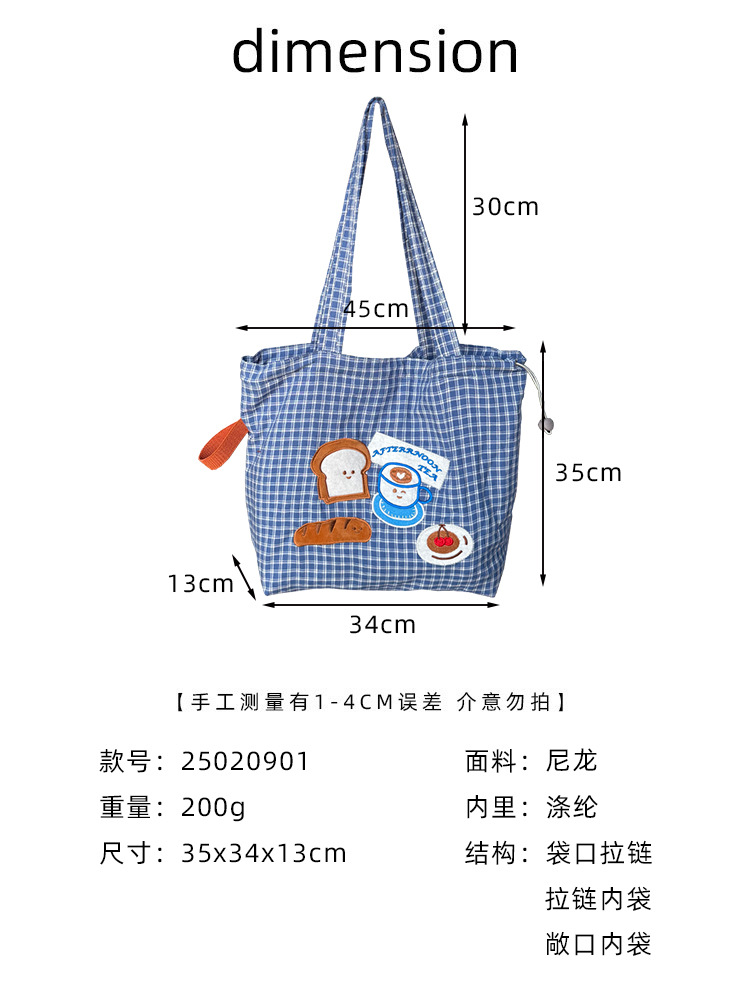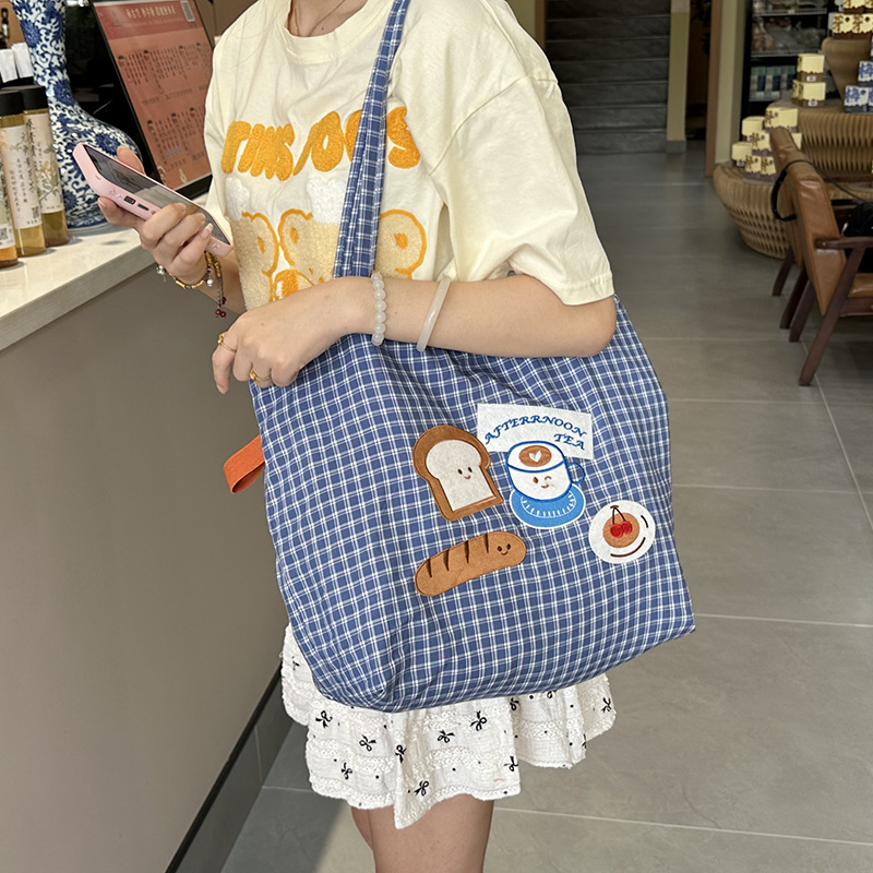 새로운 귀여운 강아지 캔버스 가방 캐주얼 대용량 격자 무늬 자수 일러스트 소녀 숄더백 통근 토트 백
