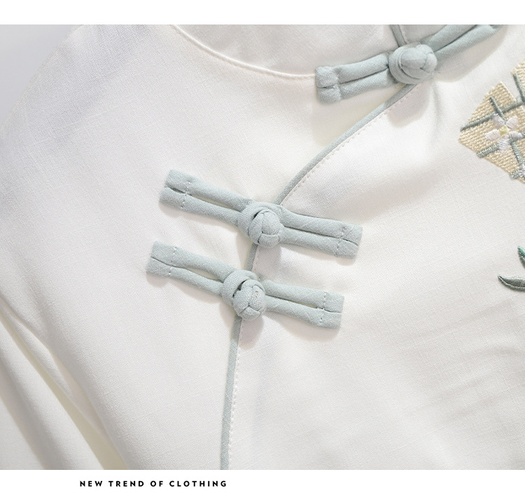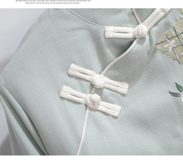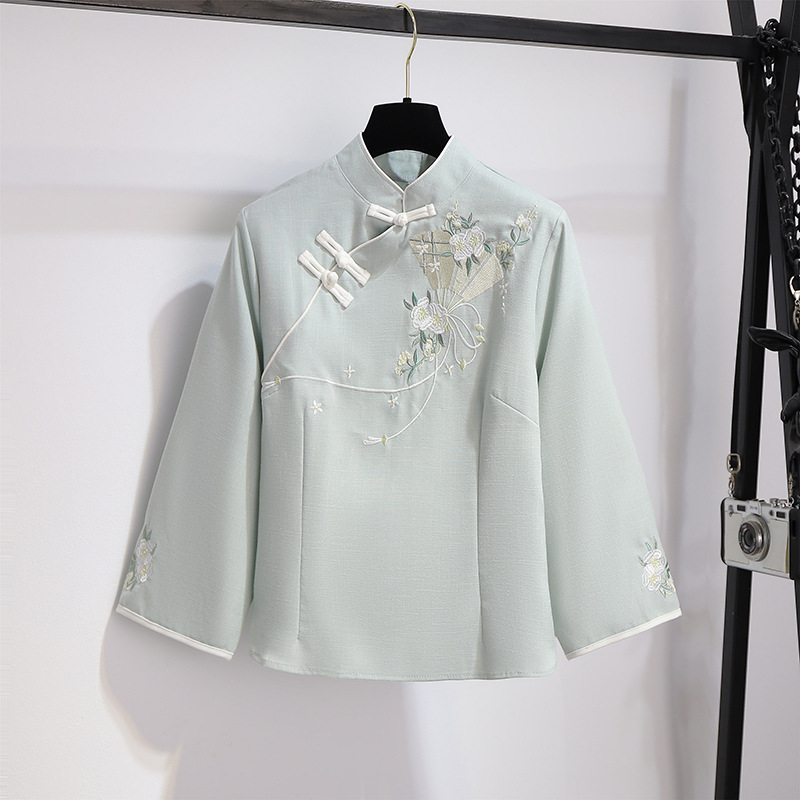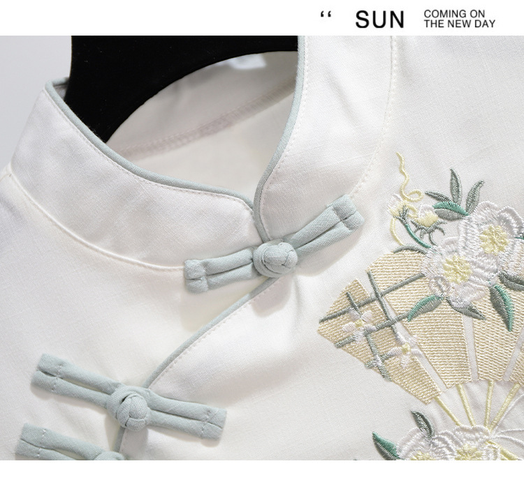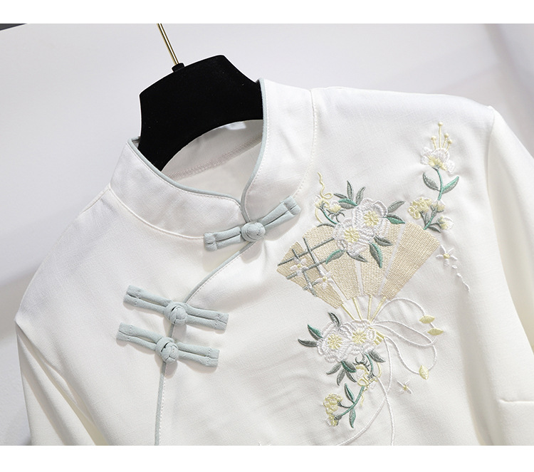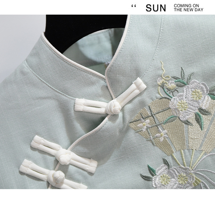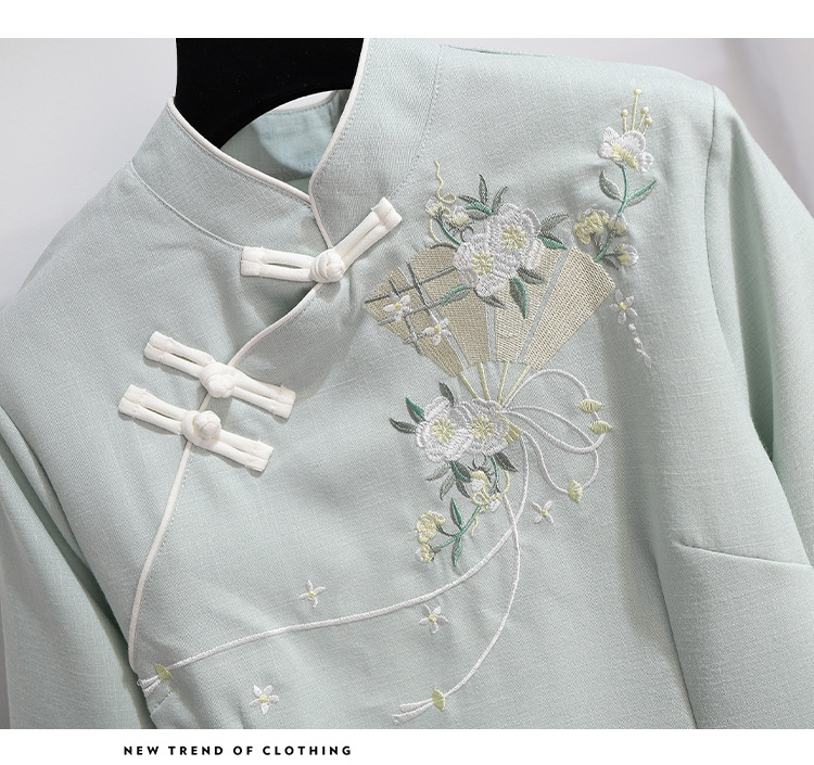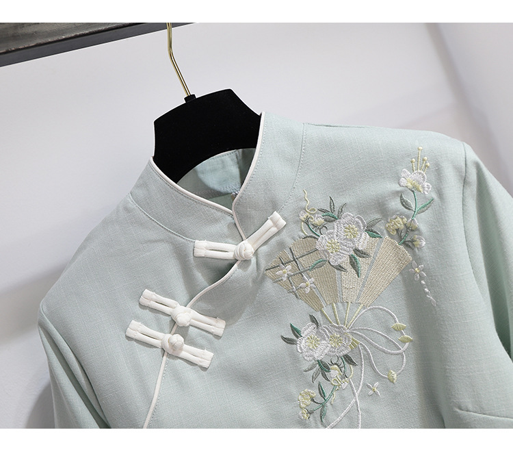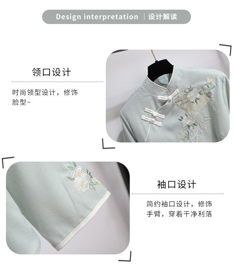 민족 스타일 여성 치파오 탑 당나라 양복 투피스 세트 가을, 여름 새로운 면 및 린넨 자수 한 요소 Hanfu 차 의류스토어 가기