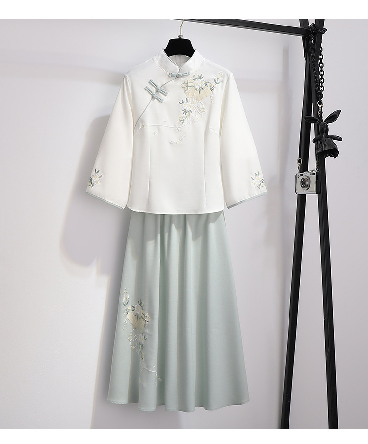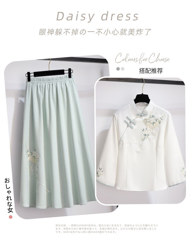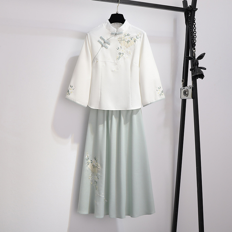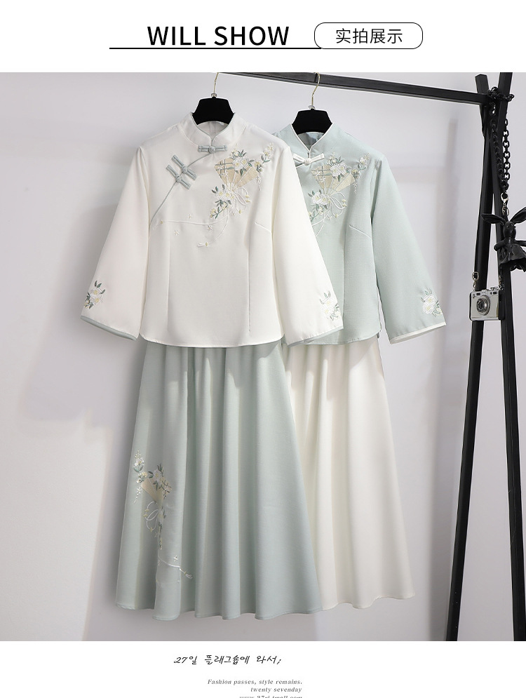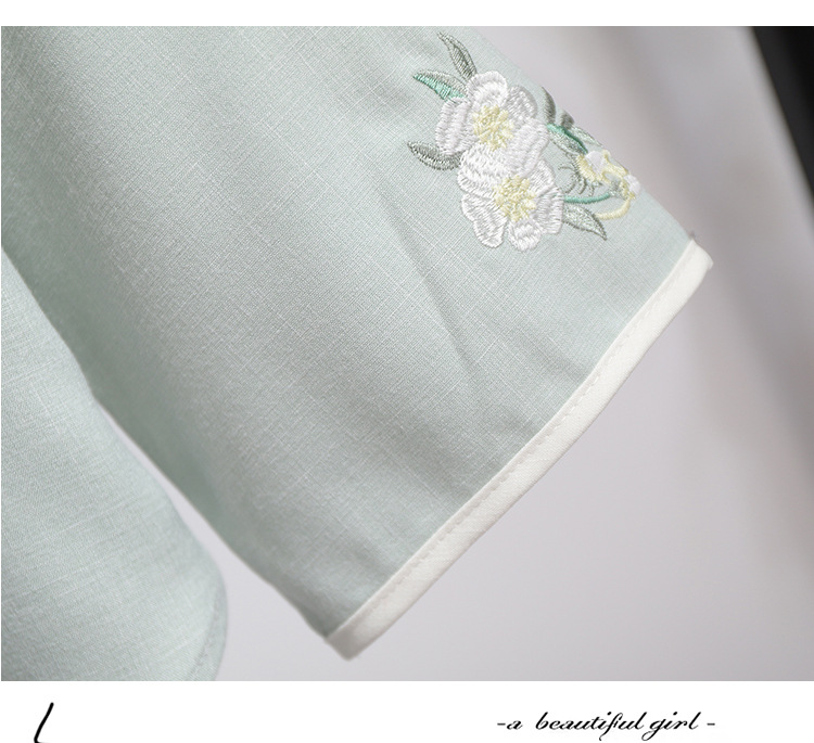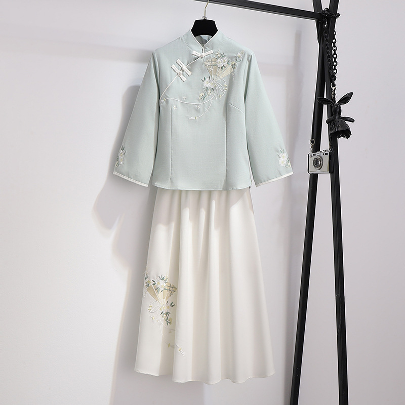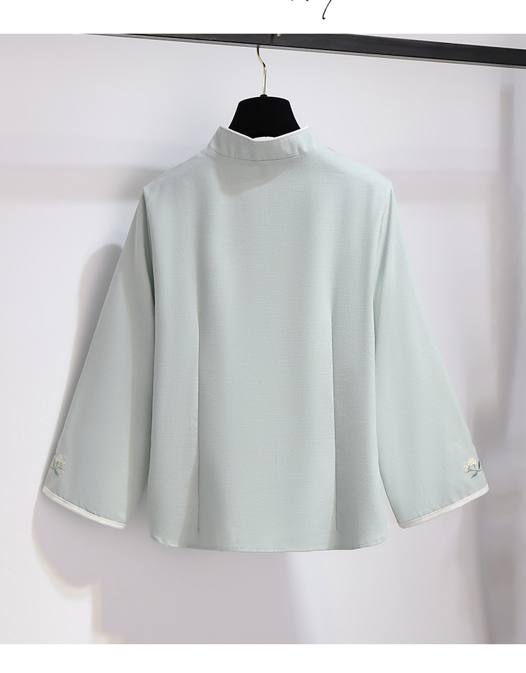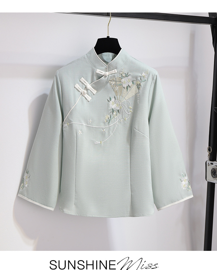 민족 스타일 여성 치파오 탑 당나라 양복 투피스 세트 가을, 여름 새로운 면 및 린넨 자수 한 요소 Hanfu 차 의류스토어 가기