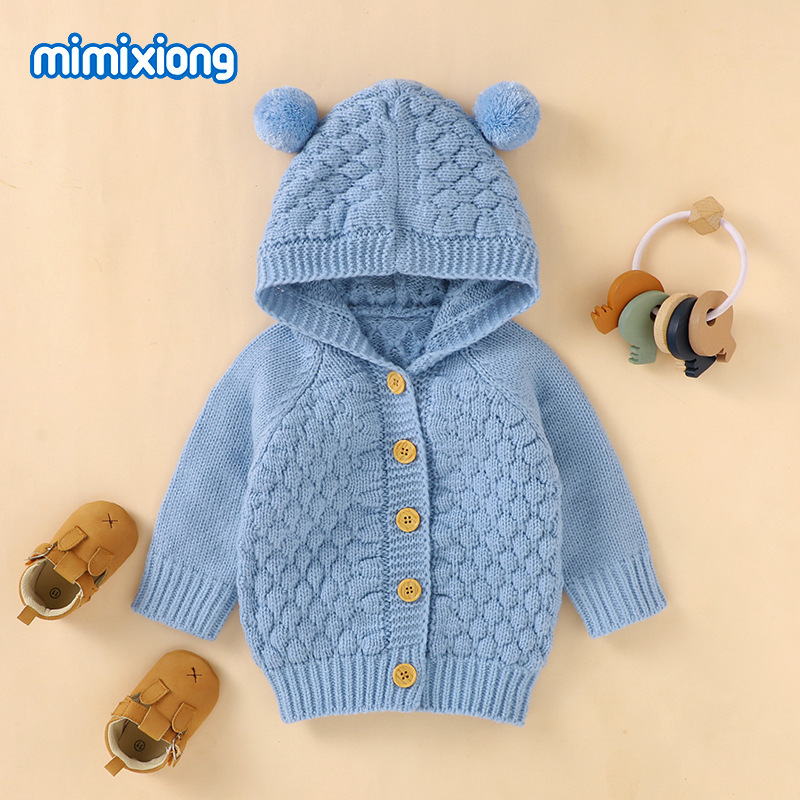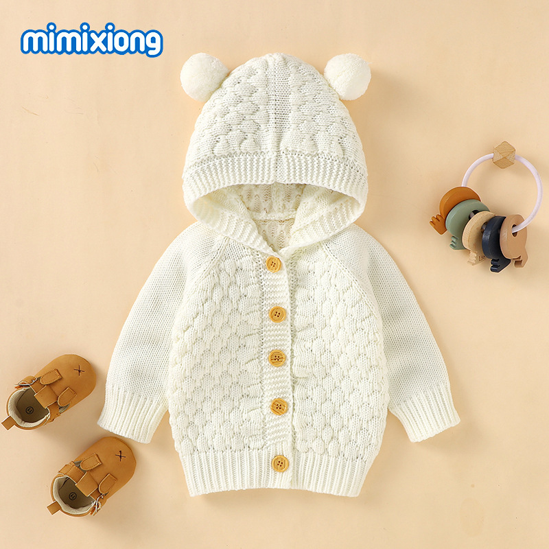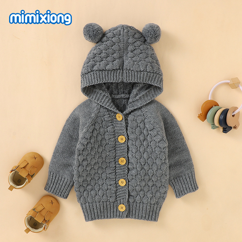 Ins 뜨거운 판매 어린이 단색 스웨터 입체 모피 볼 후드 니트 재킷스토어 가기