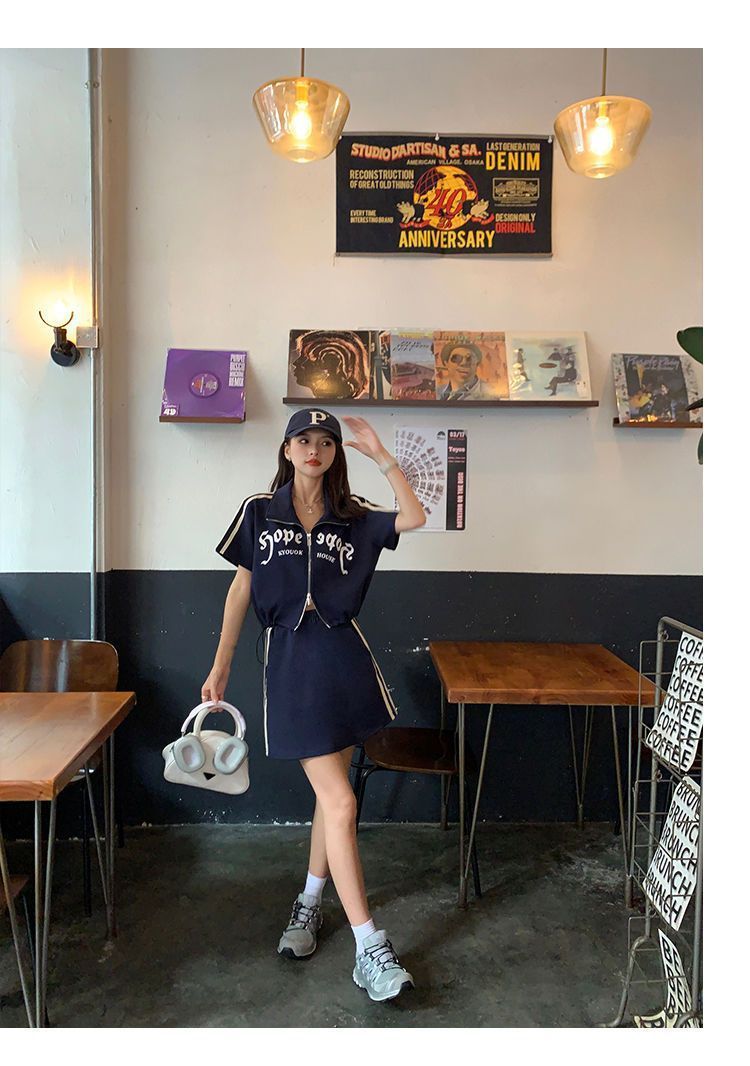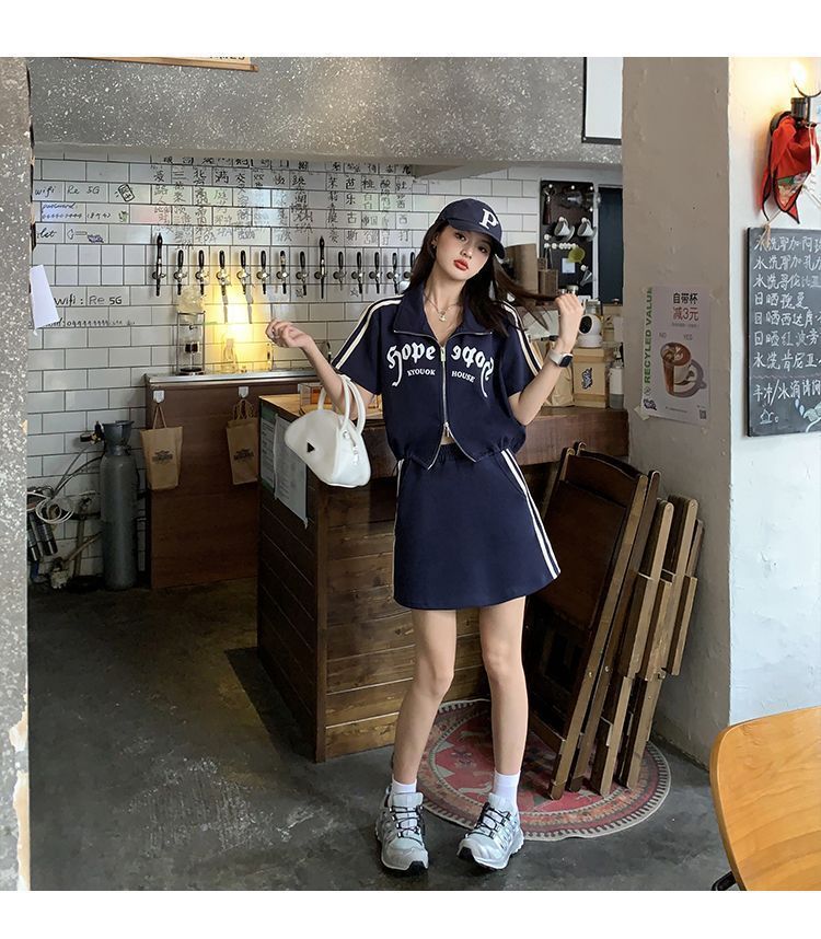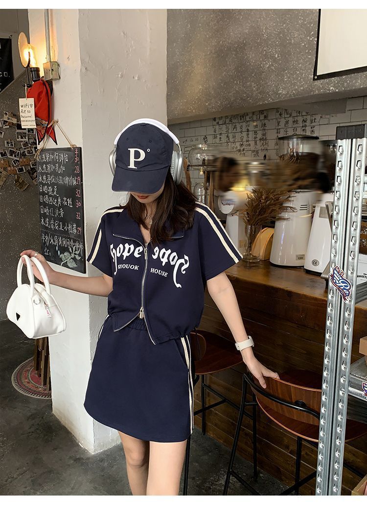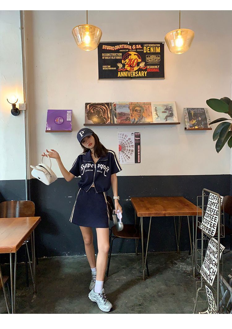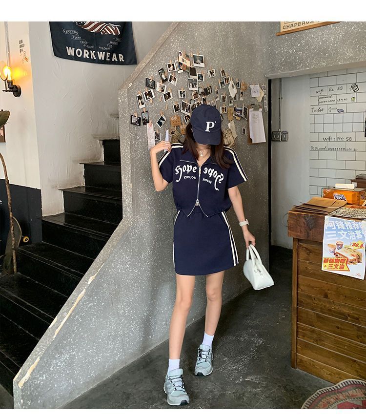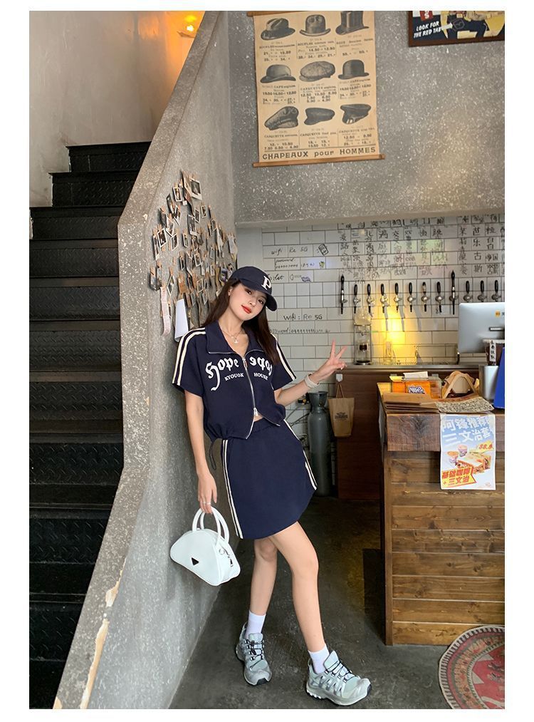 여름 한국 스타일 슬림핏 지퍼 스탠드 칼라 탑 하프 스커트 투피스 세트 여성용 패셔너블 캐주얼 스포츠 스타일 슈트스토어 가기