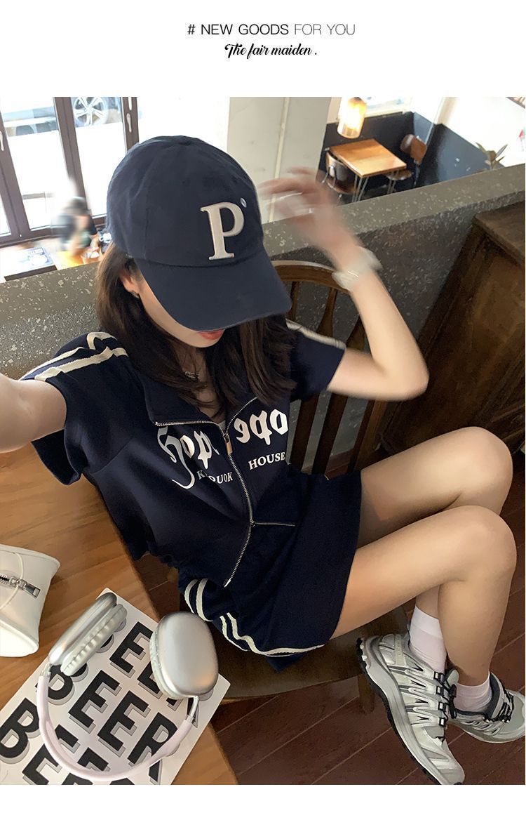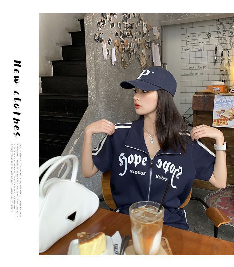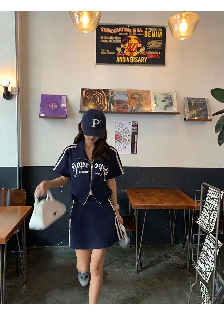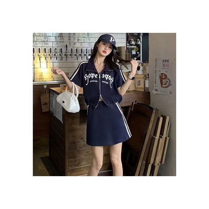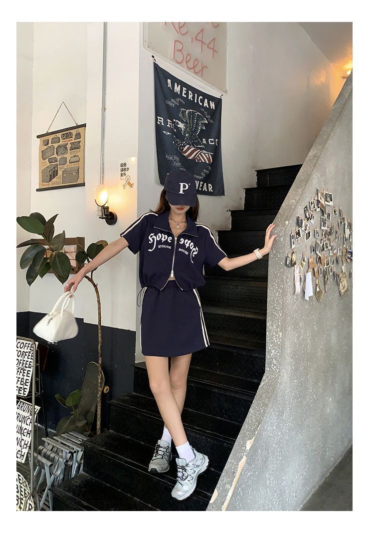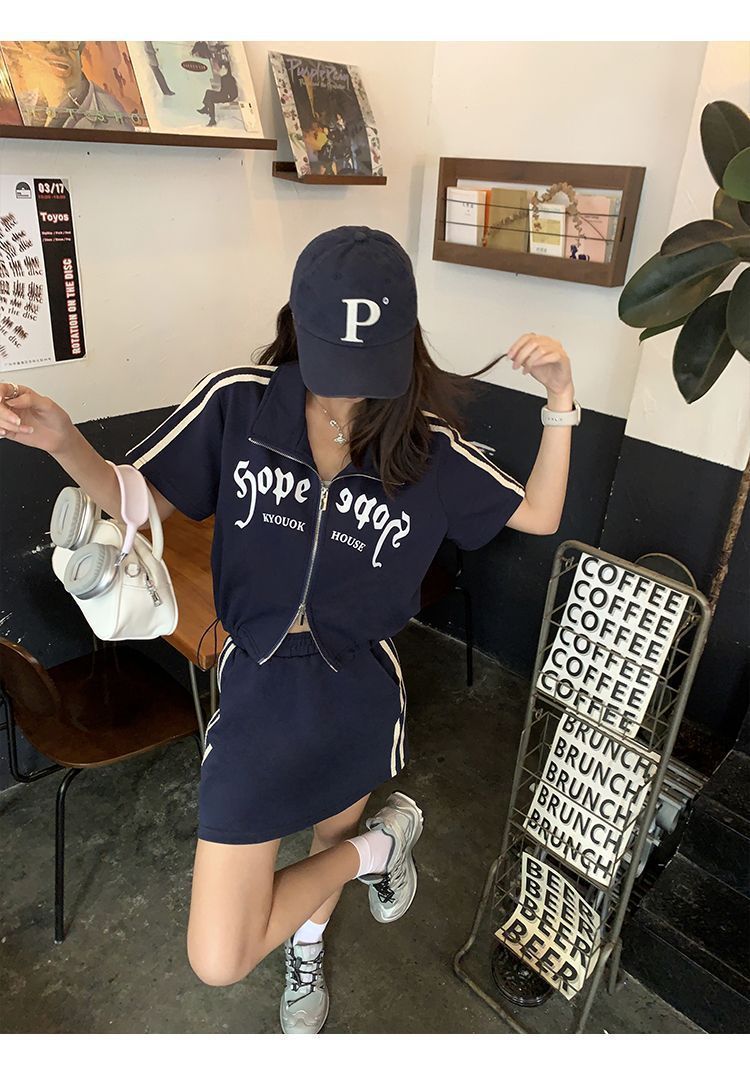 여름 한국 스타일 슬림핏 지퍼 스탠드 칼라 탑 하프 스커트 투피스 세트 여성용 패셔너블 캐주얼 스포츠 스타일 슈트스토어 가기